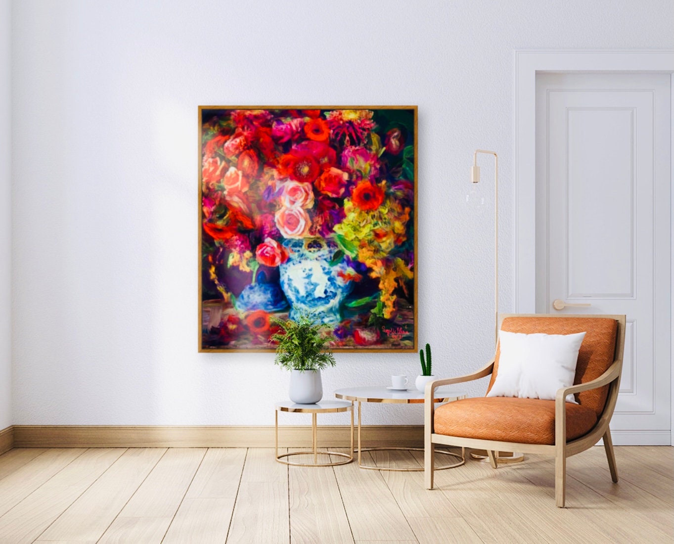 PLEASE NOTE SIZES ARE IN CM. A large oil painting of autumn flowers in a blue and white chinoiserie ginger jar. Signed on the front and on the back. UV varnished. Ready to ship, recent work. Ships in a tube.