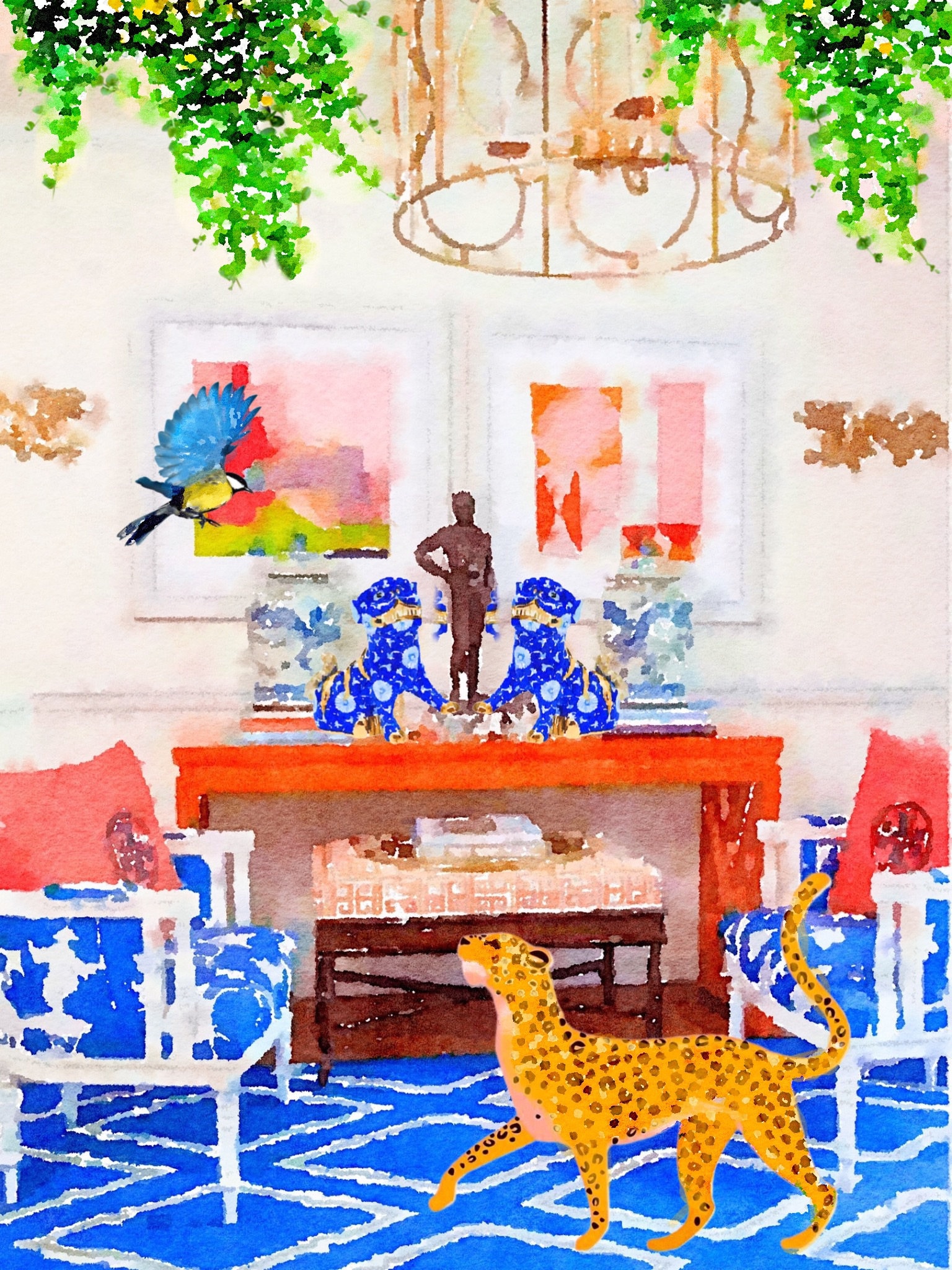 Grandmillennial artPreppy fine art print with cheetah in orange interior