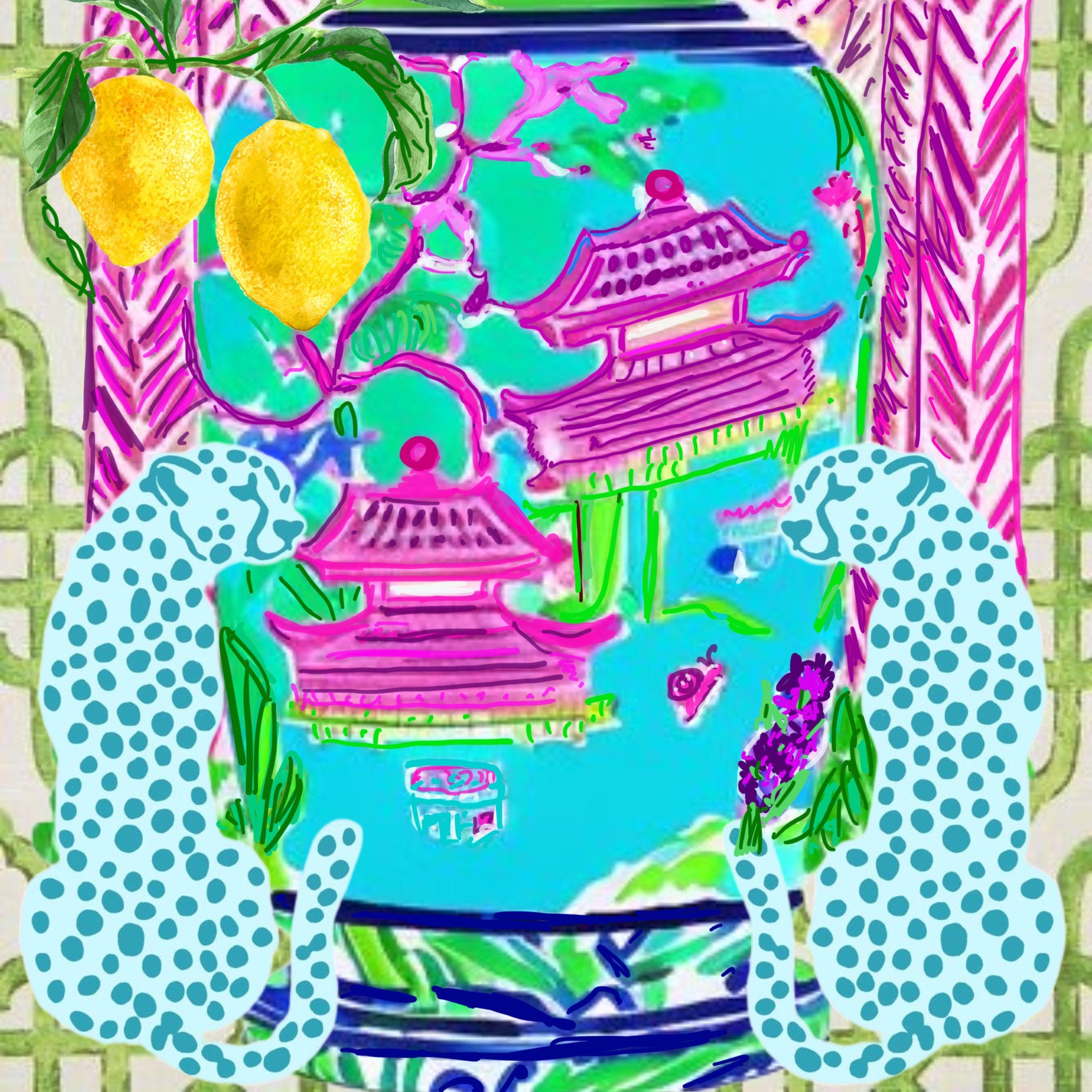Sophie's art is the modern interpretation of Chinese artistic traditions featuring pagodas, landscapes, blue and white porcelain, ginger jars, pagodas, cheetahs and monkeys. Sophie developed her own recognizable style with bright colors and whimsical details.