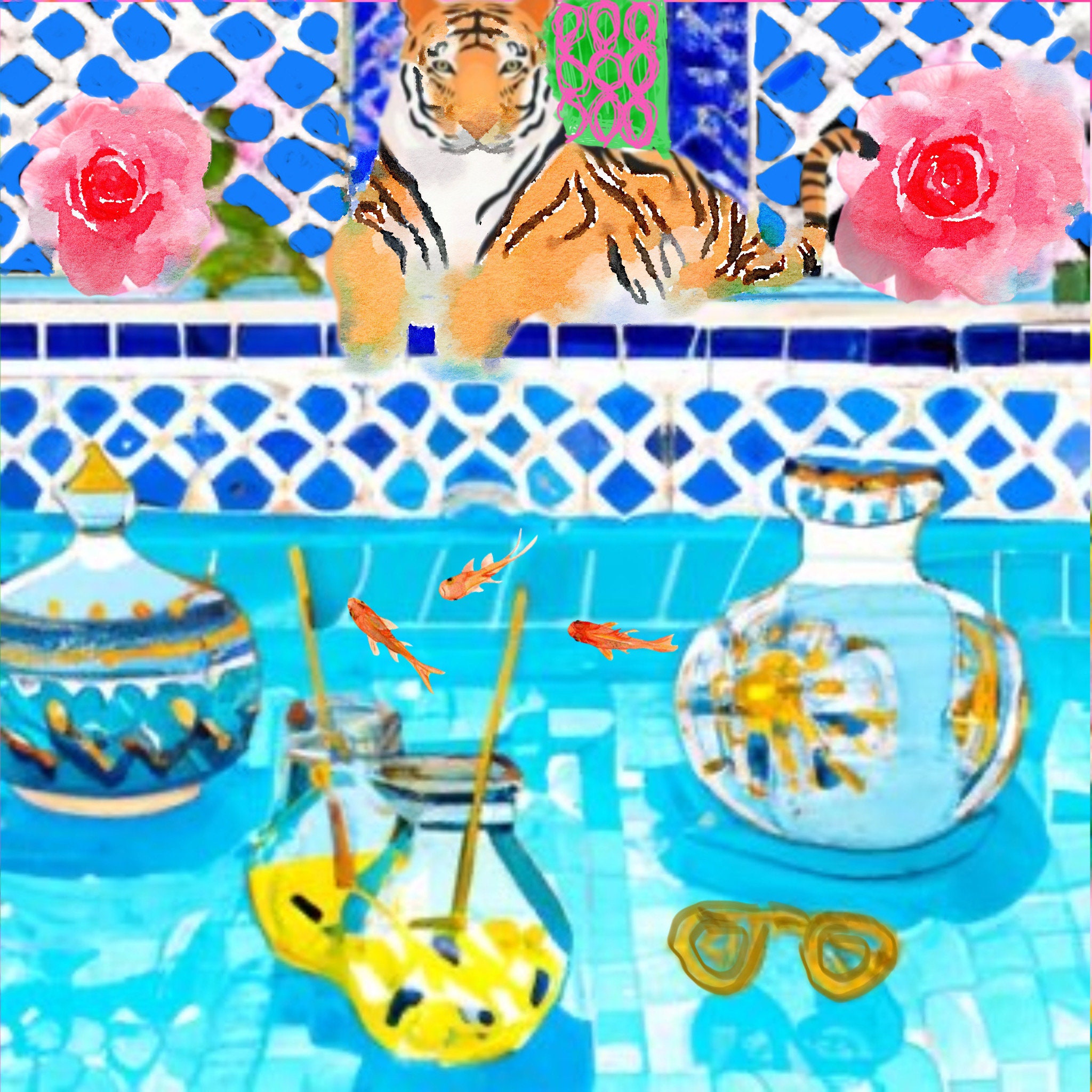 Grandmillennial art, Whimsical tiger in Moroccan swimming pool 2