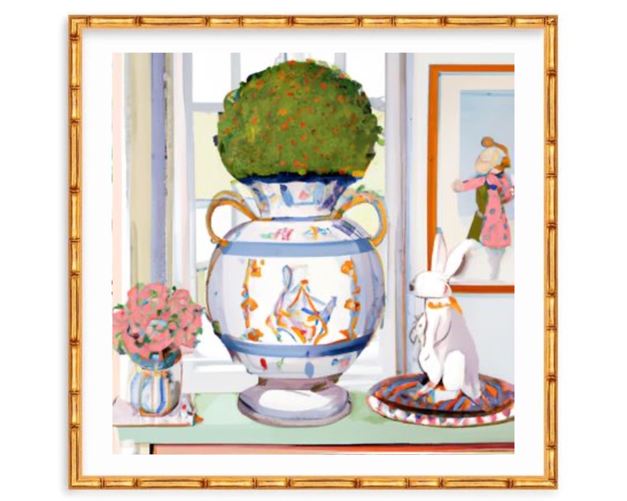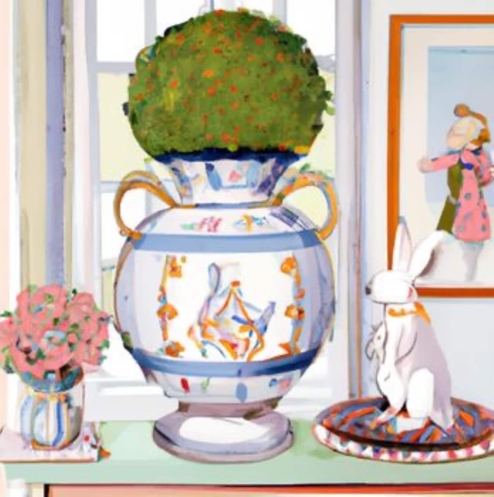 Ginger jar painting, preppy interior with modern chinoiserie jars and bunny rabbit