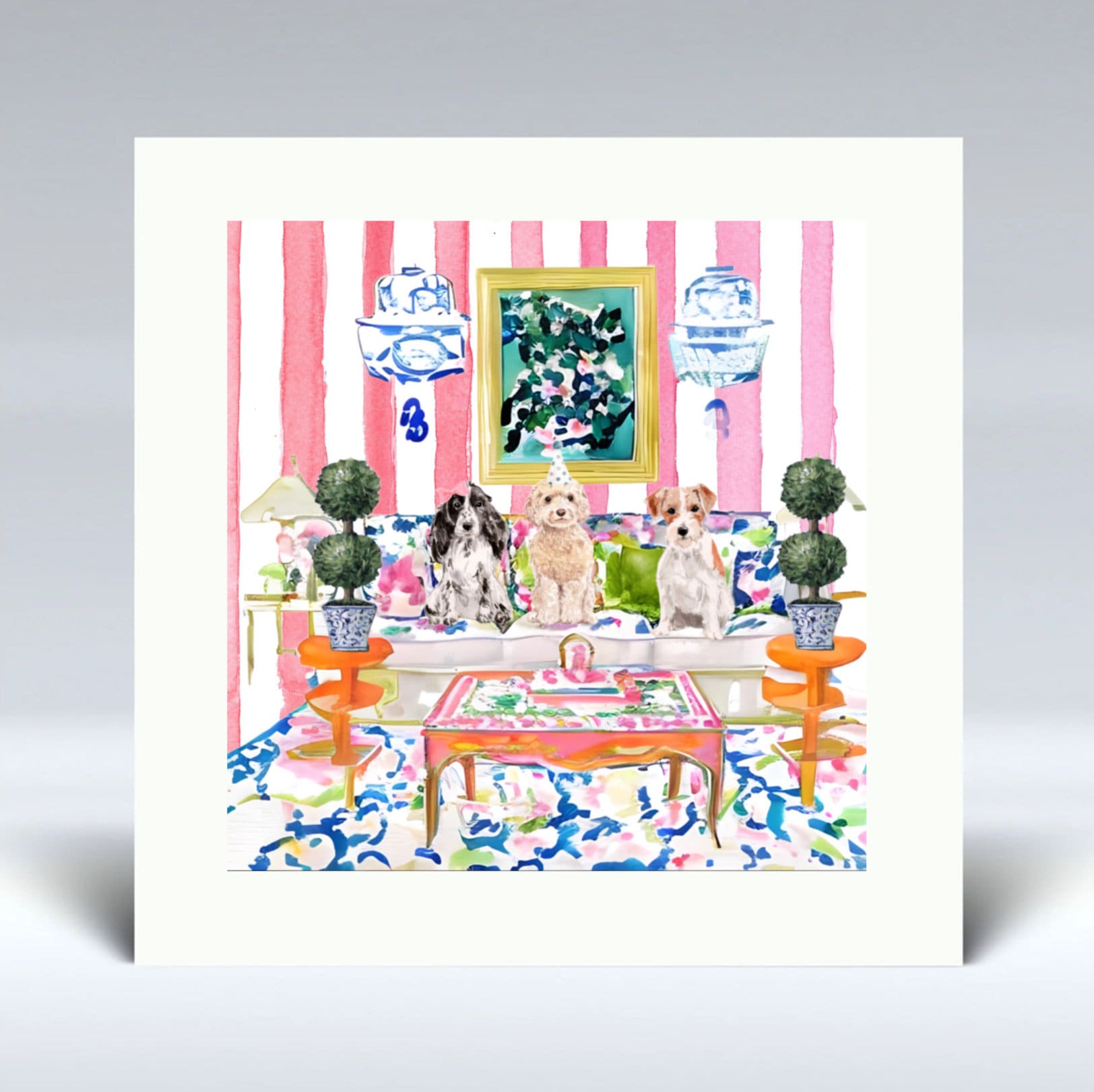Grandmillennial art, Three dogs in preppy interior watercolor, mounted fine art print