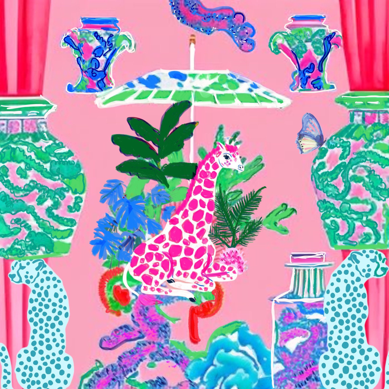 Grandmillennial art, Instant download Pink giraffe under green umbrella, preppy chinoiserie watercolor and markers