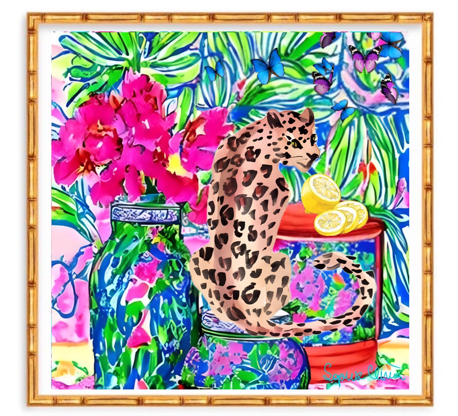 Sophie's art is the modern interpretation of Chinese artistic traditions featuring pagodas, landscapes, blue and white porcelain, ginger jars, pagodas, cheetahs and monkeys. Sophie developed her own recognizable style with bright colors and whimsical details.