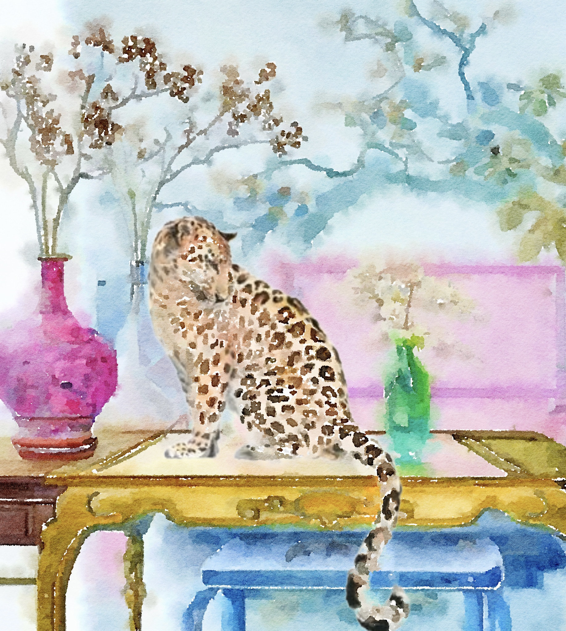 Cheetah in pastel chinoiserie interior, Giclee art print