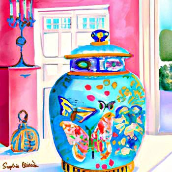 Sophie's art is the modern interpretation of Chinese artistic traditions featuring pagodas, landscapes, blue and white porcelain, ginger jars, pagodas, cheetahs and monkeys. Sophie developed her own recognizable style with bright colors and whimsical details.