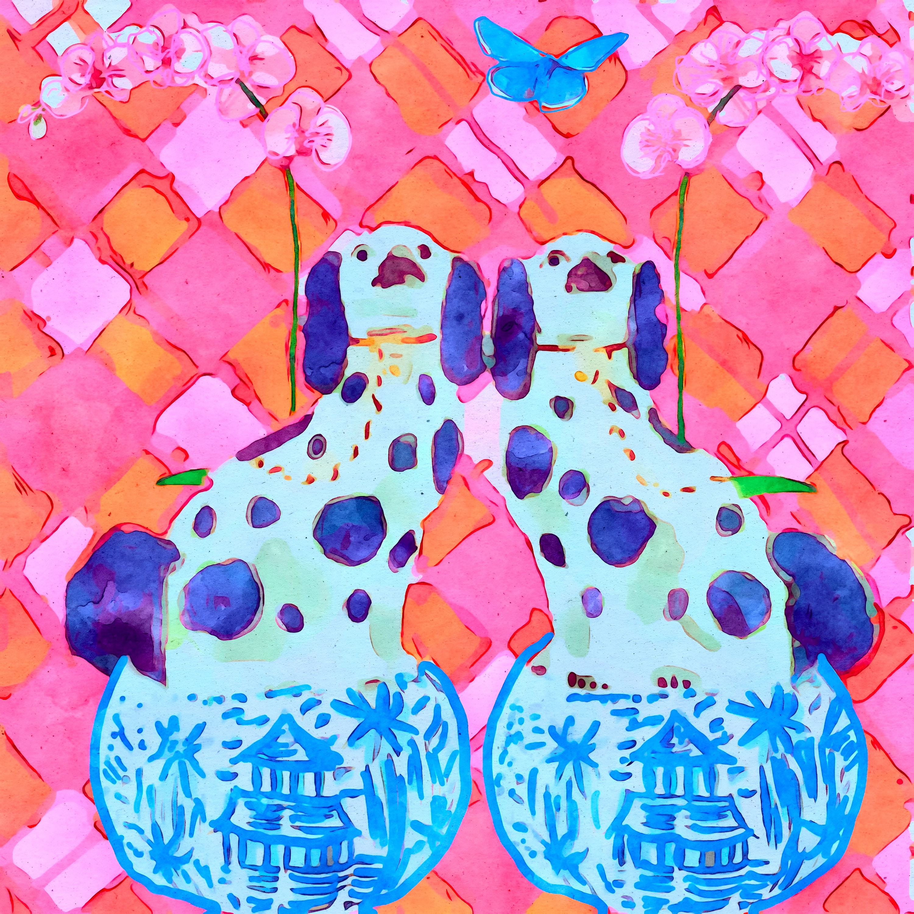 Grandmillennial art, Unique modern chinoiserie print with orchids and Staffordshire dogs