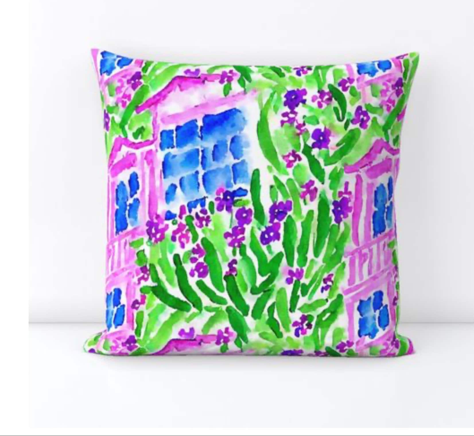 Preppy house and garden with bluebells, watercolor pattern, floral print