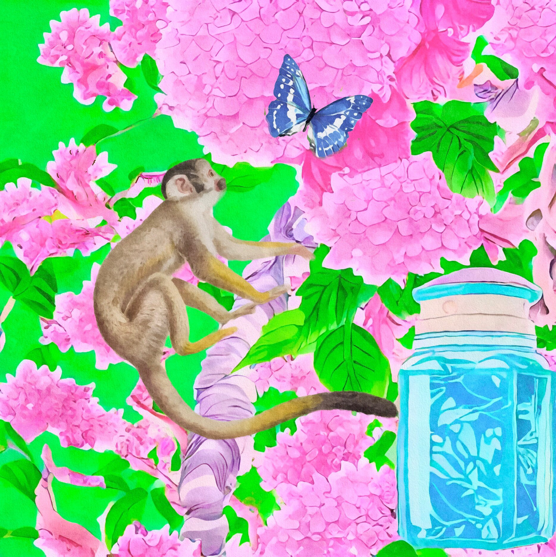 Grandmillennial art, Monkey and blue butterfly, fine art prinr