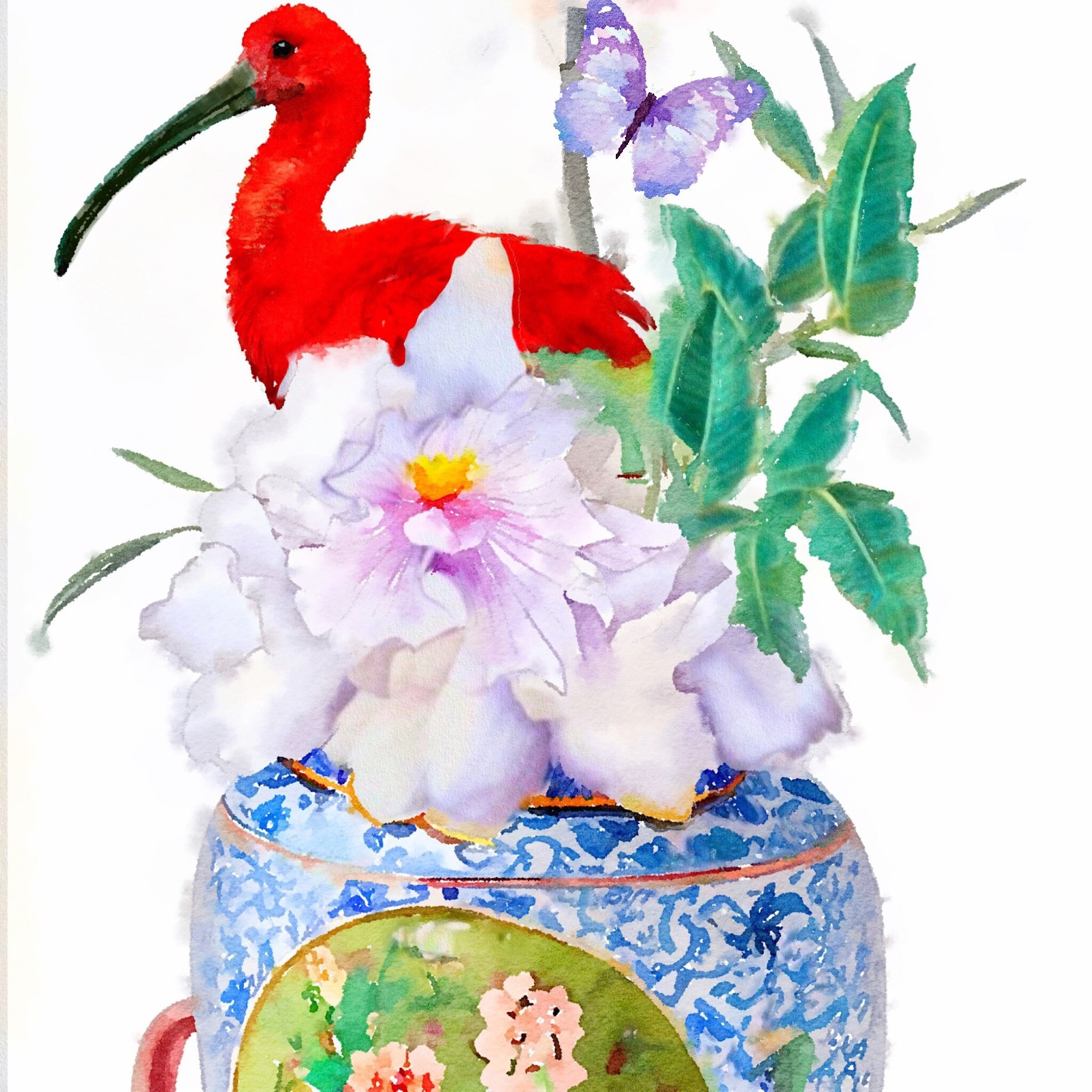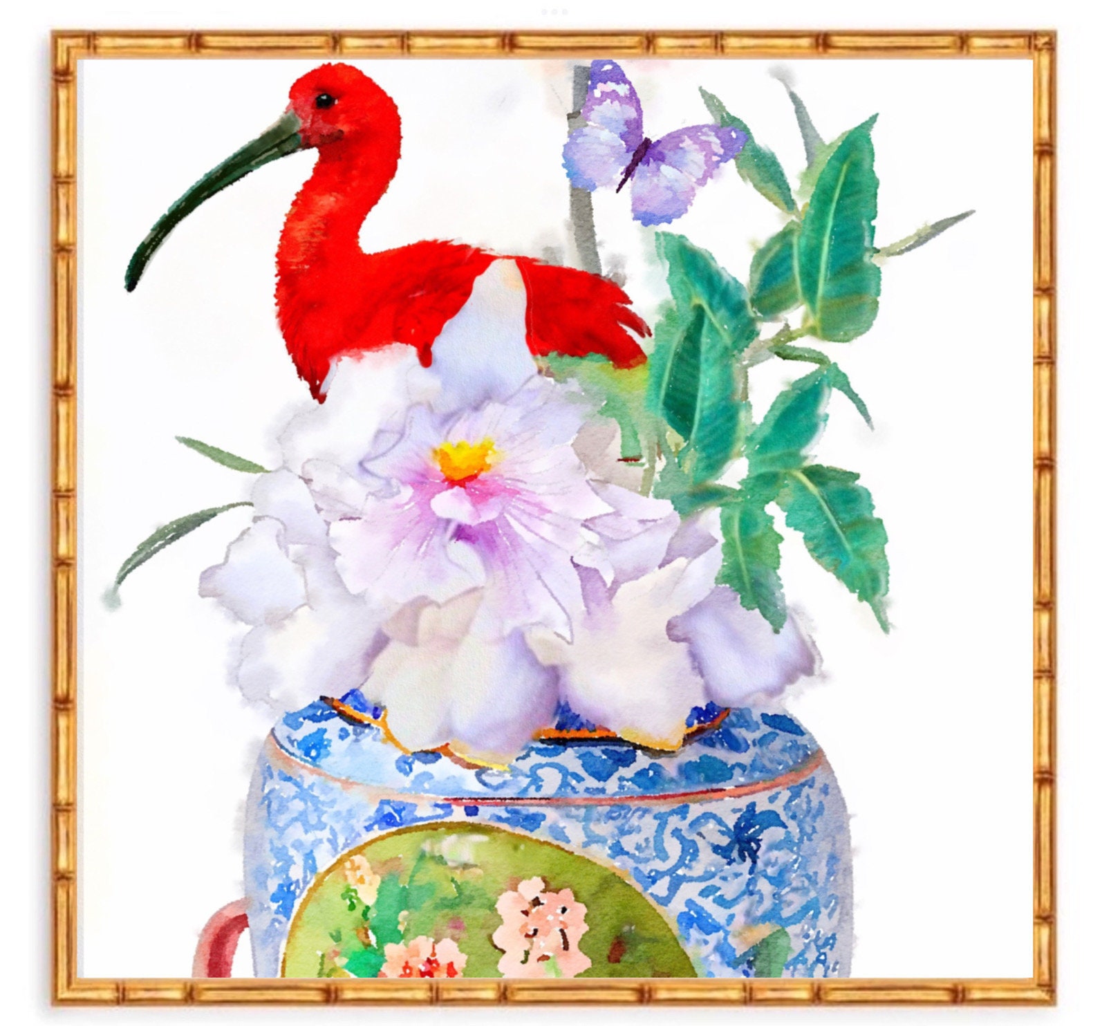 Chinoiserie art print birds, red Ibis and chinoiserie jar watercolor