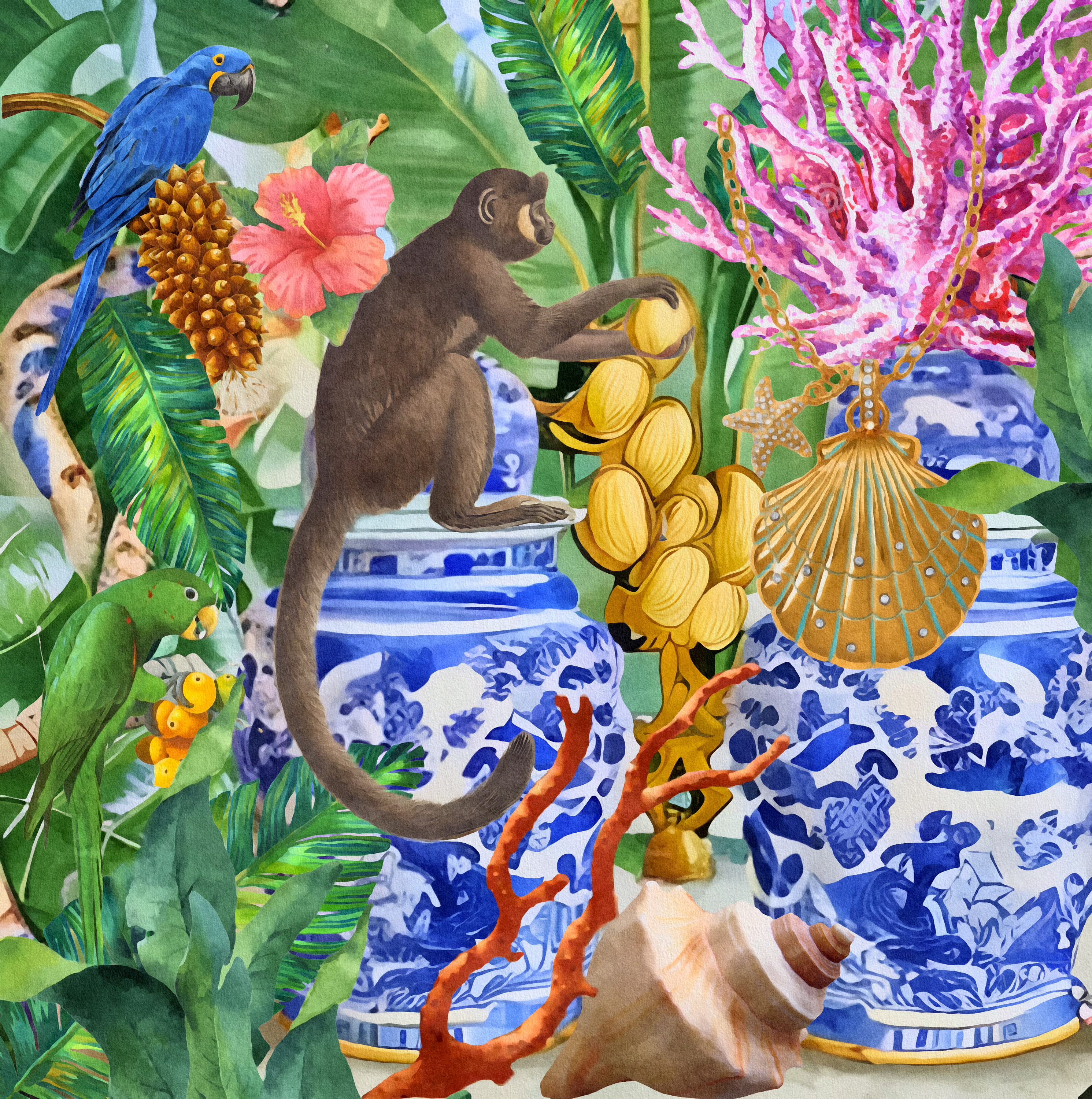 Grandmillennial art, Monkey, parrors and chinoiserie jars in tropical garden art print
