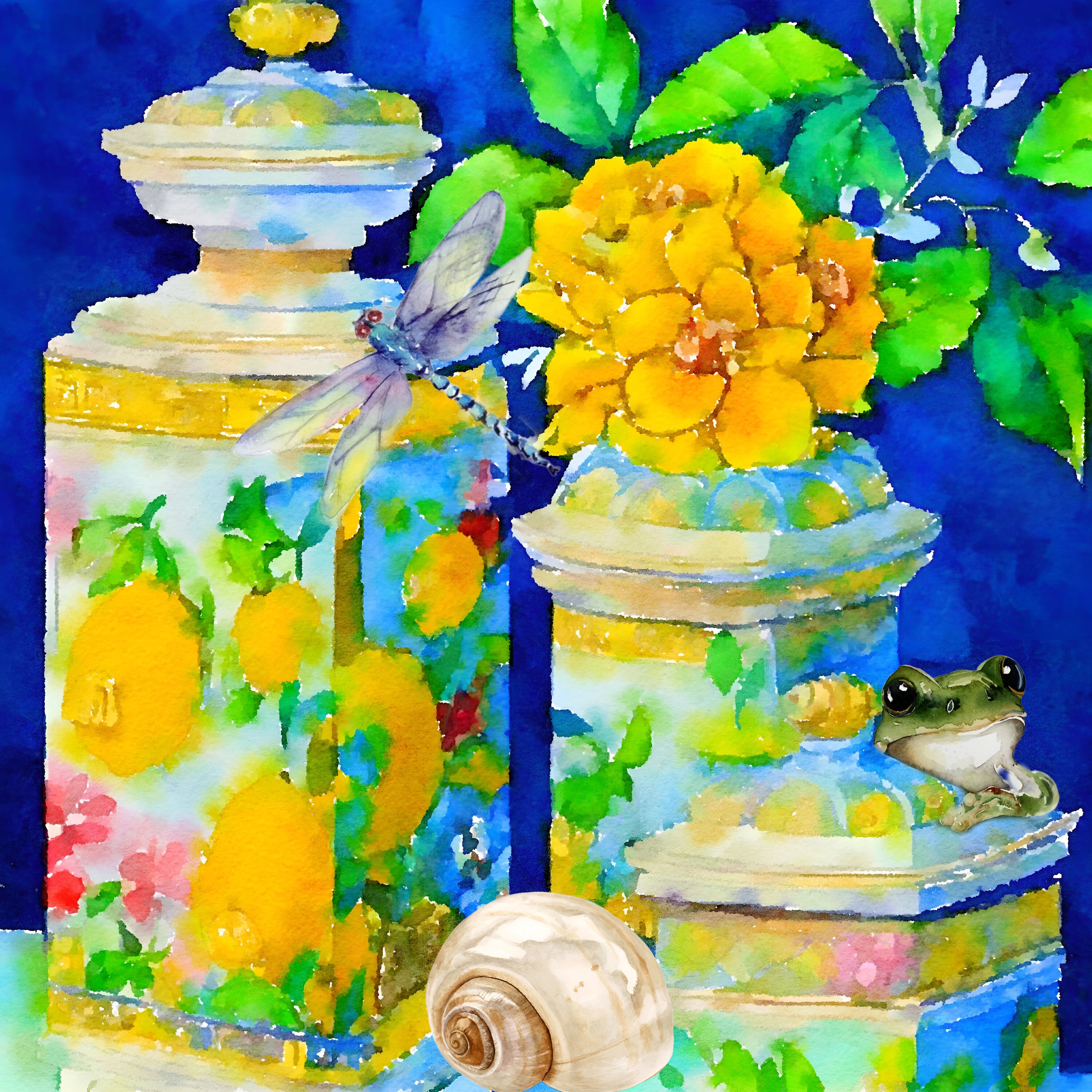 PLEASE NOTE SIZES ARE IN CM. My new painting. Oversized watercolor painting on 300gsm paper. Blue and yellow chinoiserie vase, frog and a dragonfly still life. Please note that this painting is very large for a watercolor: 1mx1m. Ships in a tube.