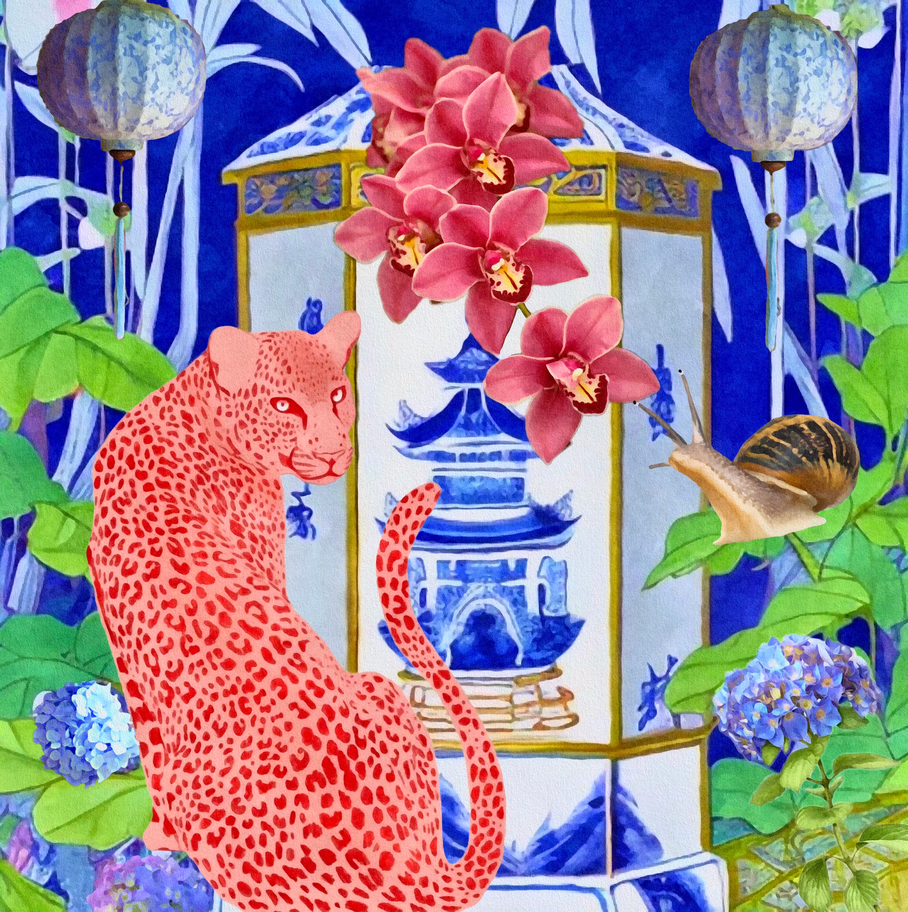 Chinoiserie Art Print: Pink Cheetah, Tropical Garden (Giclee)