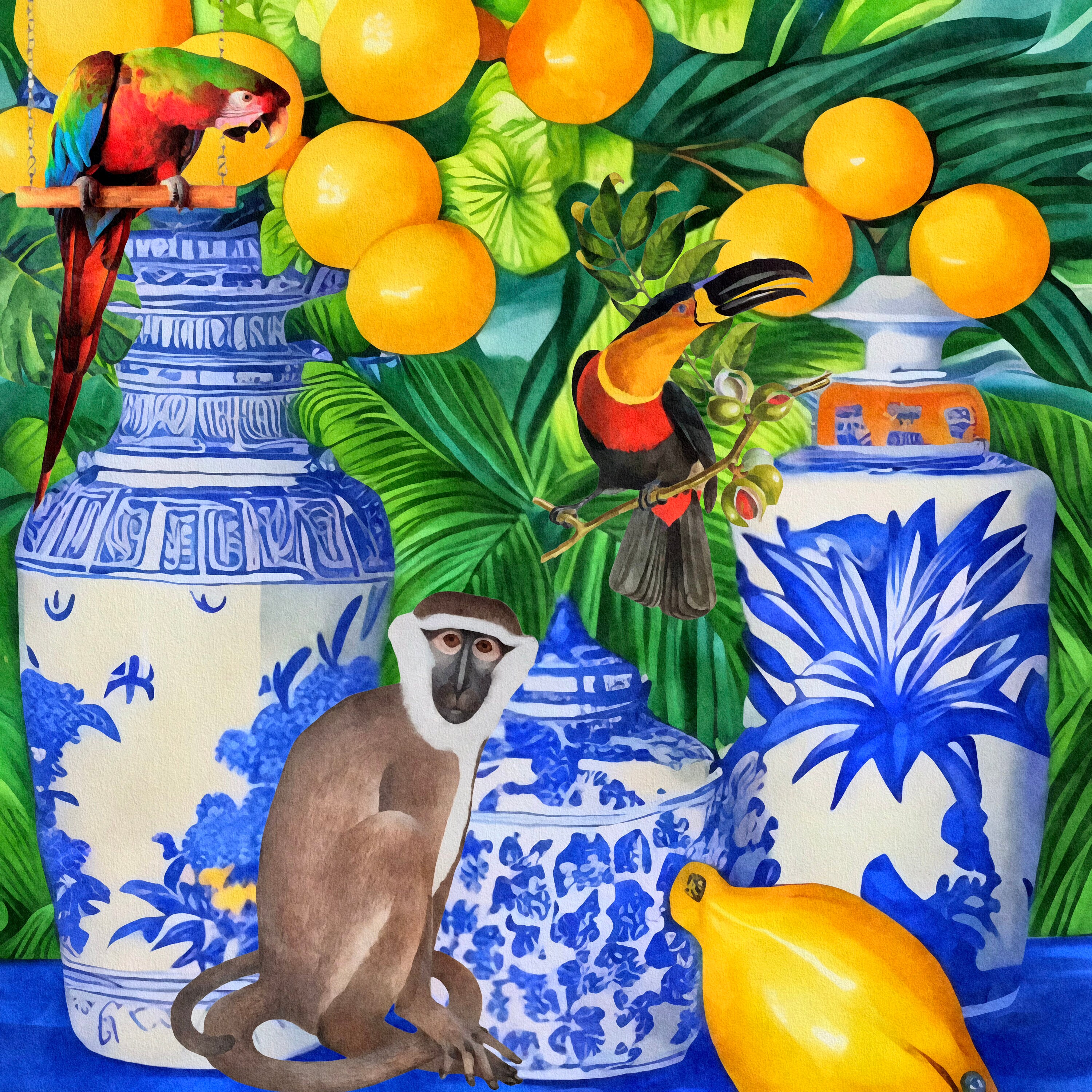 Grandmillennial art, Monkey, parrot, Toucan and chinoiserie jars in tropical garden art print