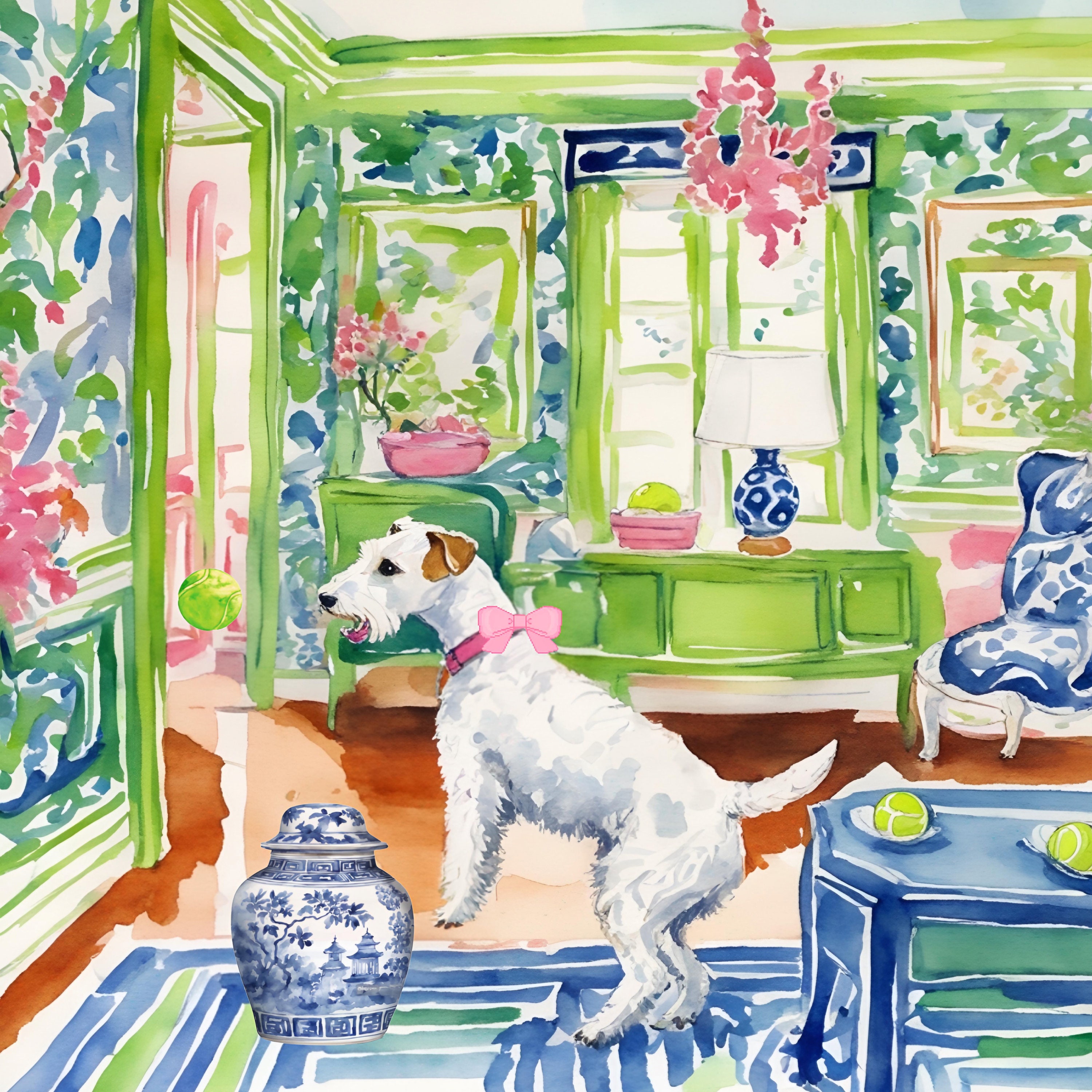 Terrier chasing a tennis ball in chinoiserie interior