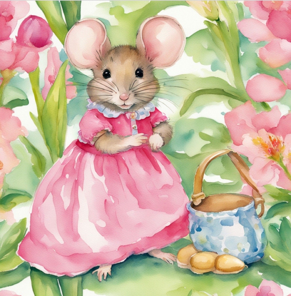 Mouse Watercolor Art Print: Pink Dress, Baby Room Decor