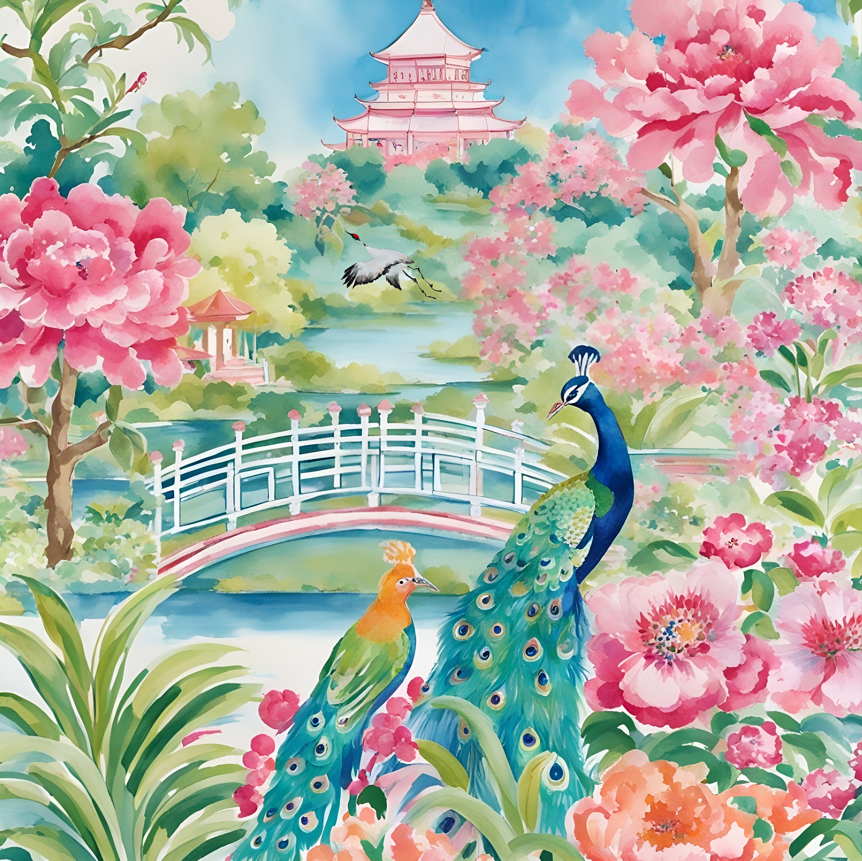 Chinoiserie panel, Mystical chinoiserie garden, part 2, art print