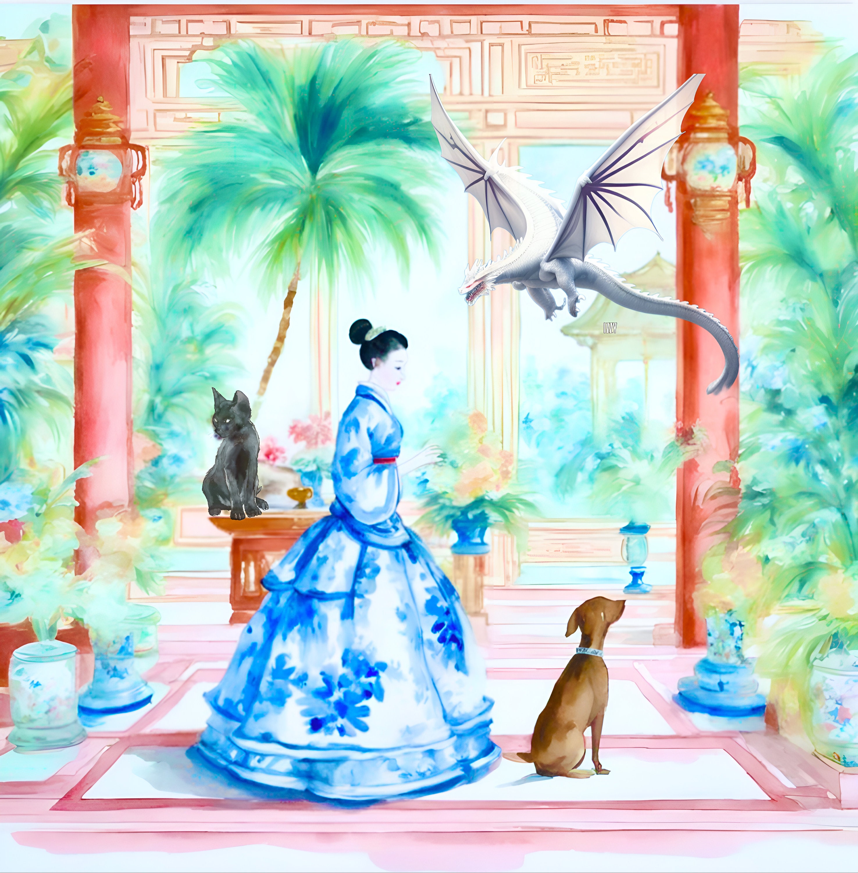 Sophie's art is the modern interpretation of Chinese artistic traditions featuring pagodas, landscapes, blue and white porcelain, ginger jars, pagodas, cheetahs and monkeys. Sophie developed her own recognizable style with bright colors and whimsical details.