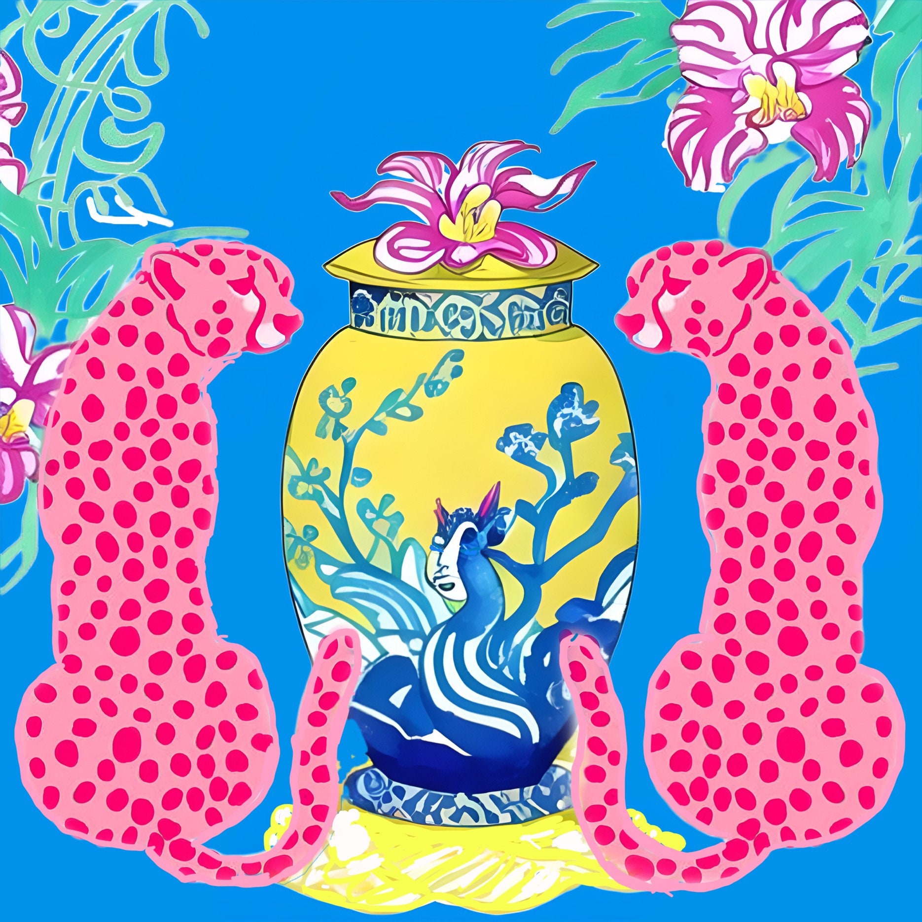 Grandmillennial art, Pink cheetahs and yellow chinoiserie jar, preppy chinoiserie download