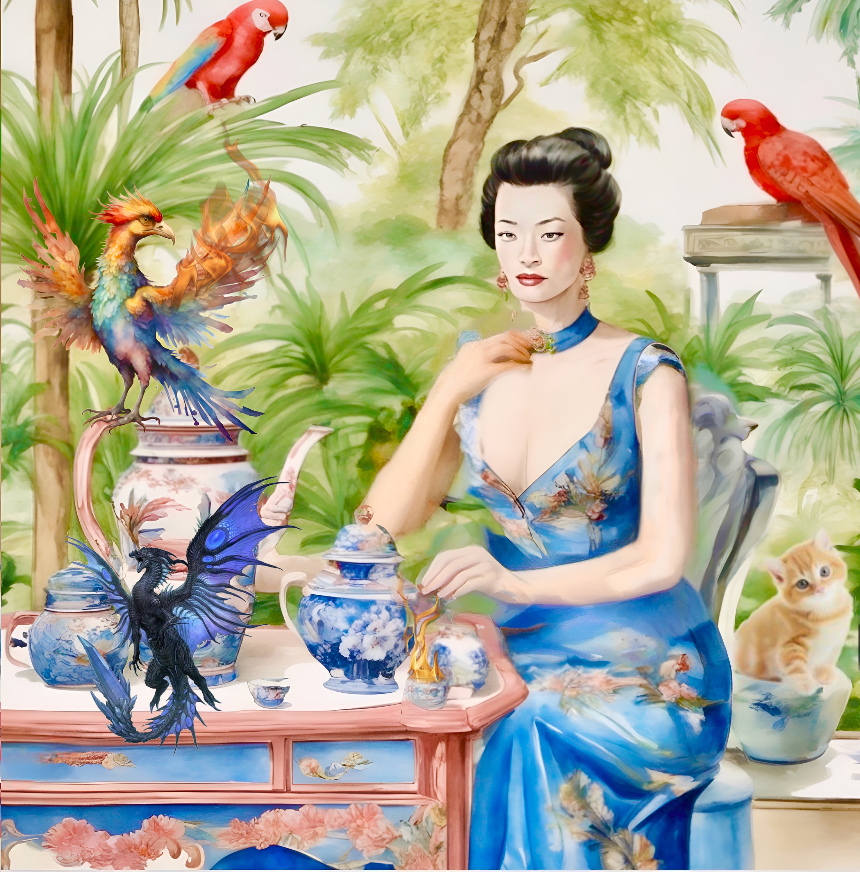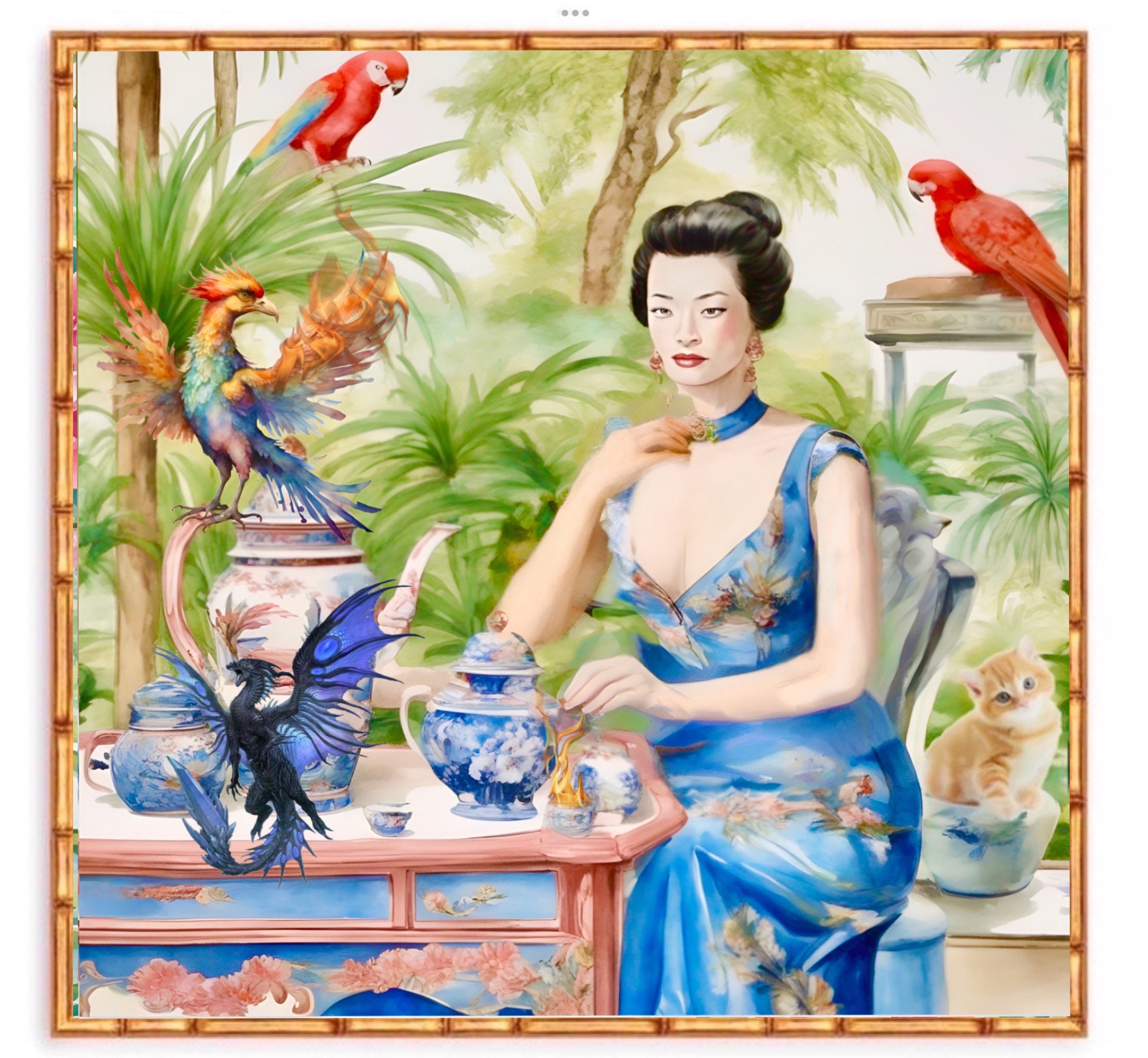 Chinoiserie art, Tea with the burning Fenix, chinoiserie panel