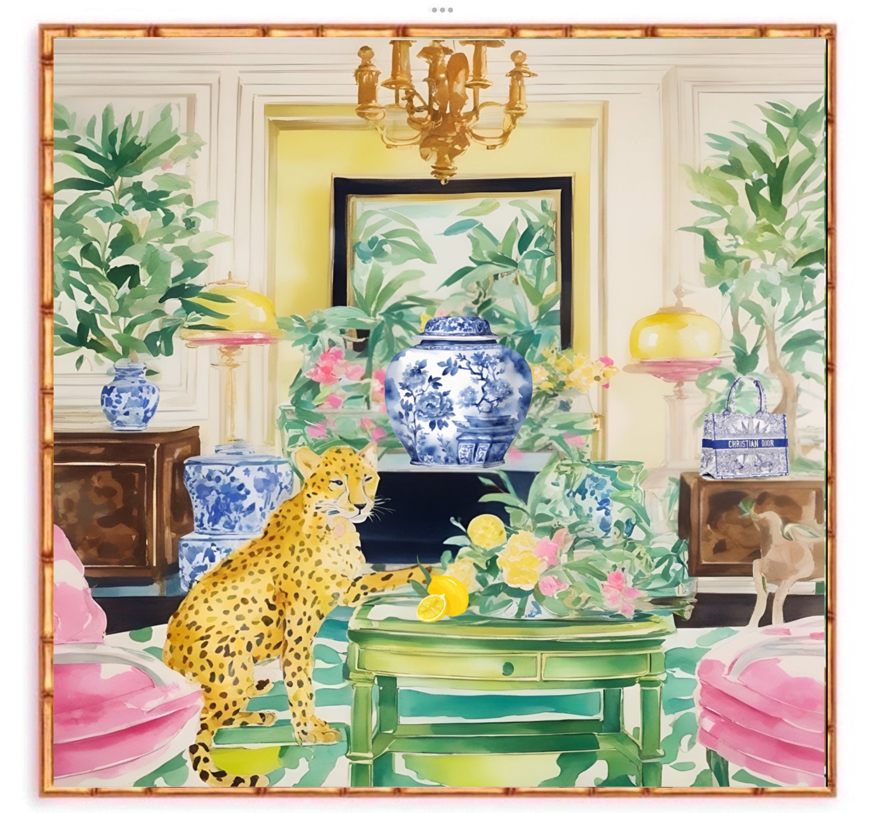 Sophie's art is the modern interpretation of Chinese artistic traditions featuring pagodas, landscapes, blue and white porcelain, ginger jars, pagodas, cheetahs and monkeys. Sophie developed her own recognizable style with bright colors and whimsical details.