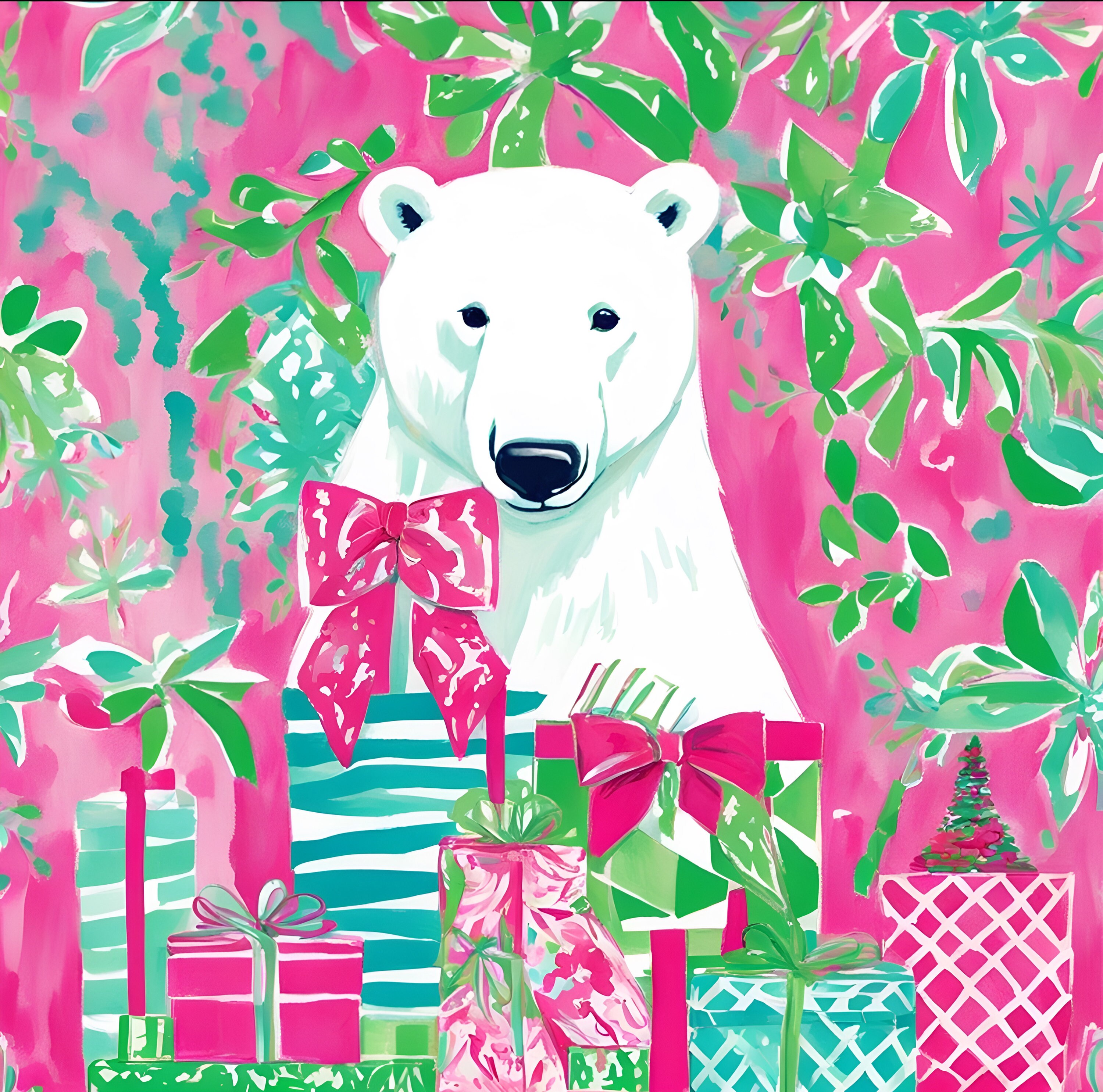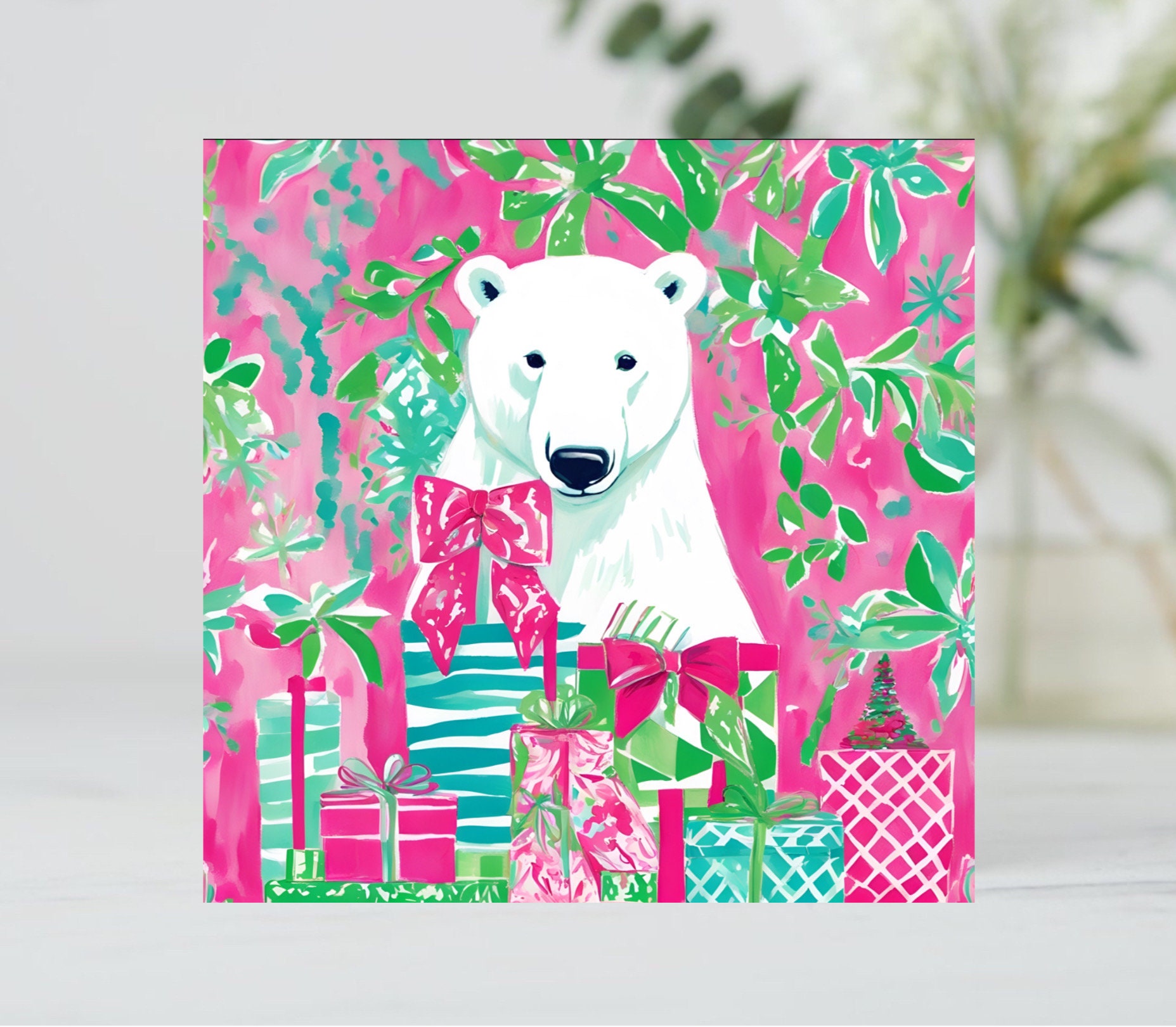 Holiday Christmas card: preppy Polar bear and Christmas presents