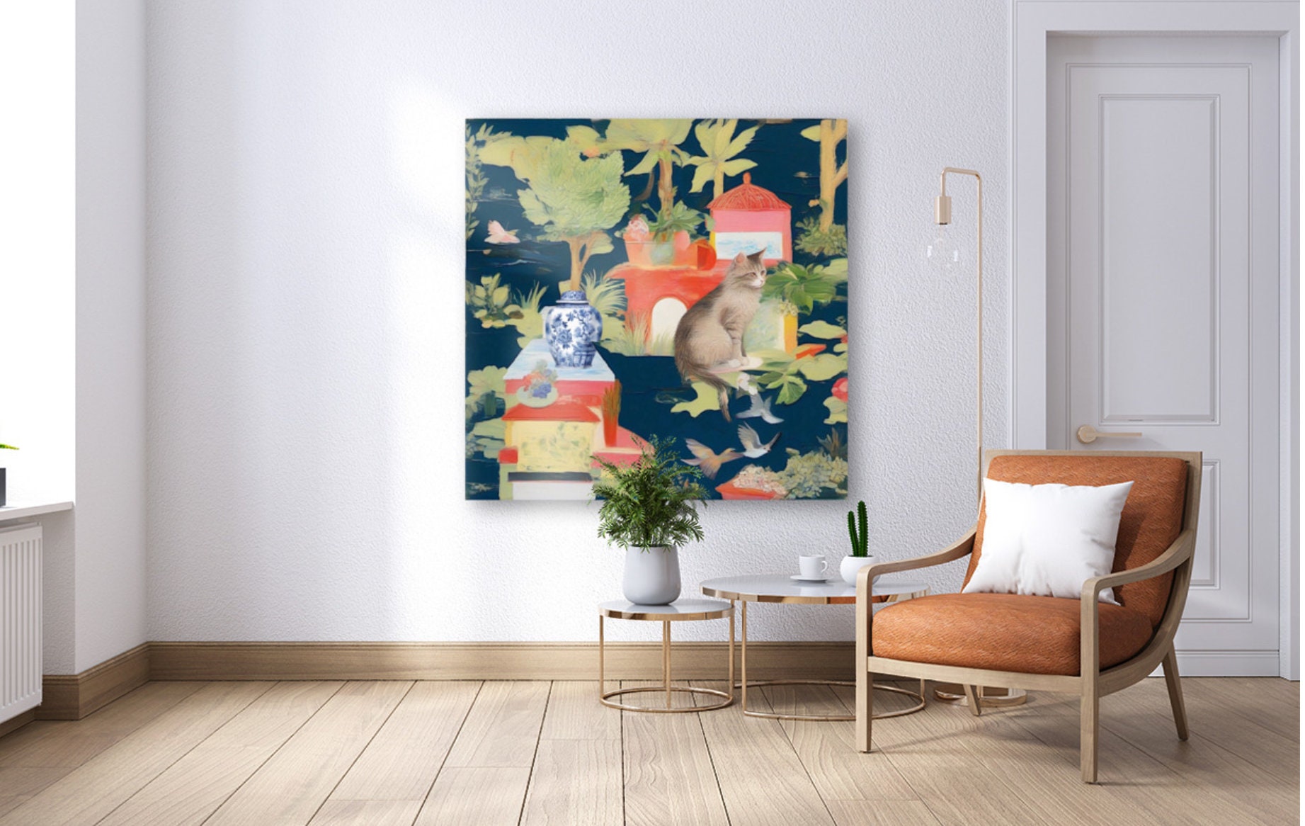 Grandmillennial art, Whimsical chinoiserie cat house on the lake art print