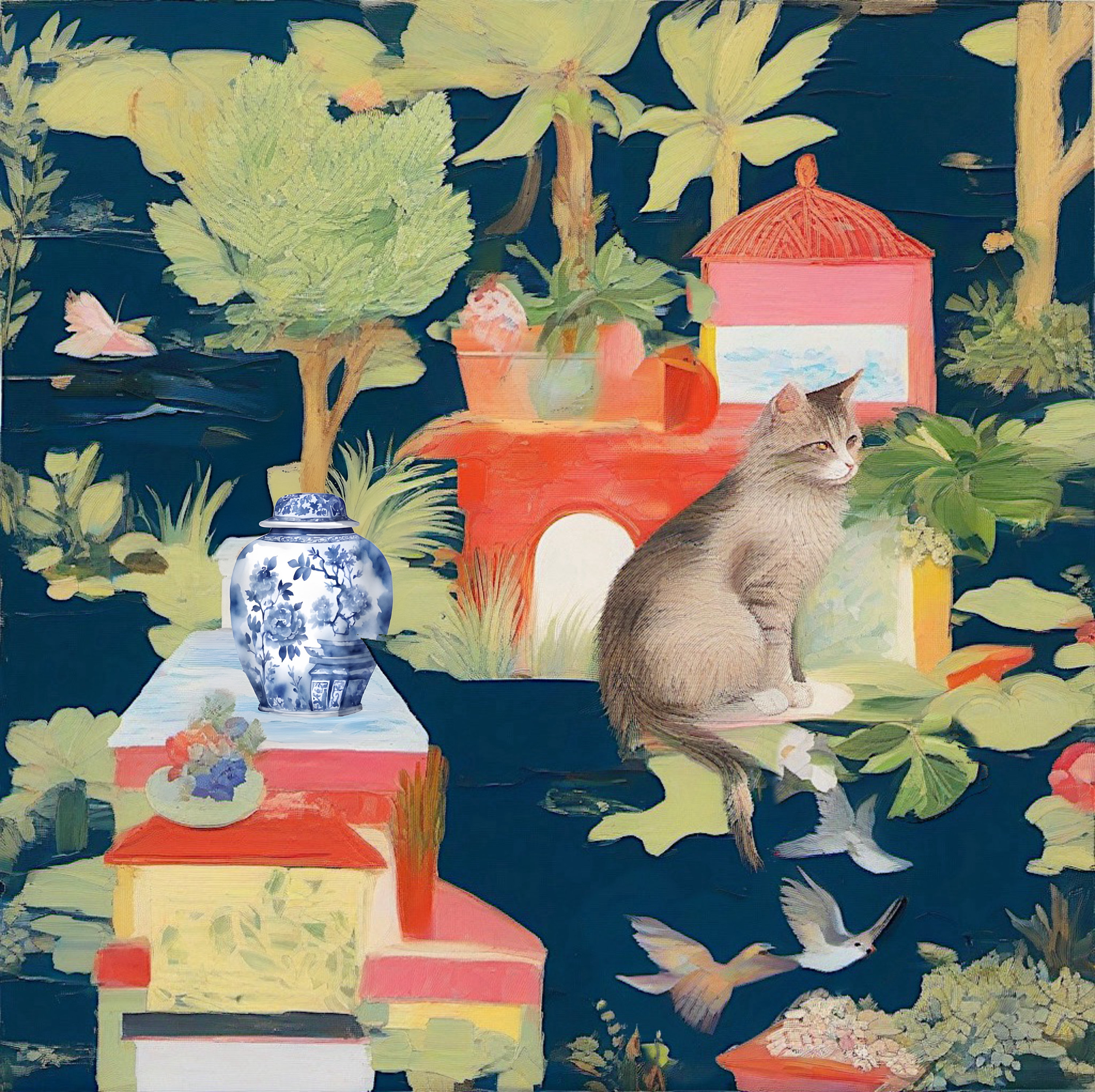 Sophie's art is the modern interpretation of Chinese artistic traditions featuring pagodas, landscapes, blue and white porcelain, ginger jars, pagodas, cheetahs and monkeys. Sophie developed her own recognizable style with bright colors and whimsical details.