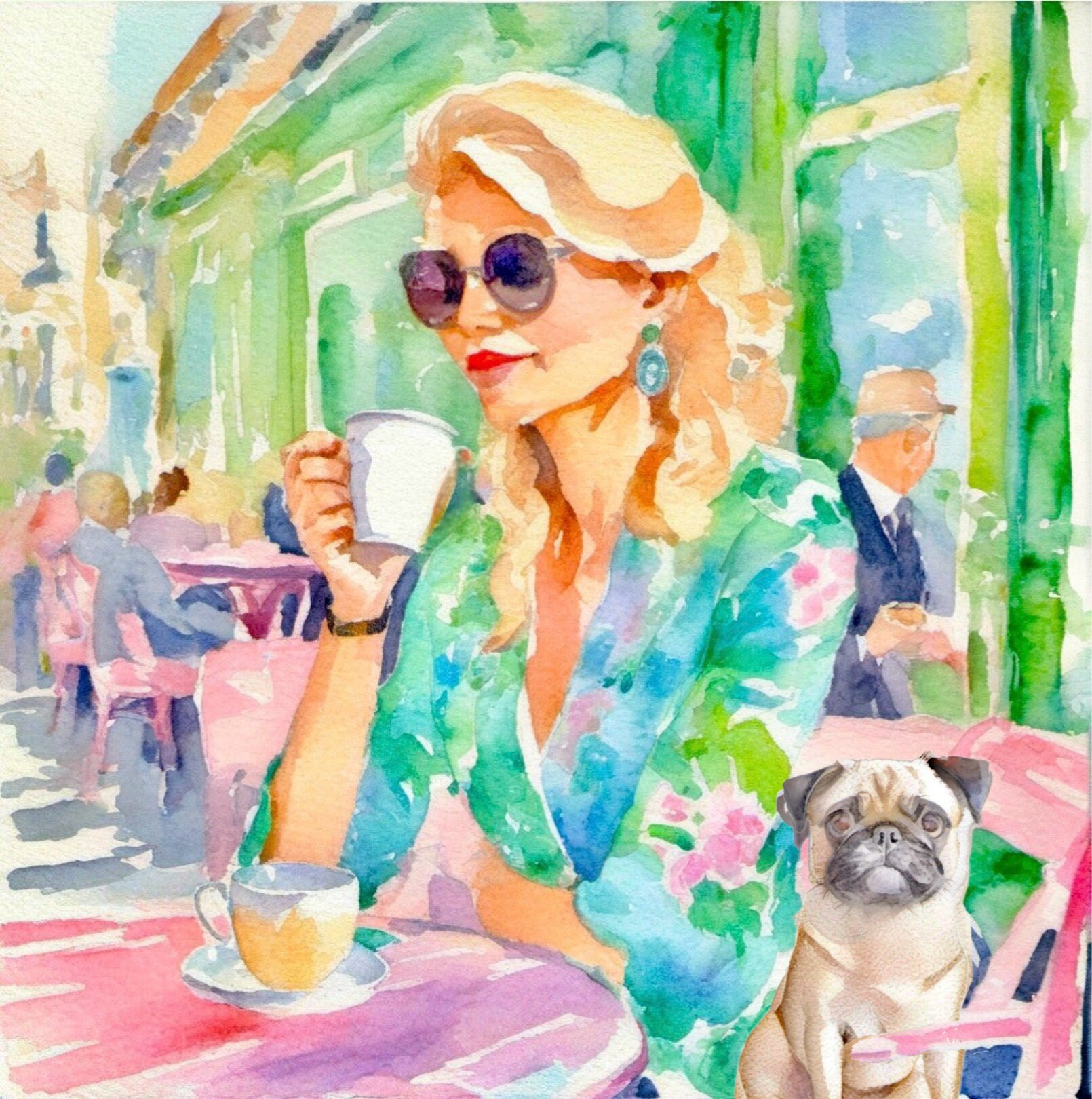 Grandmillennial art, A girl and her Pug having coffee