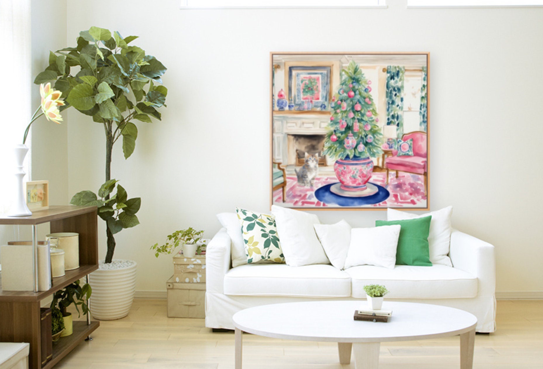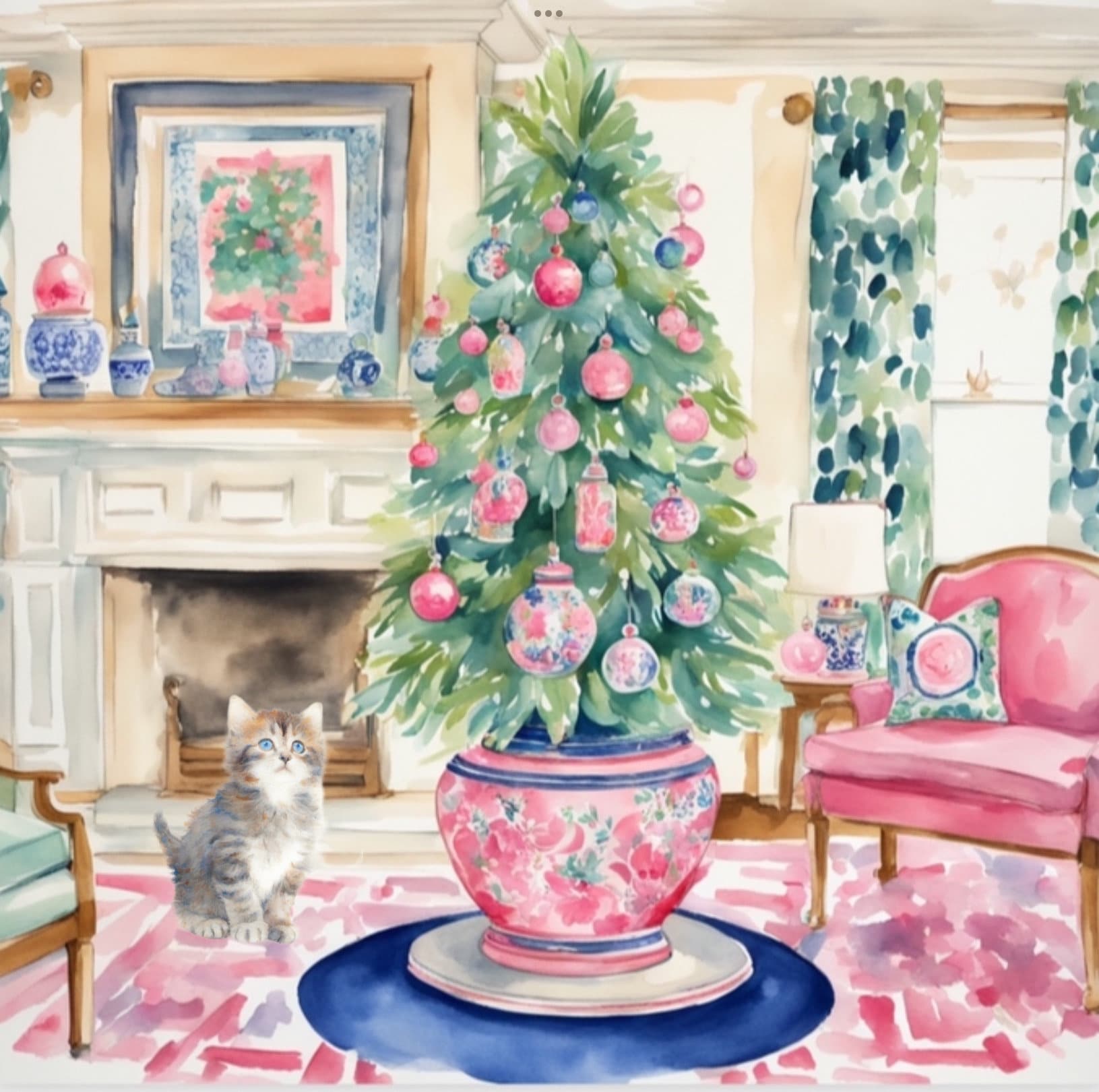 Grandmillennial art, Kitten and Christmas tree in chinoiserie interior, whimsical watercolor