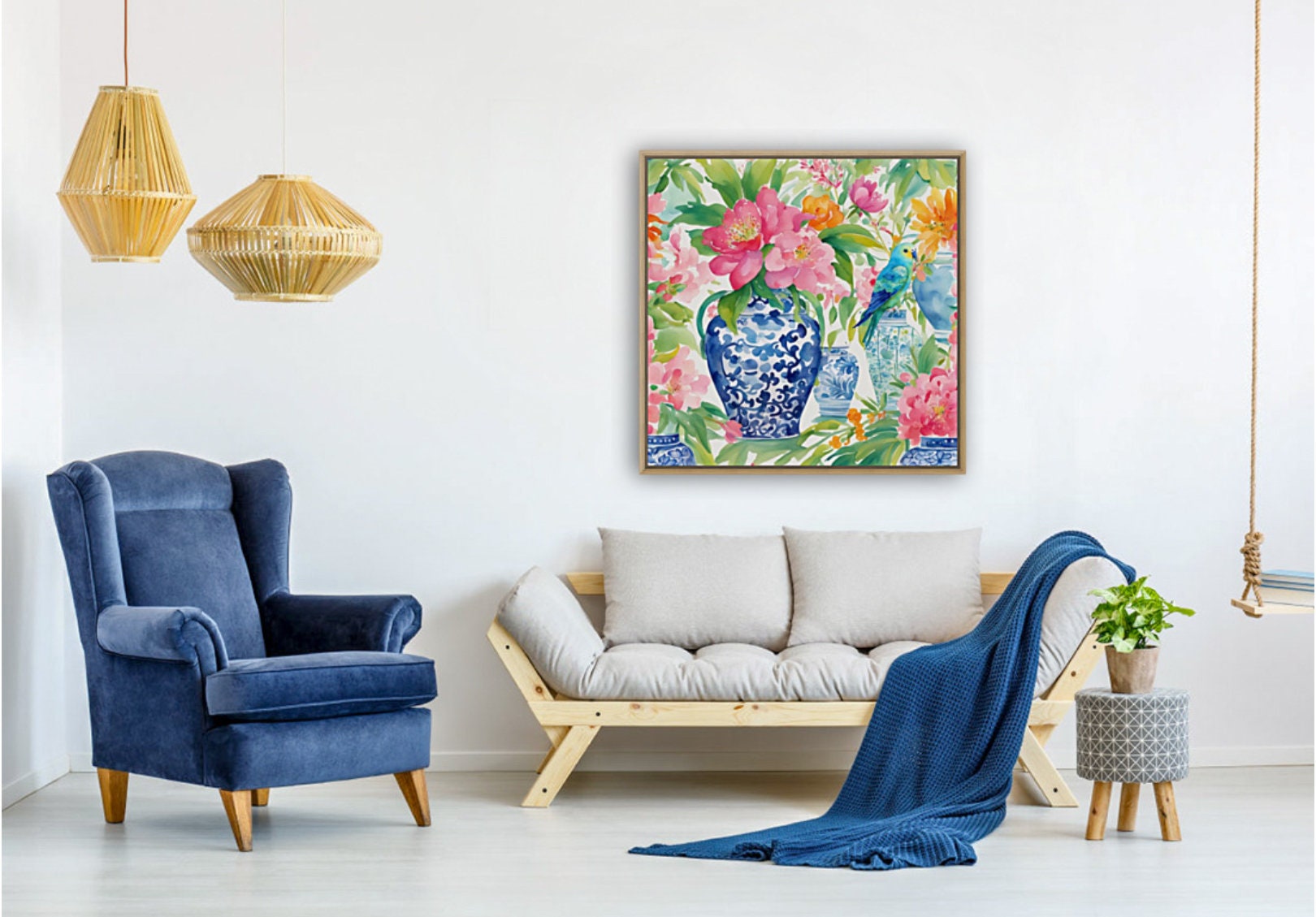 Grandmillennial art, Preppy budgie and peonies in chinoiserie jar, watercolor painting