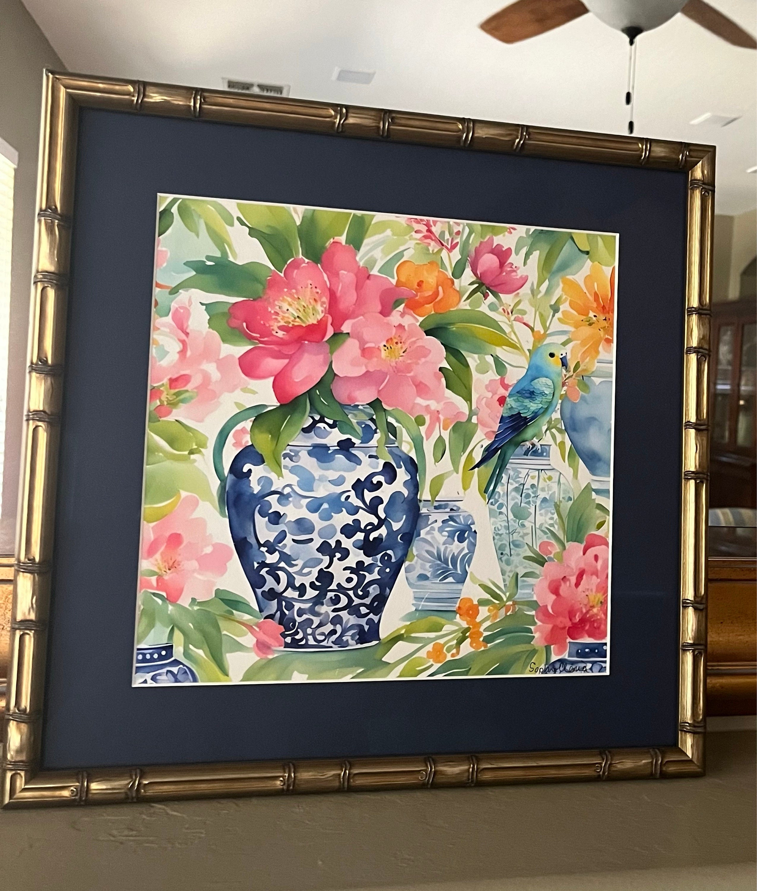 PLEASE NOTE SIZES ARE IN CM. Limited edition Giclee art print of original watercolor by Sophie Clima. #3 painting from Birds and Flowers series. Unframed. Ships in a tube. Each print is signed and dated by Sophie. These watercolor chinoiserie prints will complement your Grandmillennial Style, Chinoiserie Chic Style, Grandmillennial Decor, or Preppy Chic Style Decor. Will look great on Office walls as well.