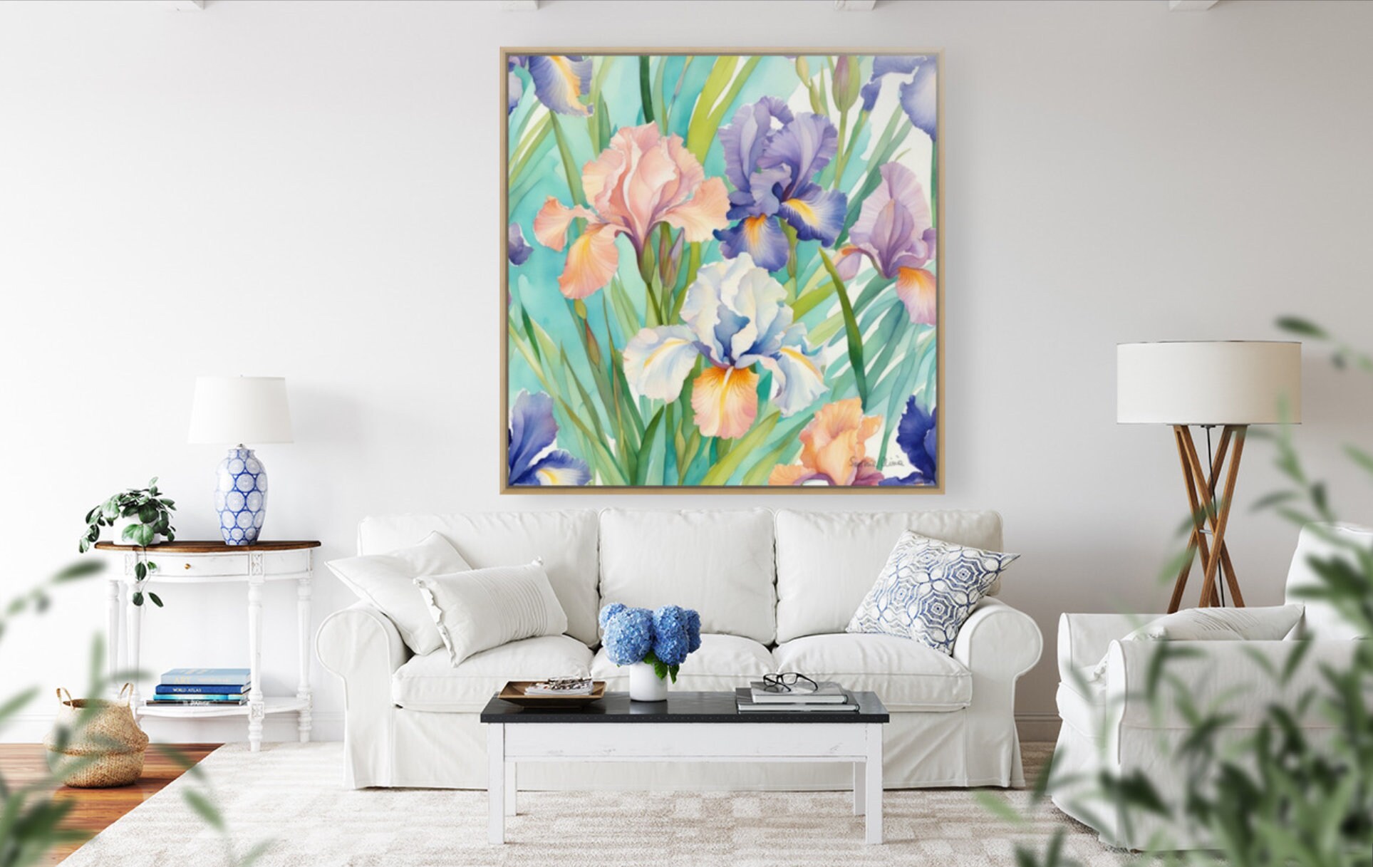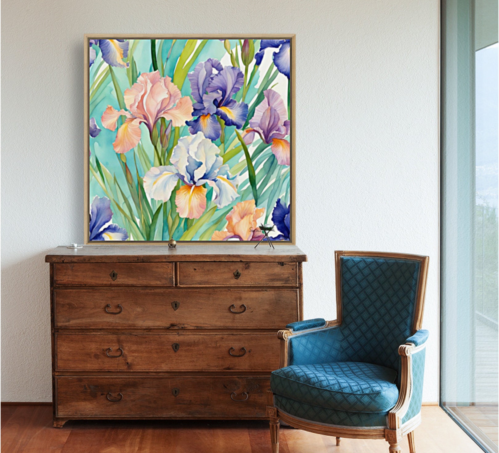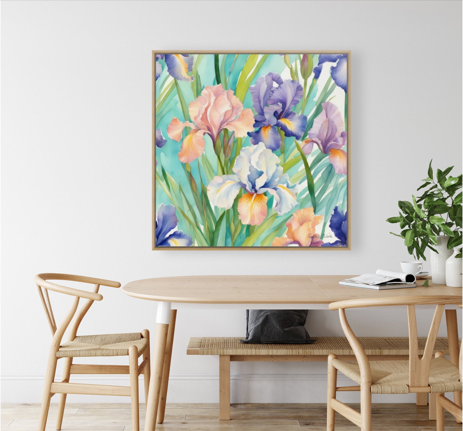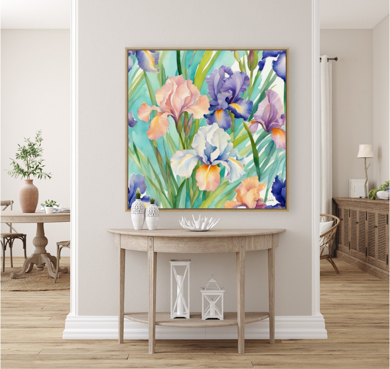 Large Irises Watercolor Painting: Botanical Art, 80x80 cm