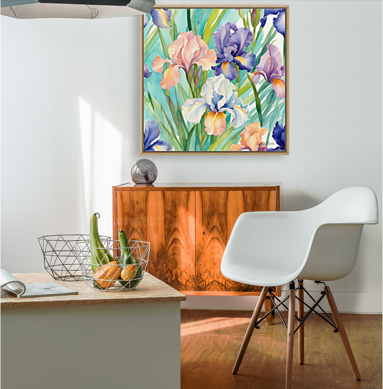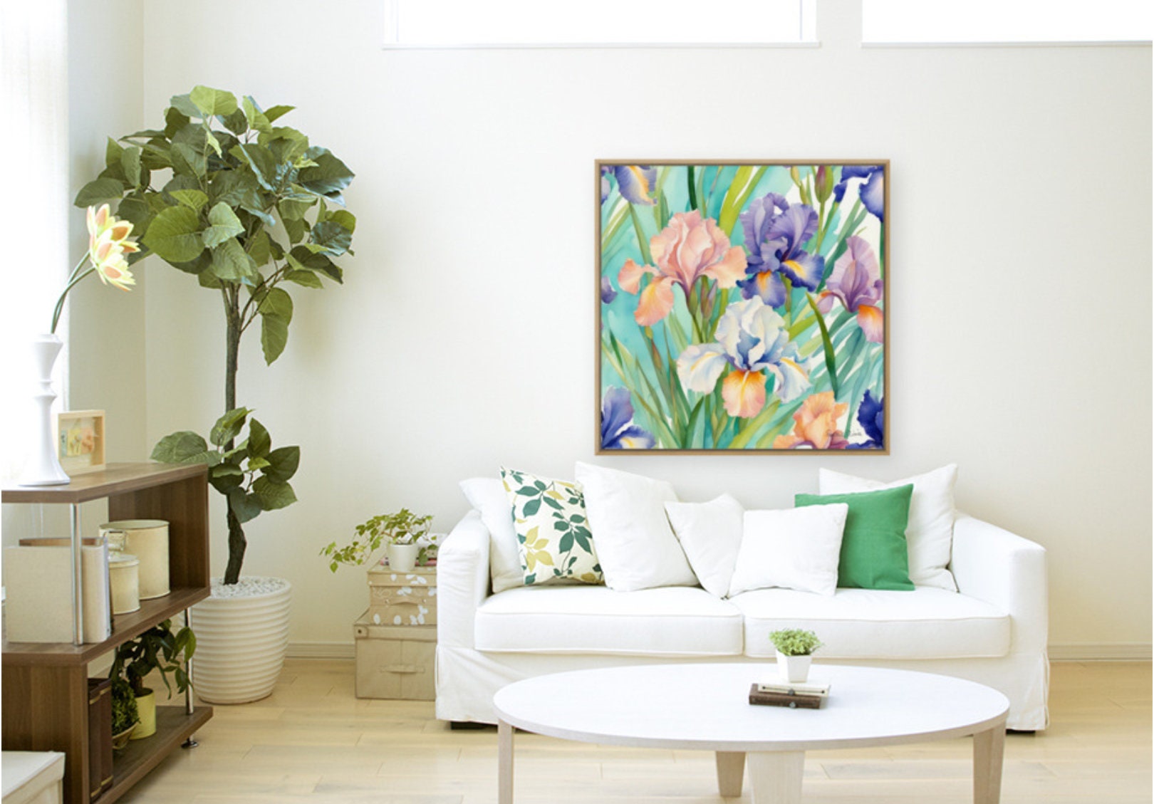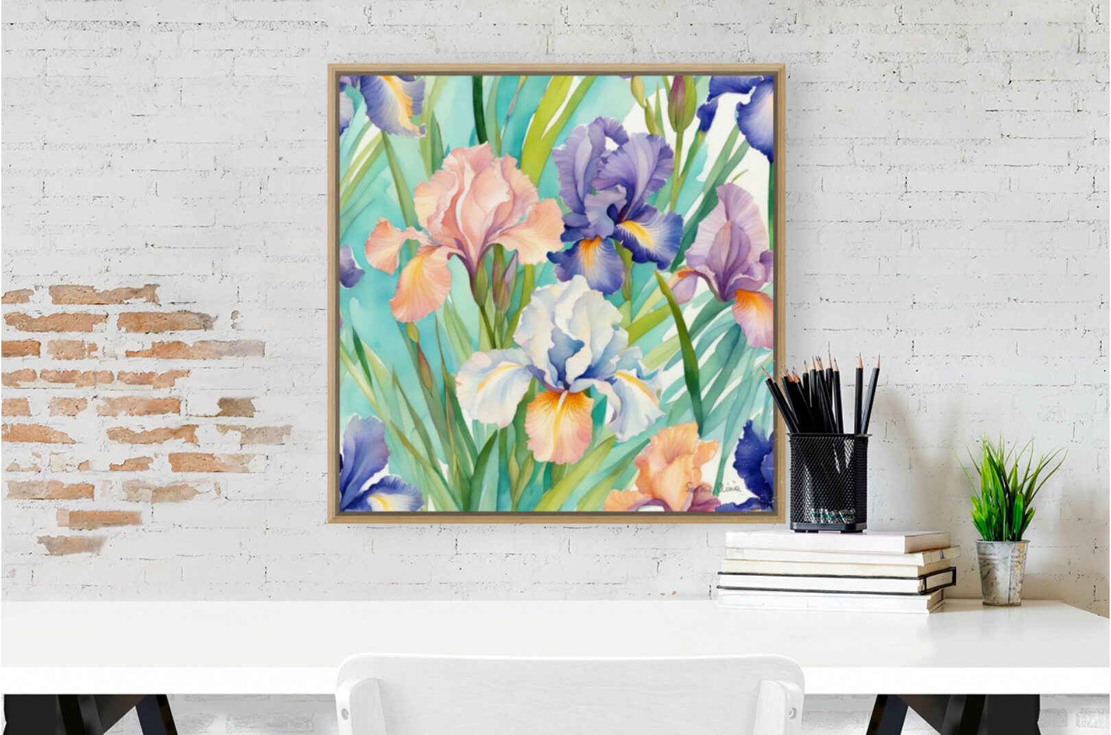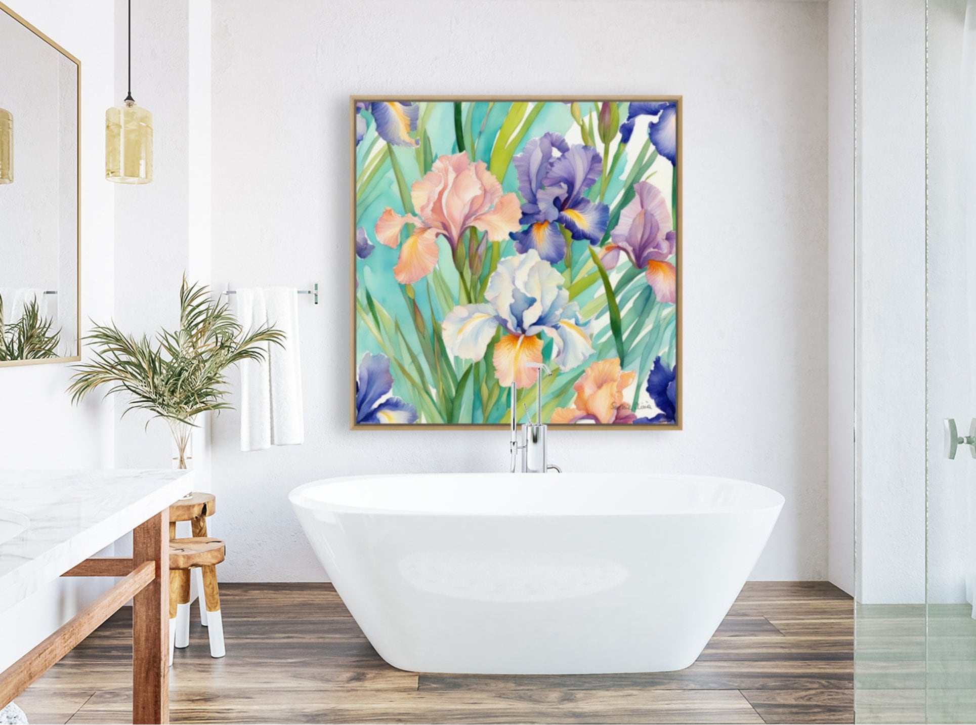 Large Irises Watercolor Painting: Botanical Art, 80x80 cm
