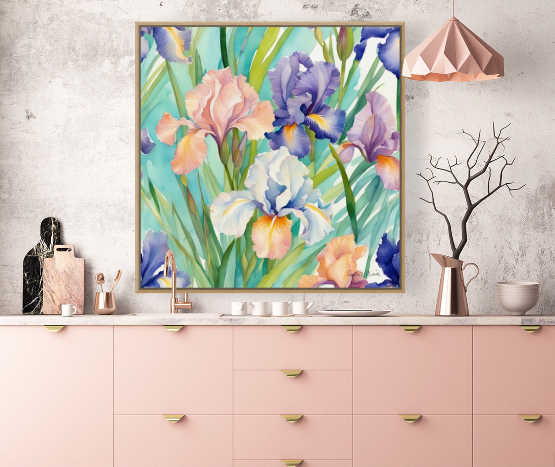 PLEASE NOTE SIZES ARE IN CM. Botanical study of Irises. Large vibrant original watercolor painting on 300gsm paper. 80x80 cm. Ships signed and UV varnished. Ships in a tube.