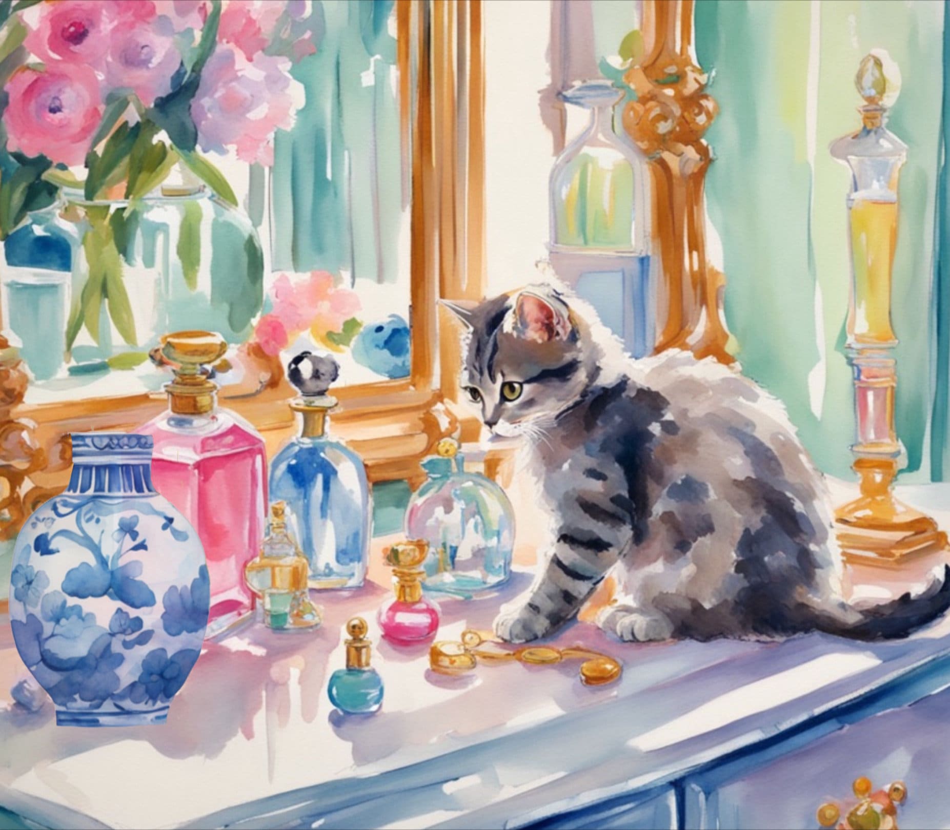 Grandmillennial art, Preppy whimsical watercolor, kitten and the dressing table