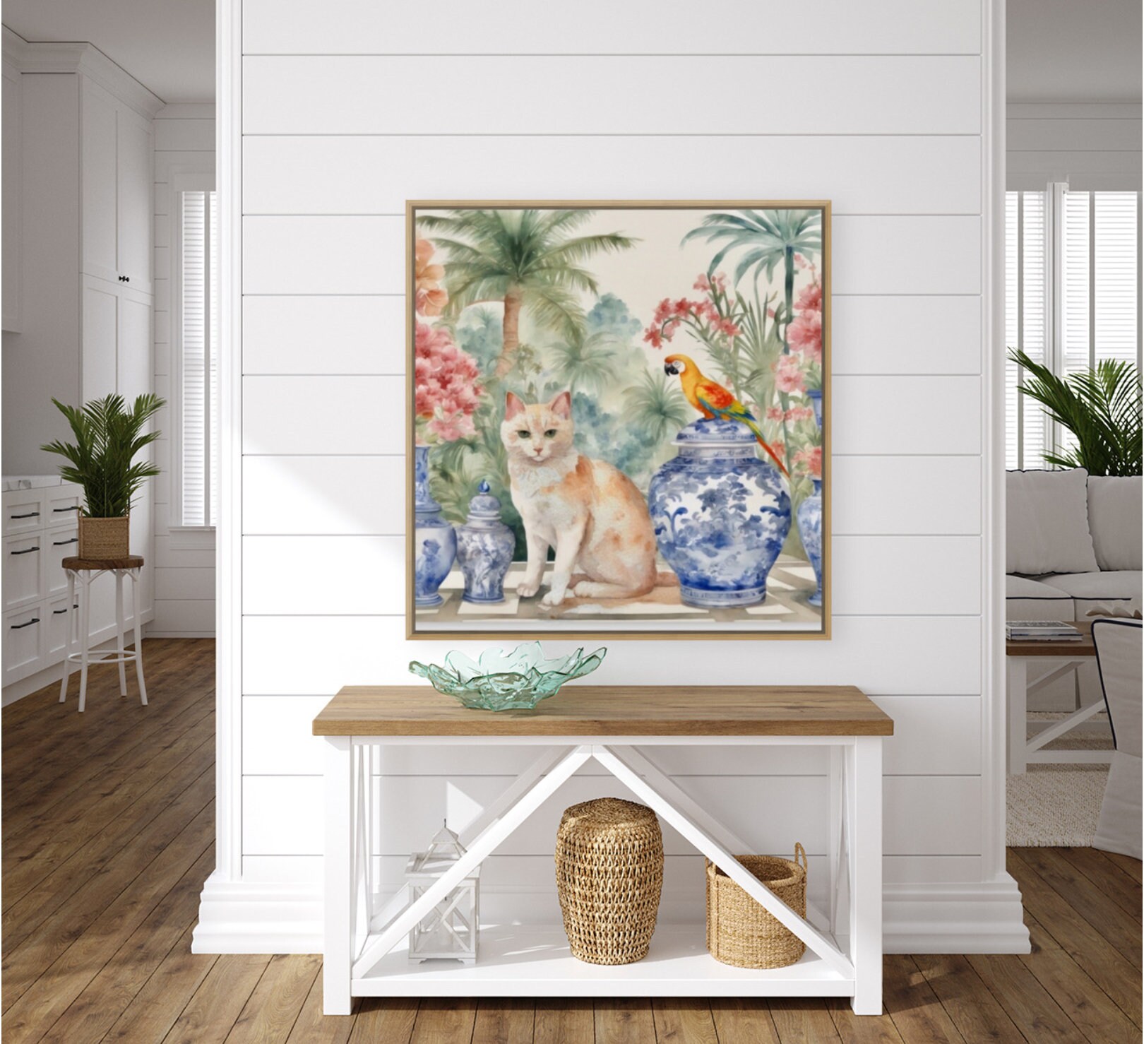 Large watercolor, ginger cat and macaw parrot in chinoiserie landscape