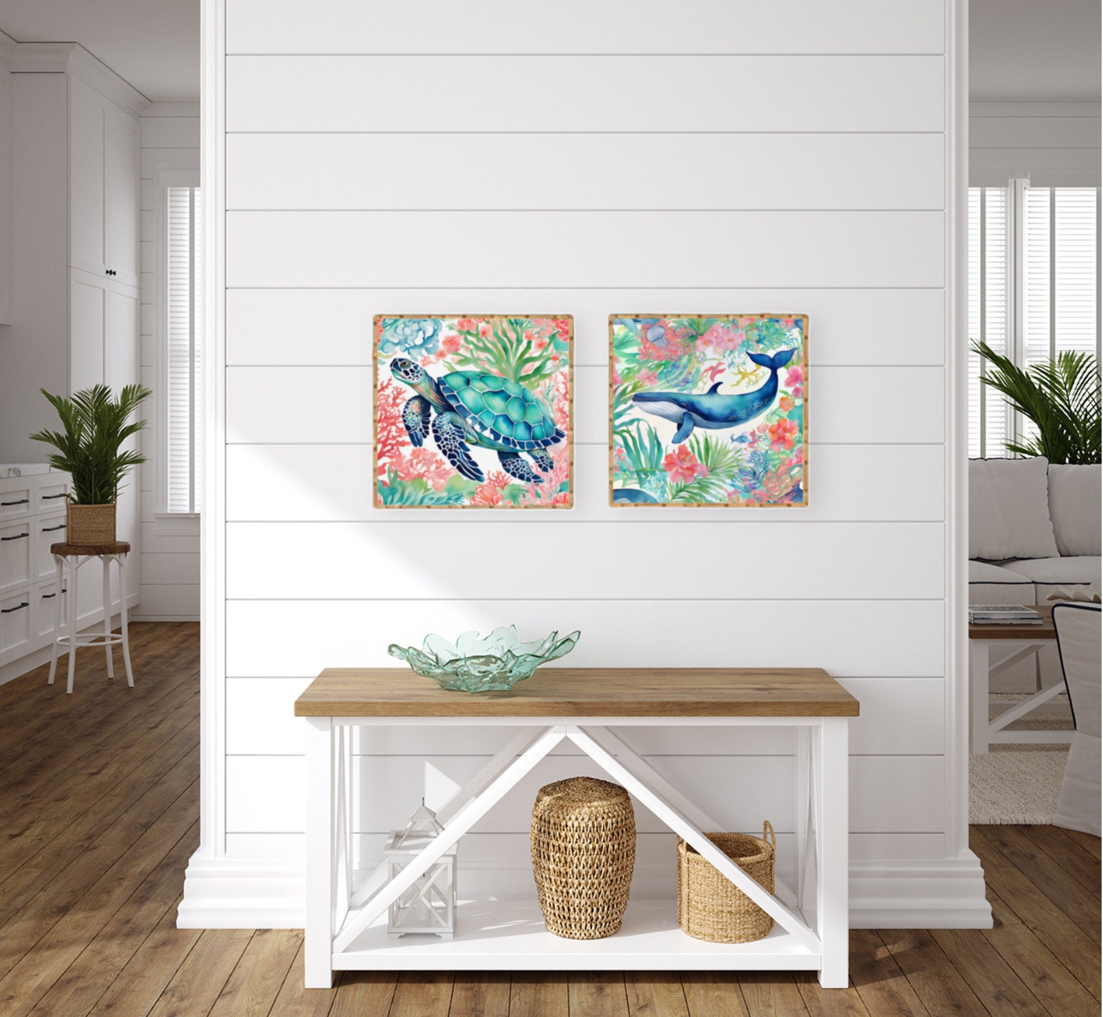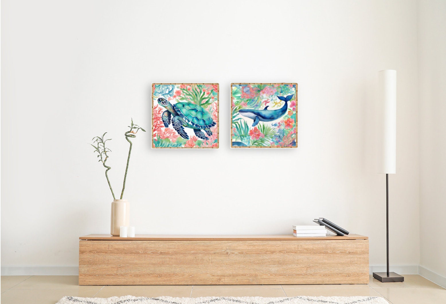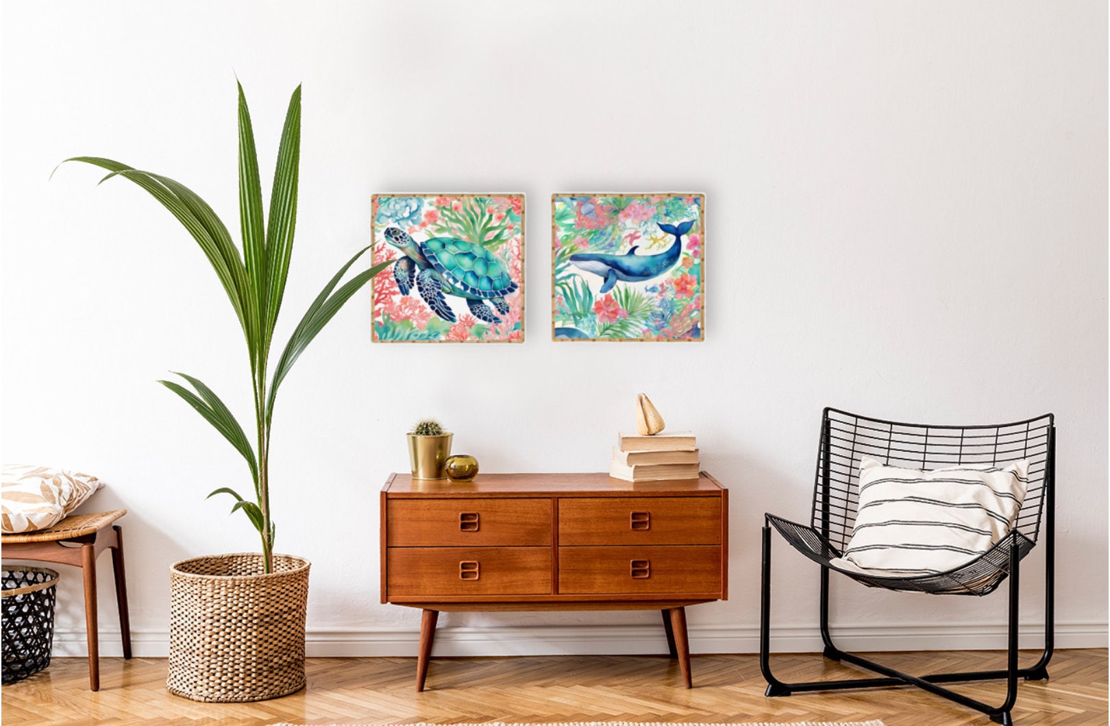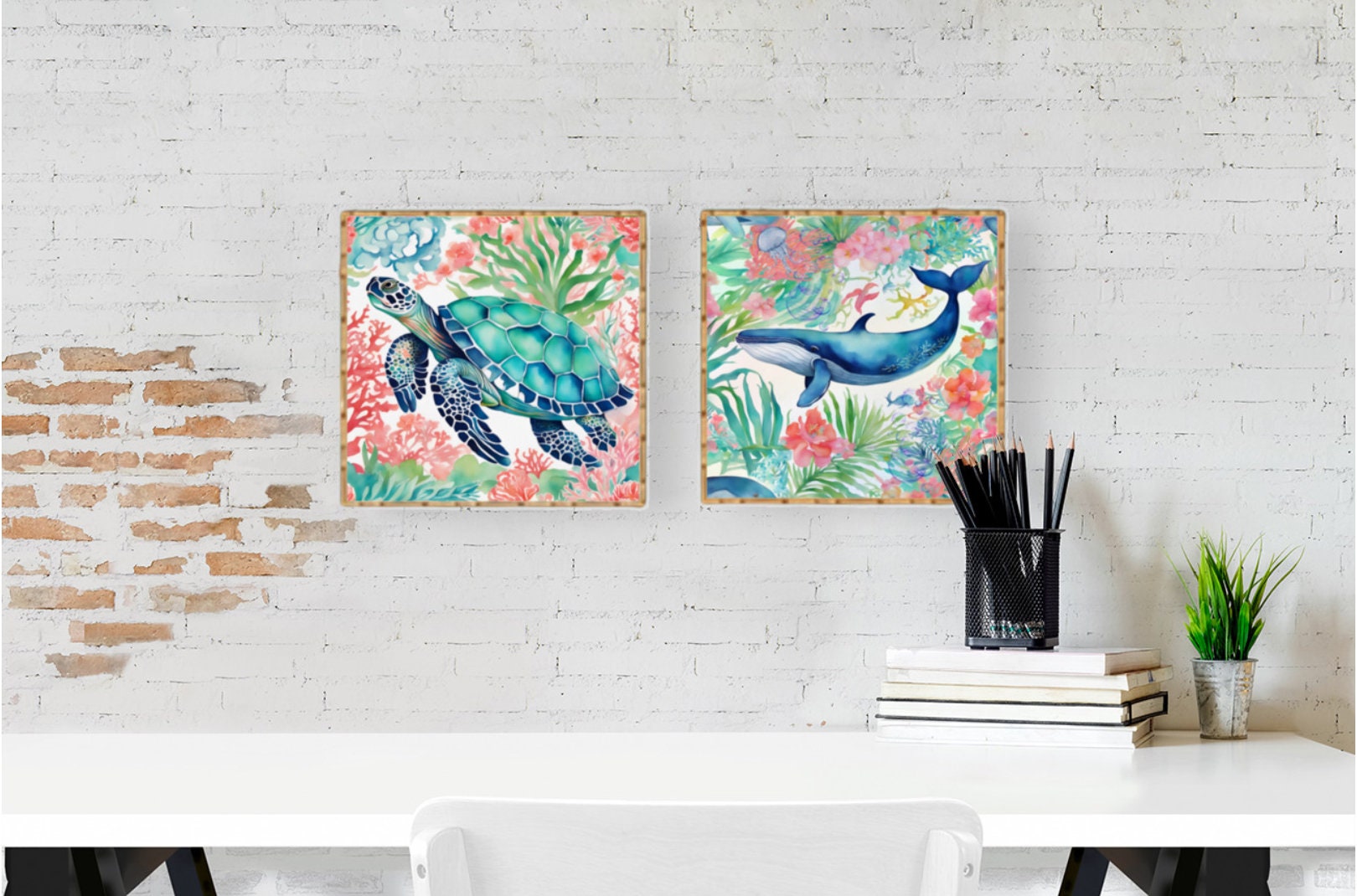 Turtle and Whale Art Prints: Grandmillennial Coral Reef Set