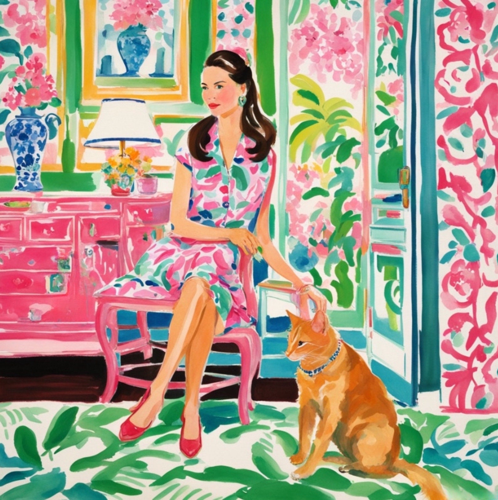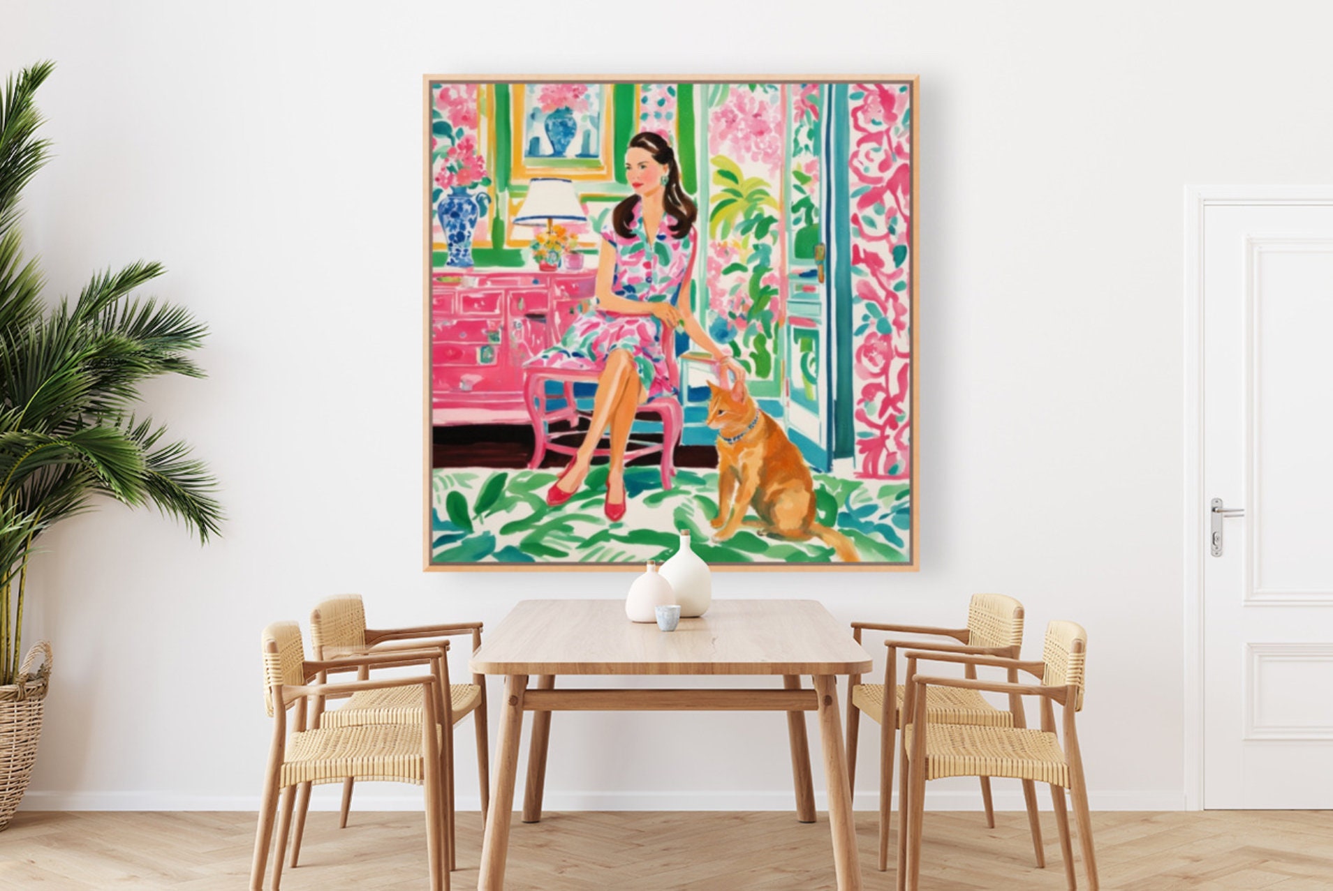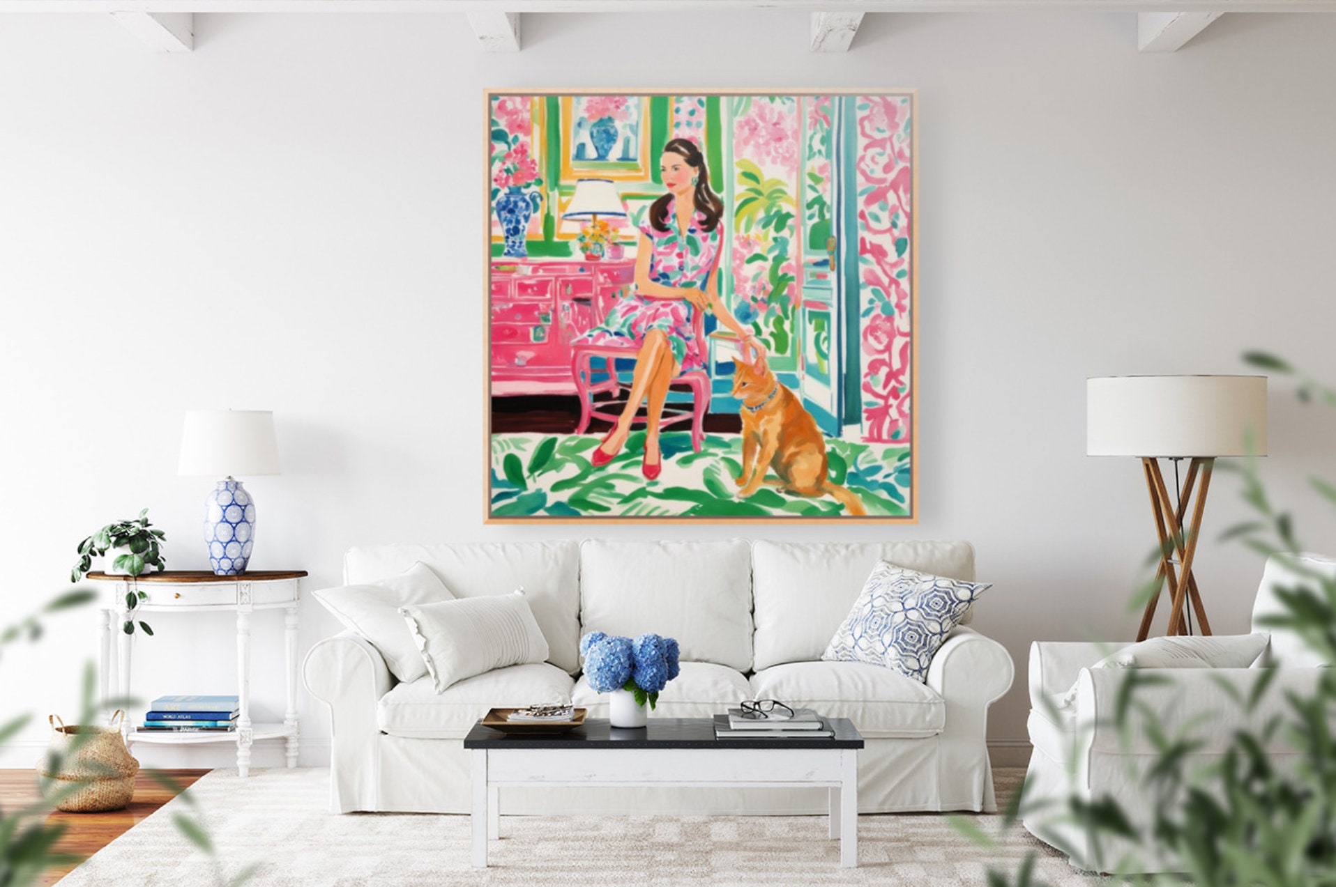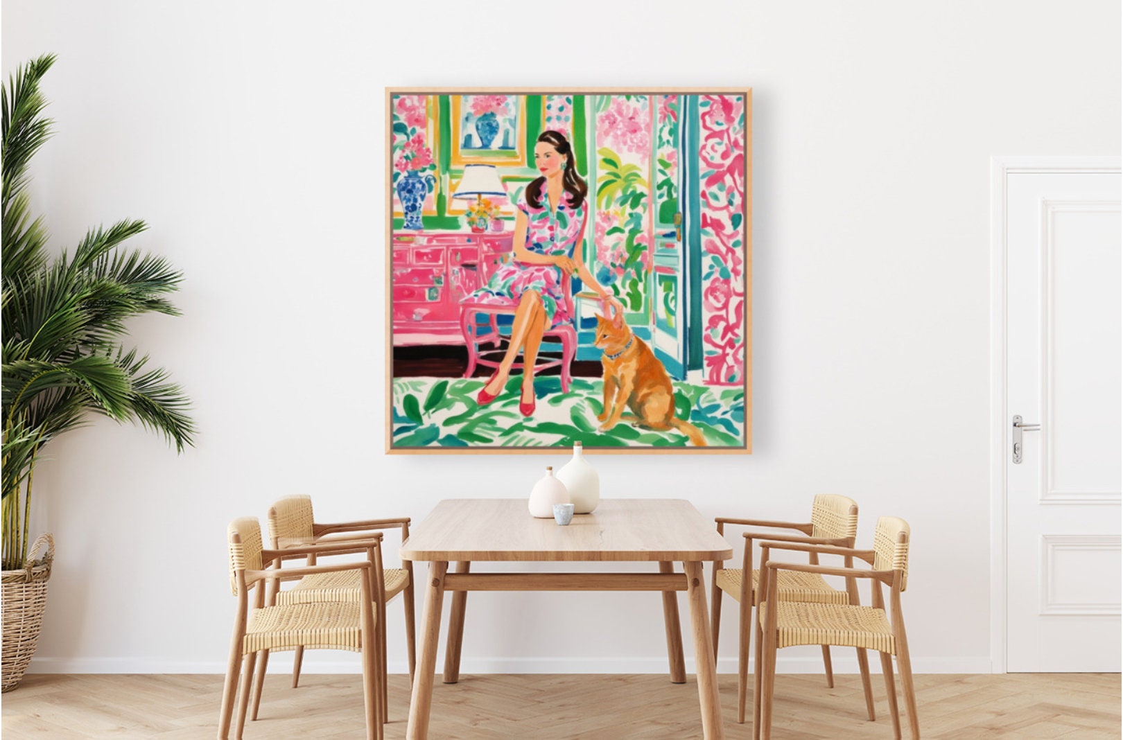 Grandmillennial art, Girl and ginger cat in preppy interior, grandmillennial whimsical print