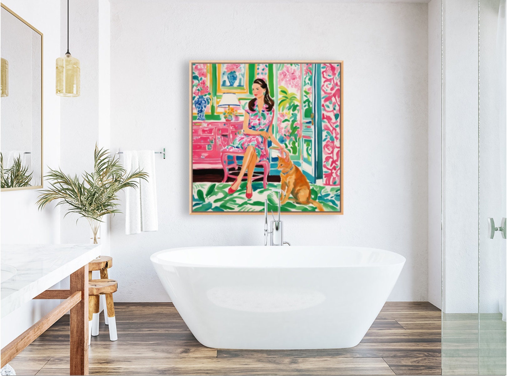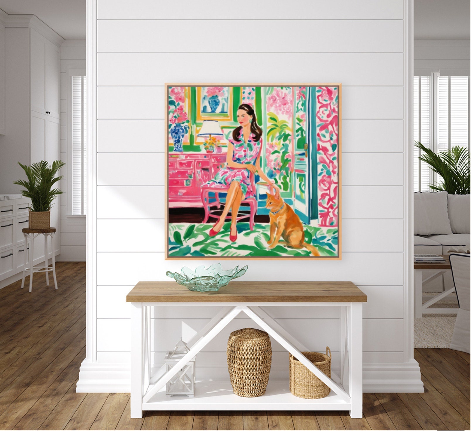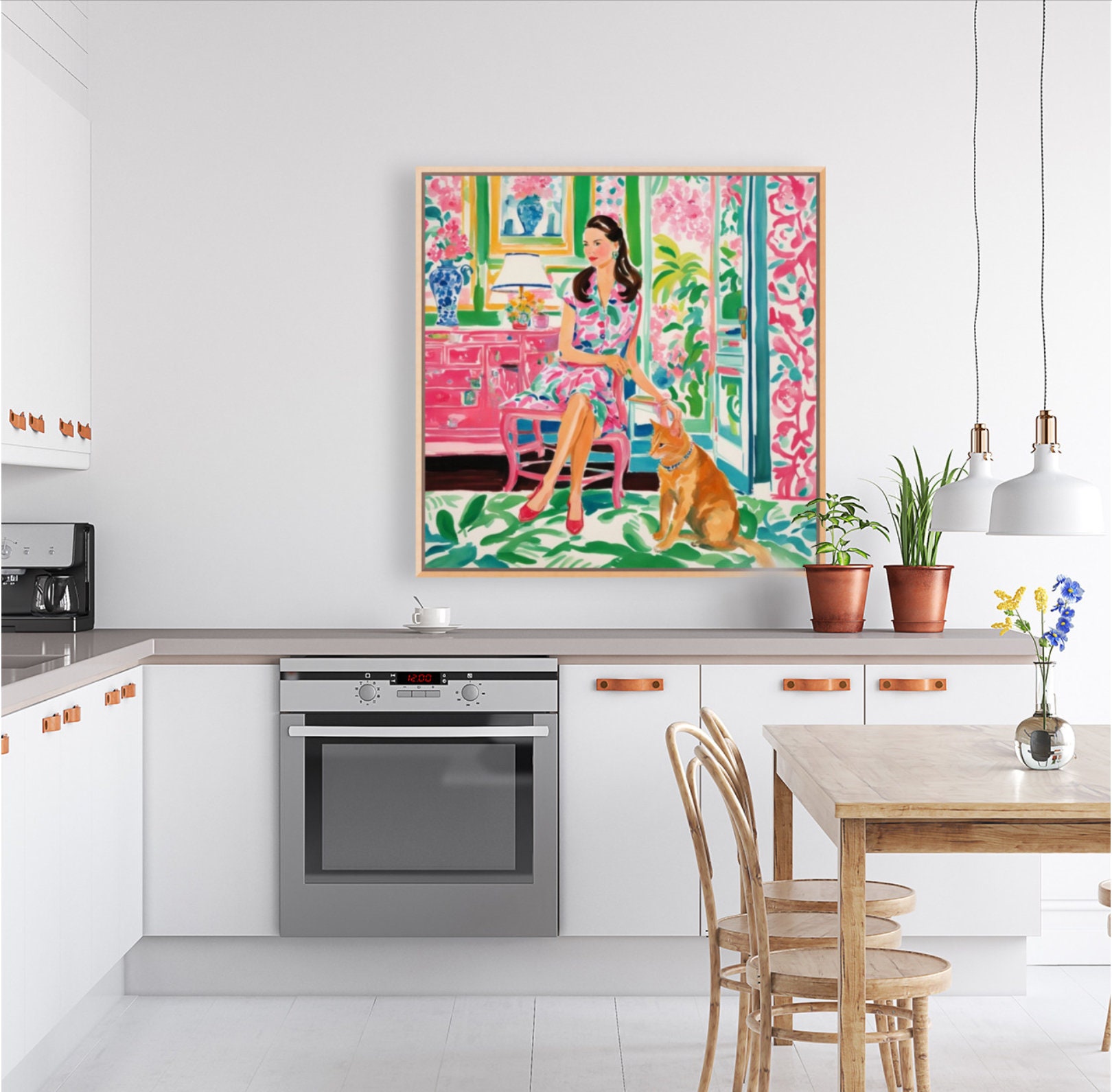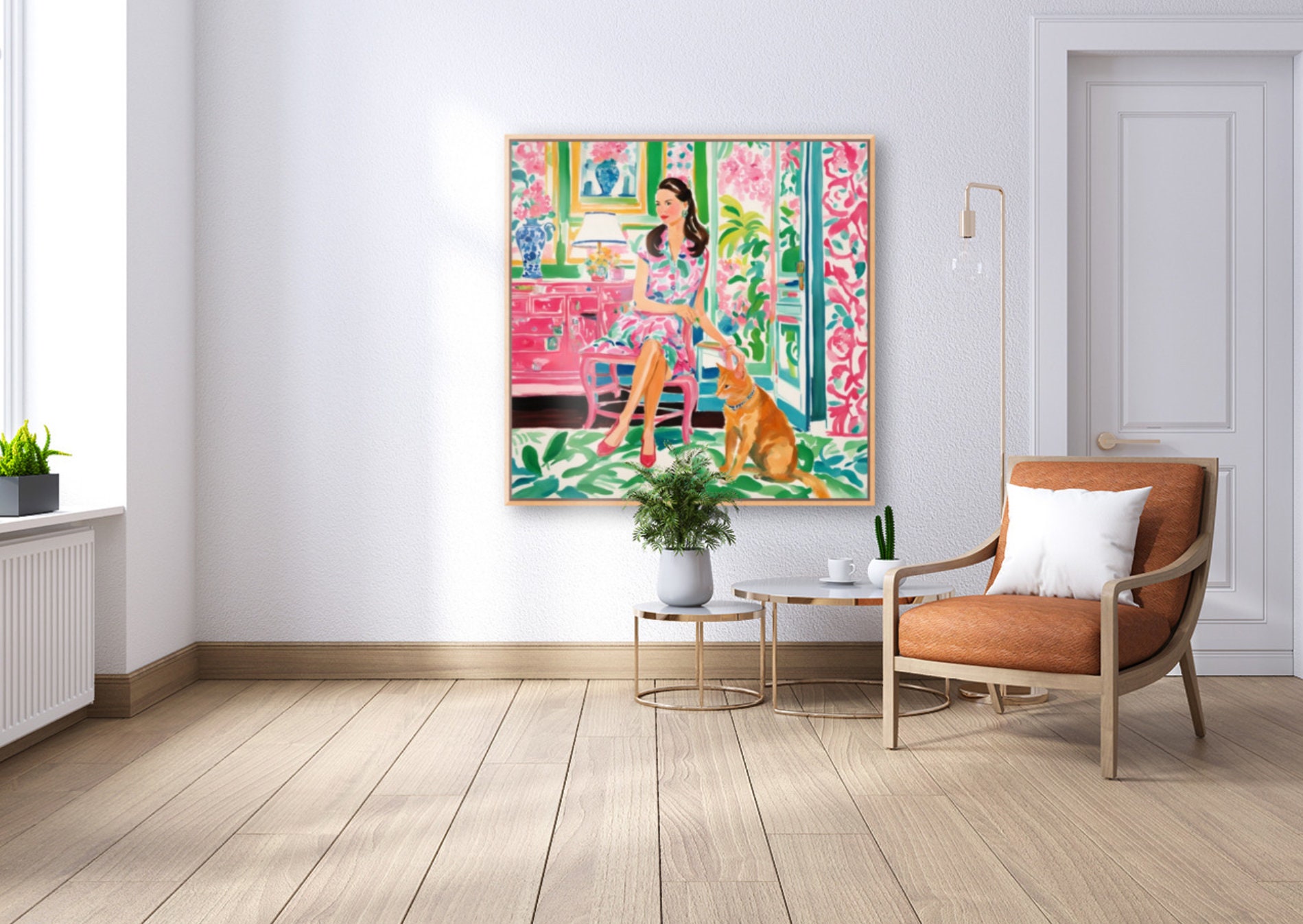 Grandmillennial art, Girl and ginger cat in preppy interior, grandmillennial whimsical print