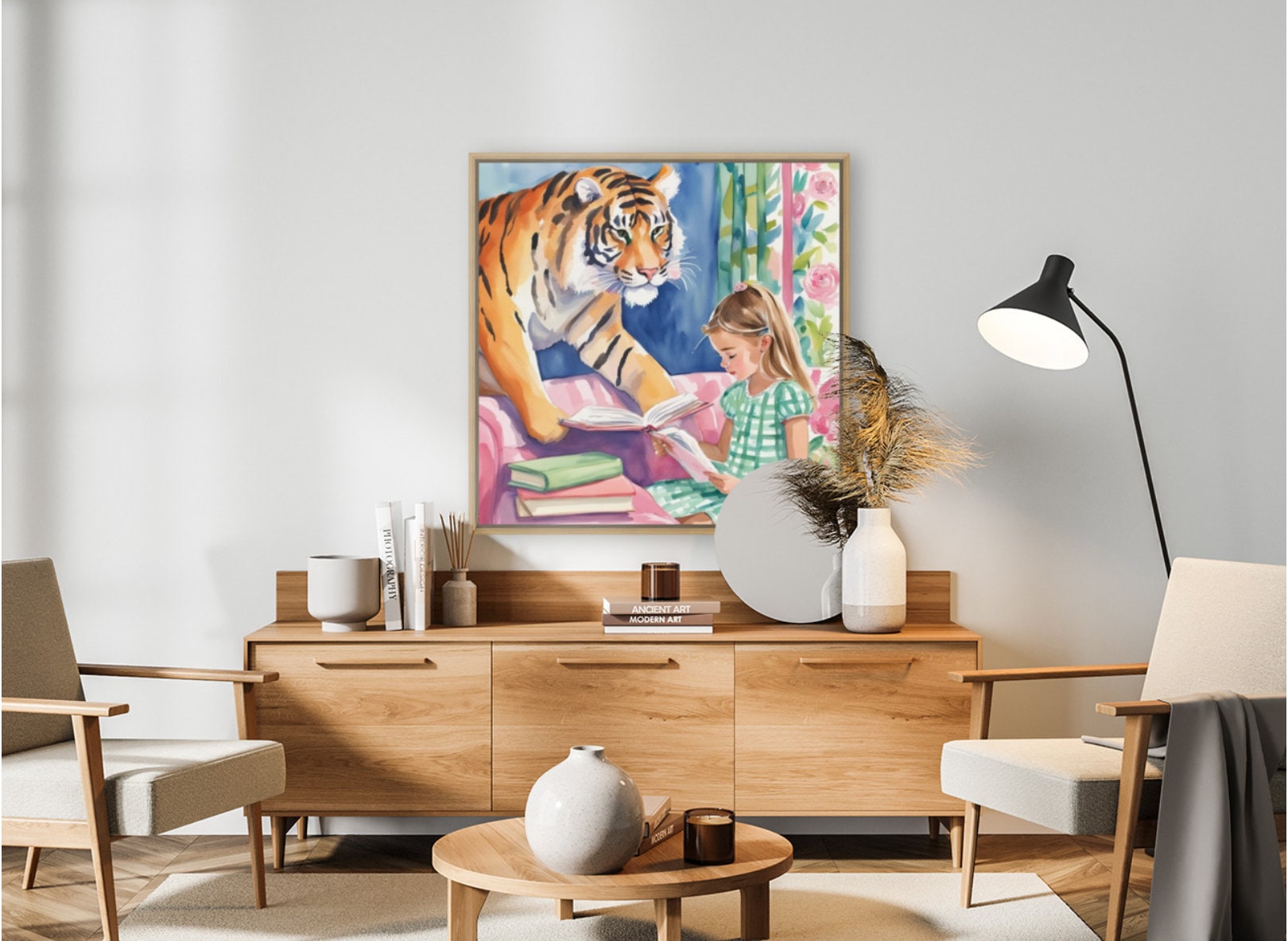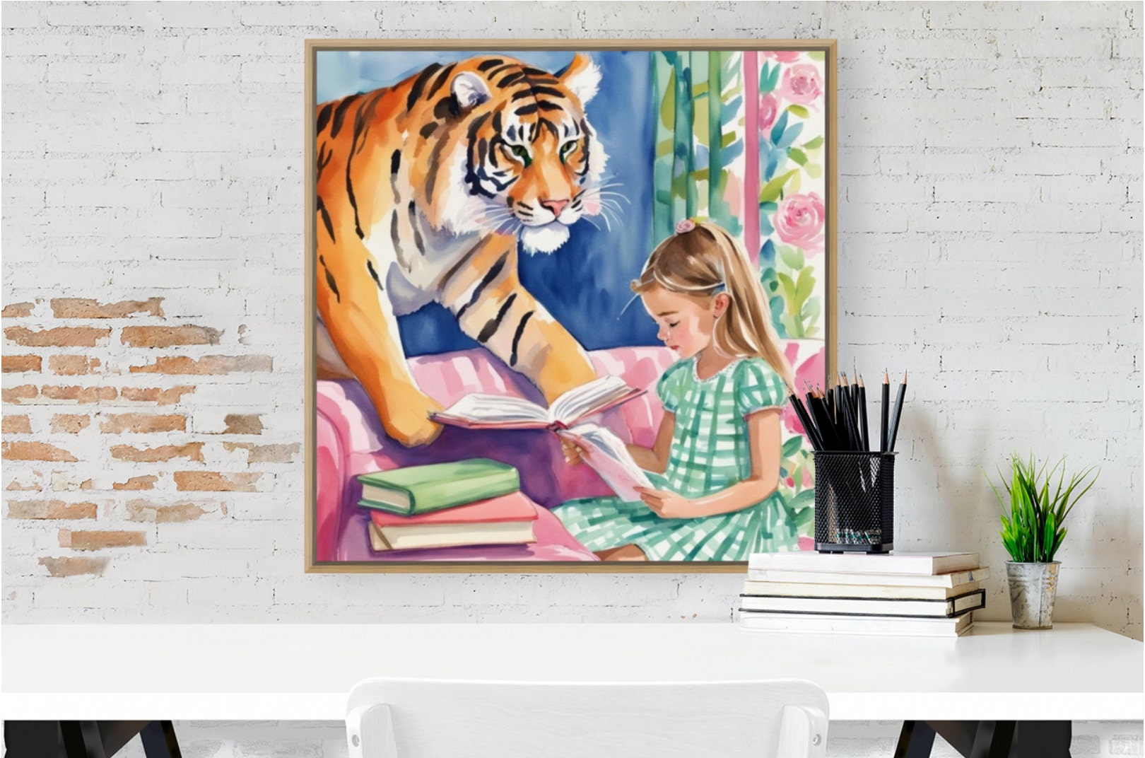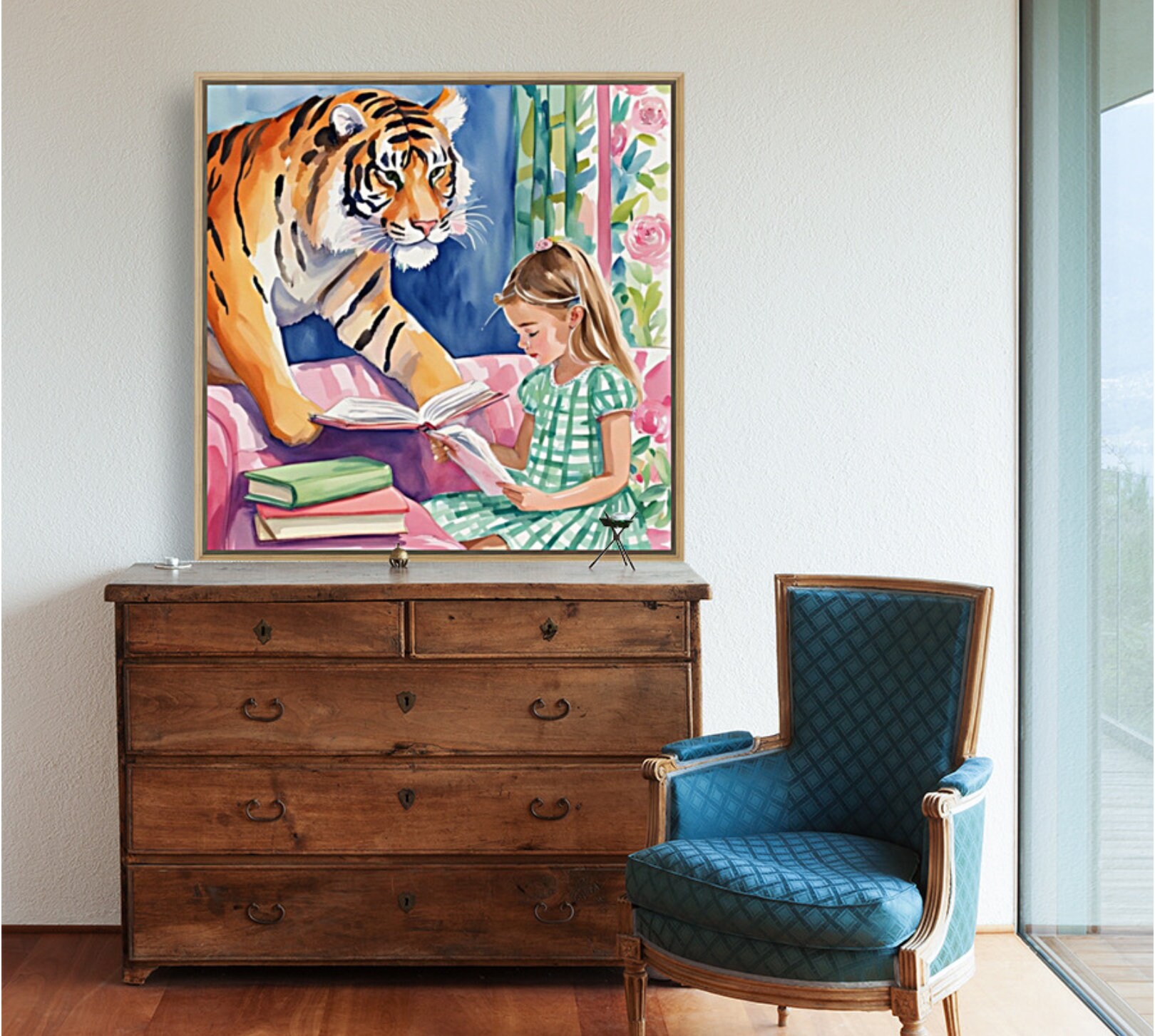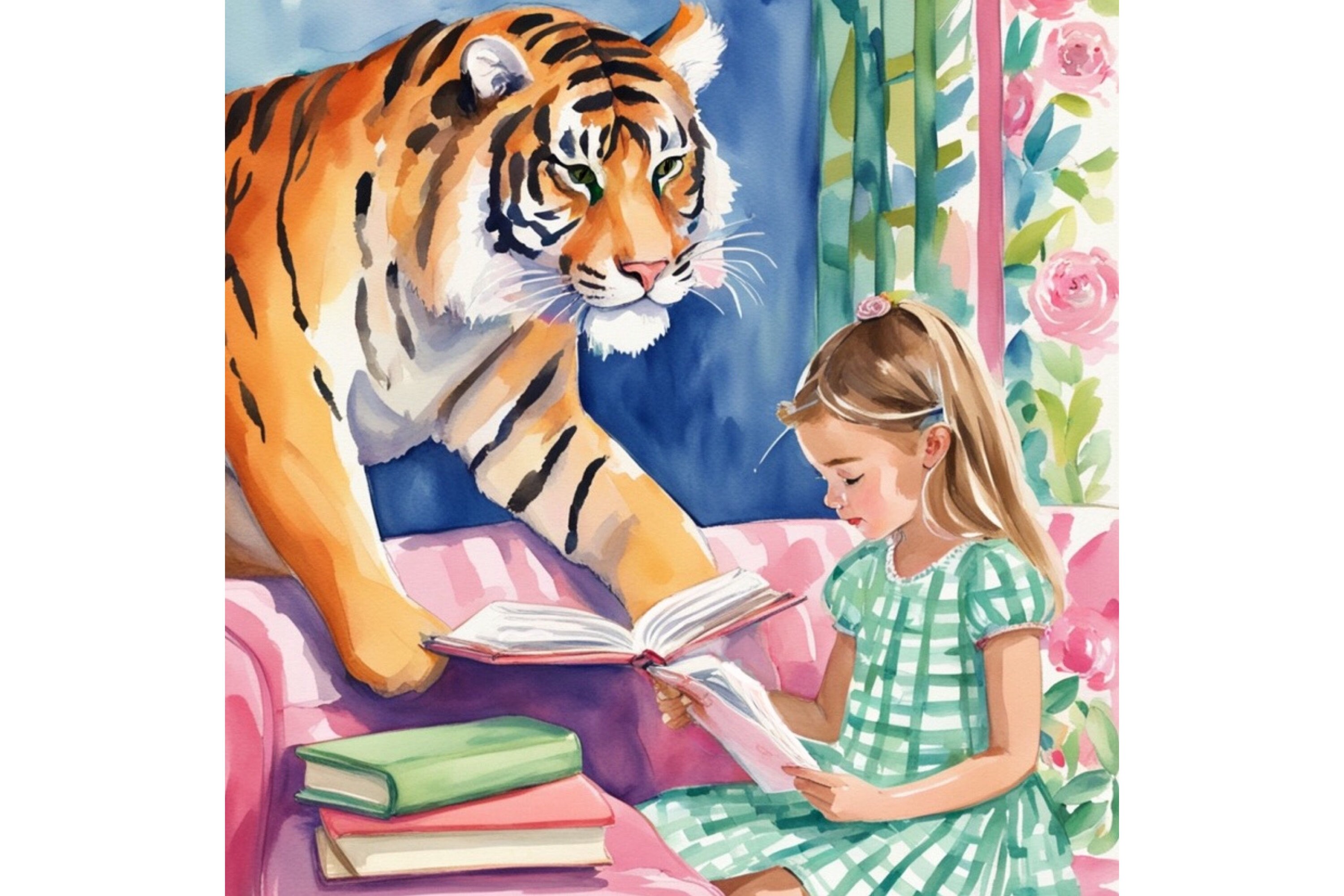 Grandmillennial art, The tiger ate my homework, children illustration watercolor