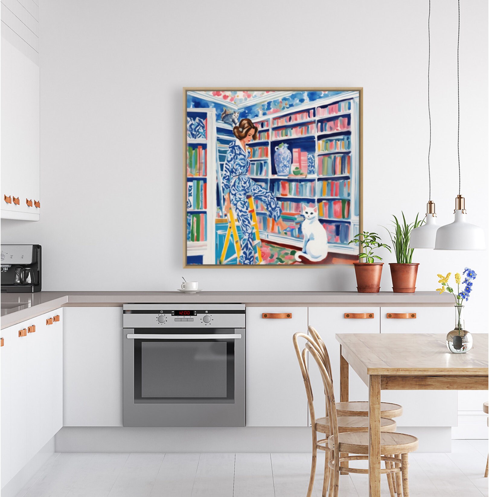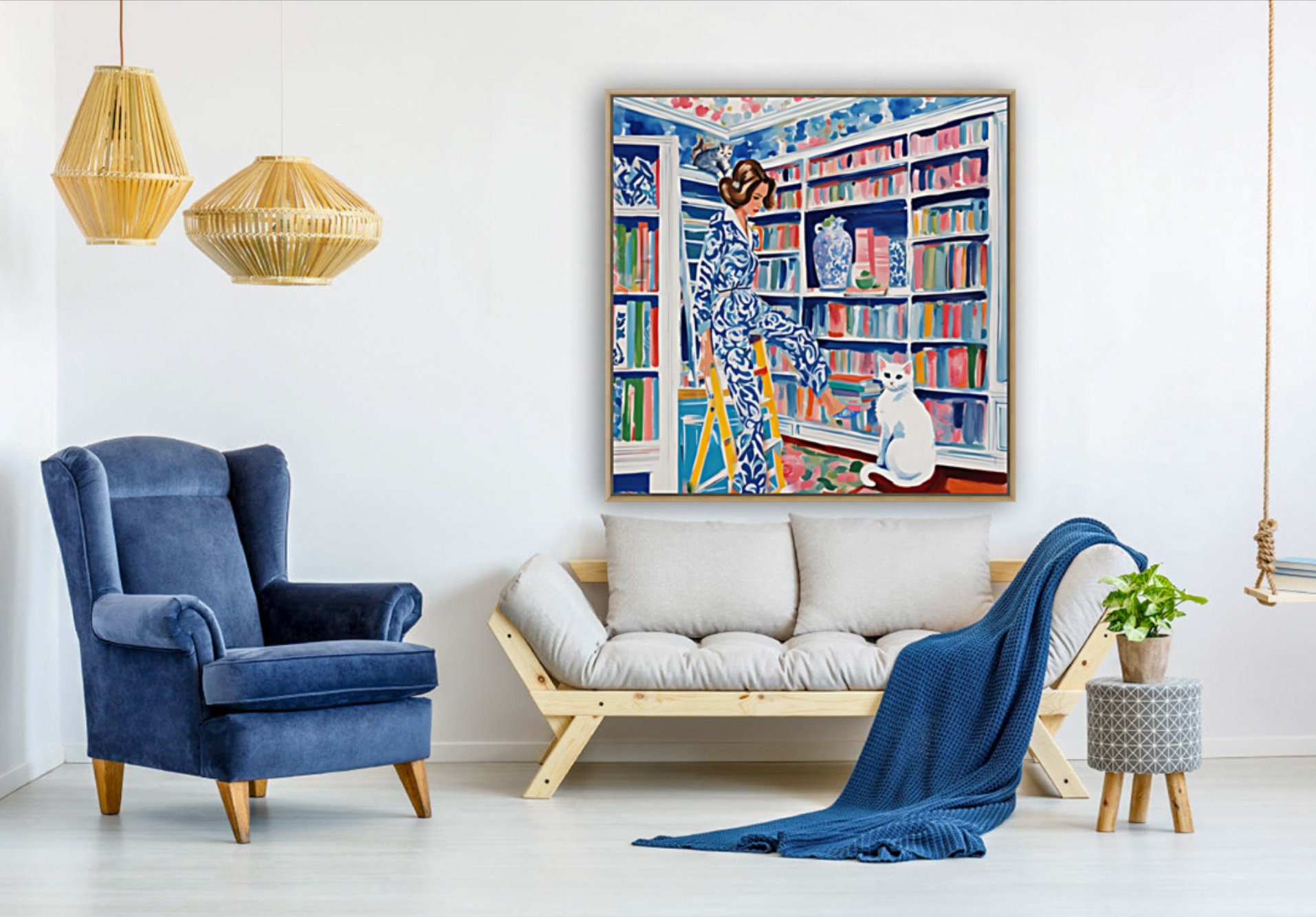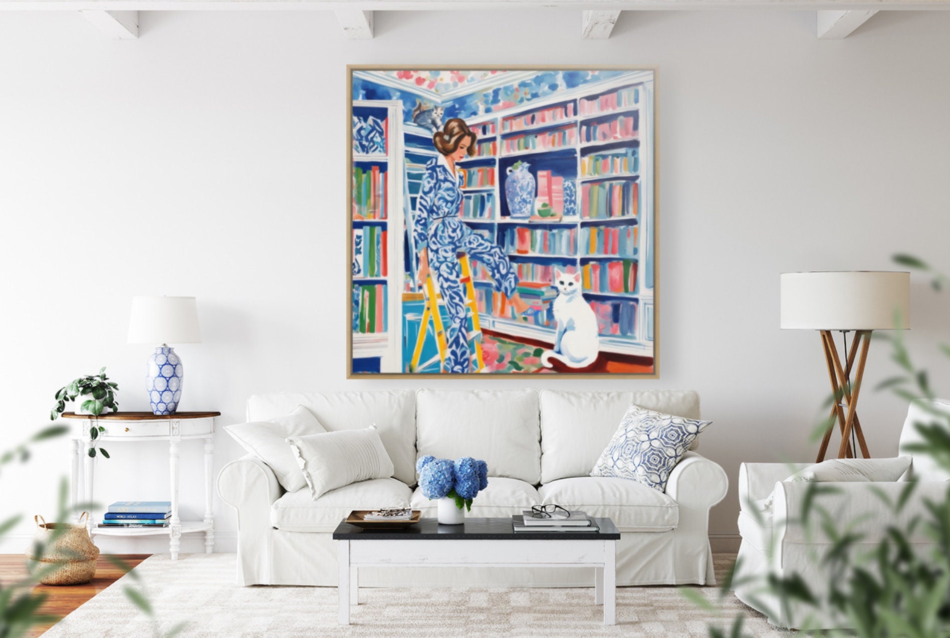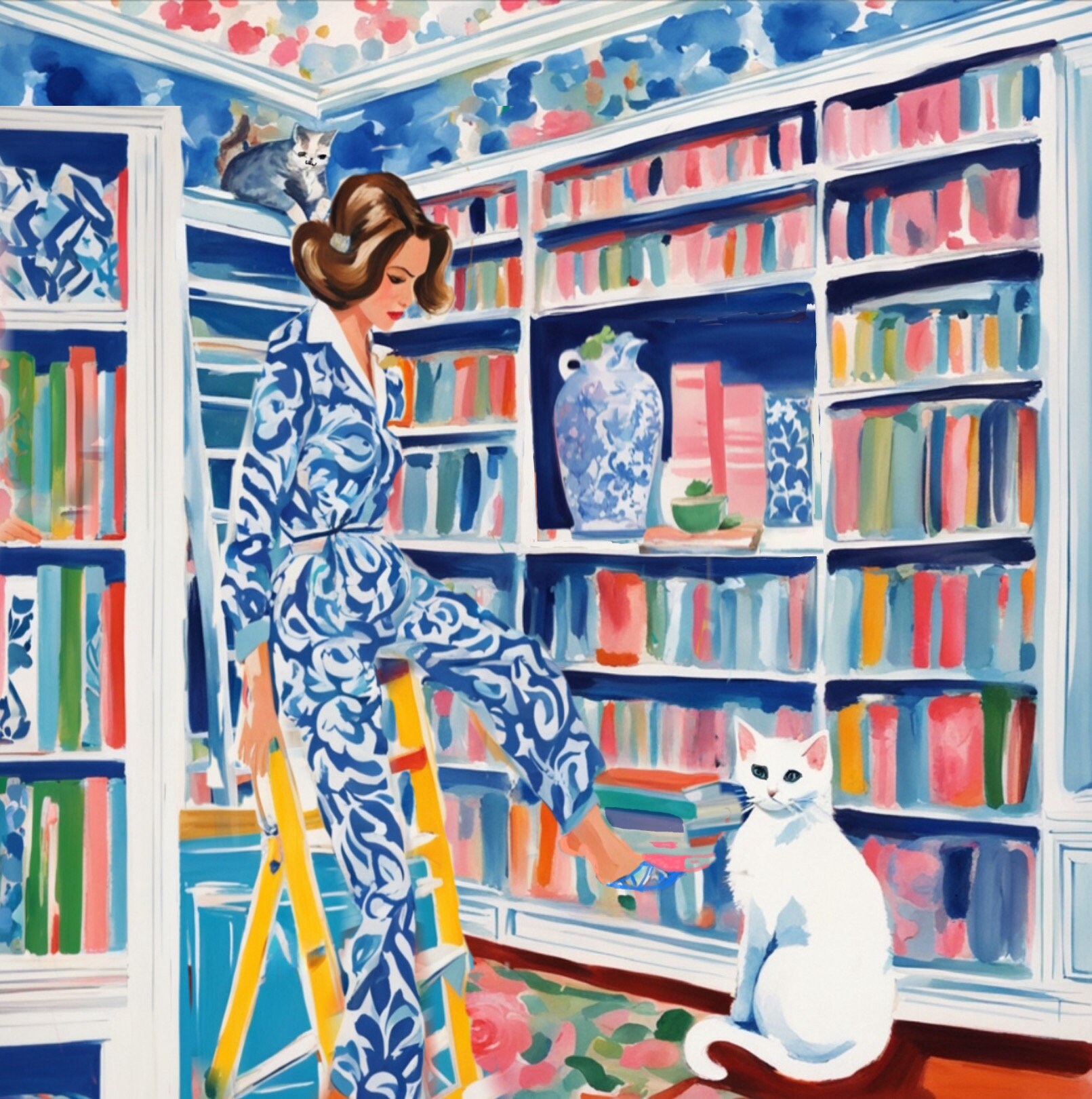 Grandmillennial art, In the library, preppy whimsical painting, girly art