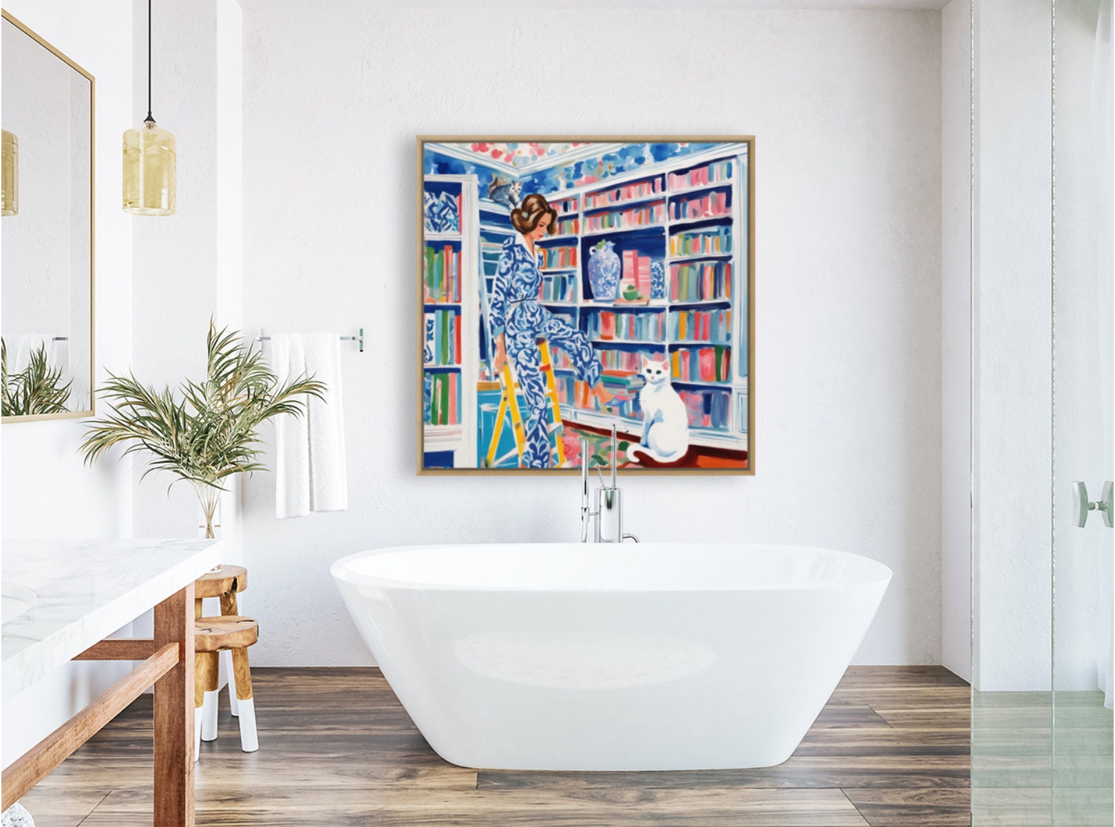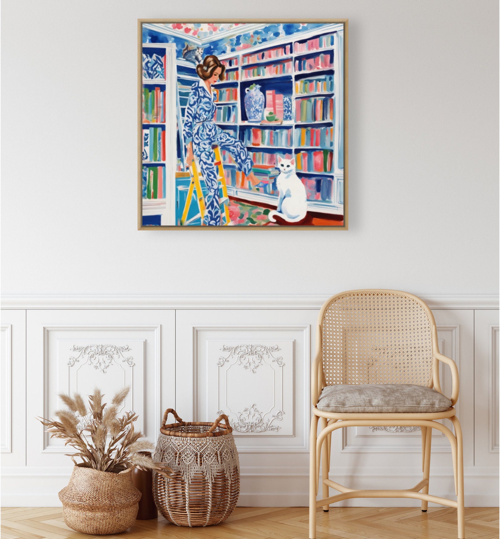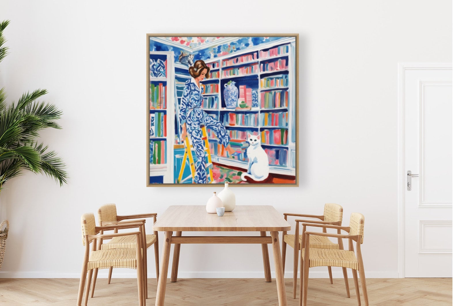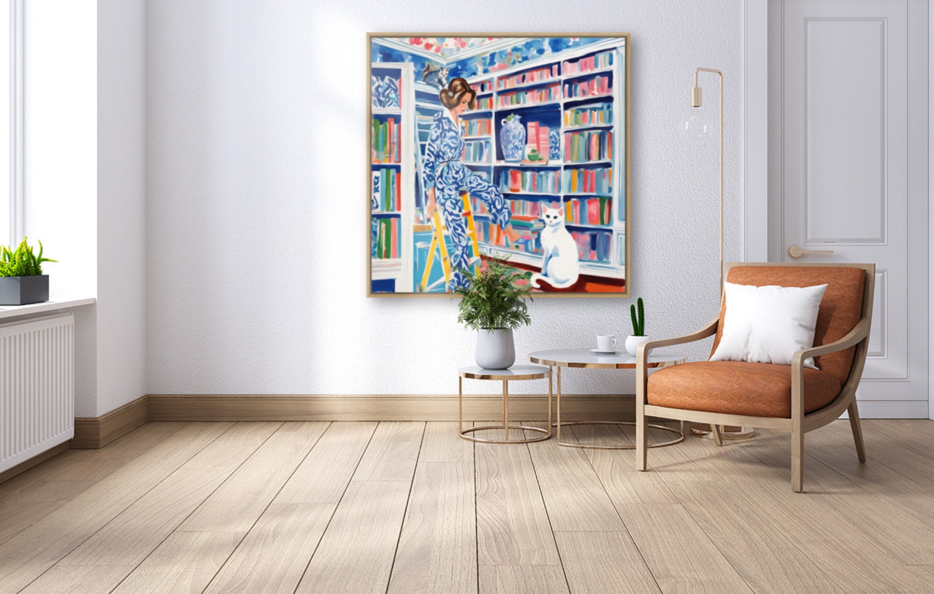 Grandmillennial art, In the library, preppy whimsical painting, girly art