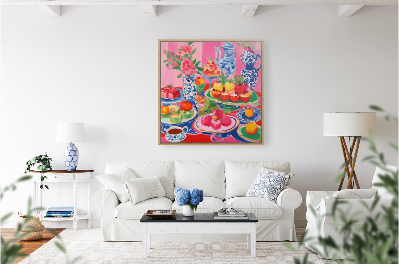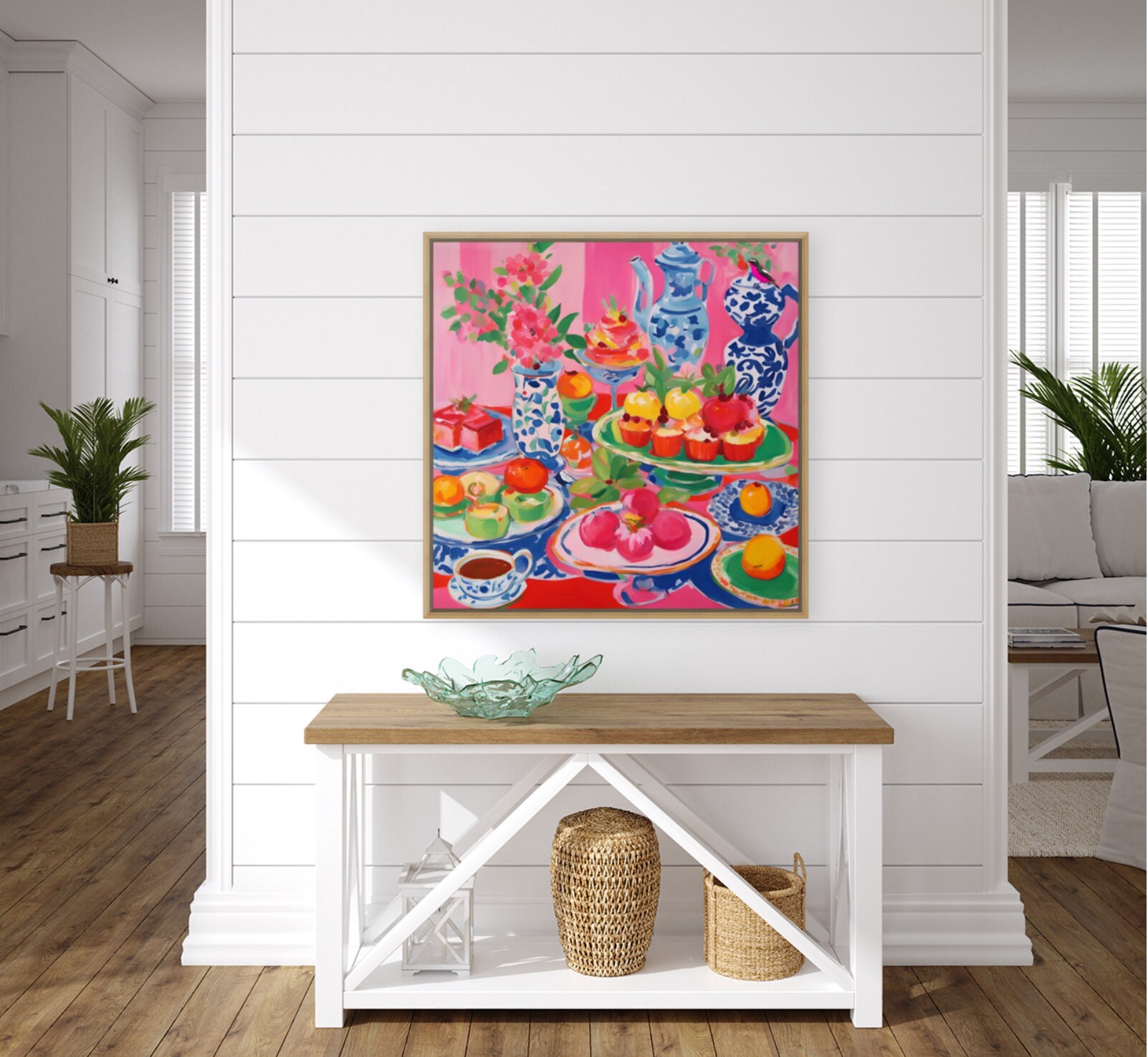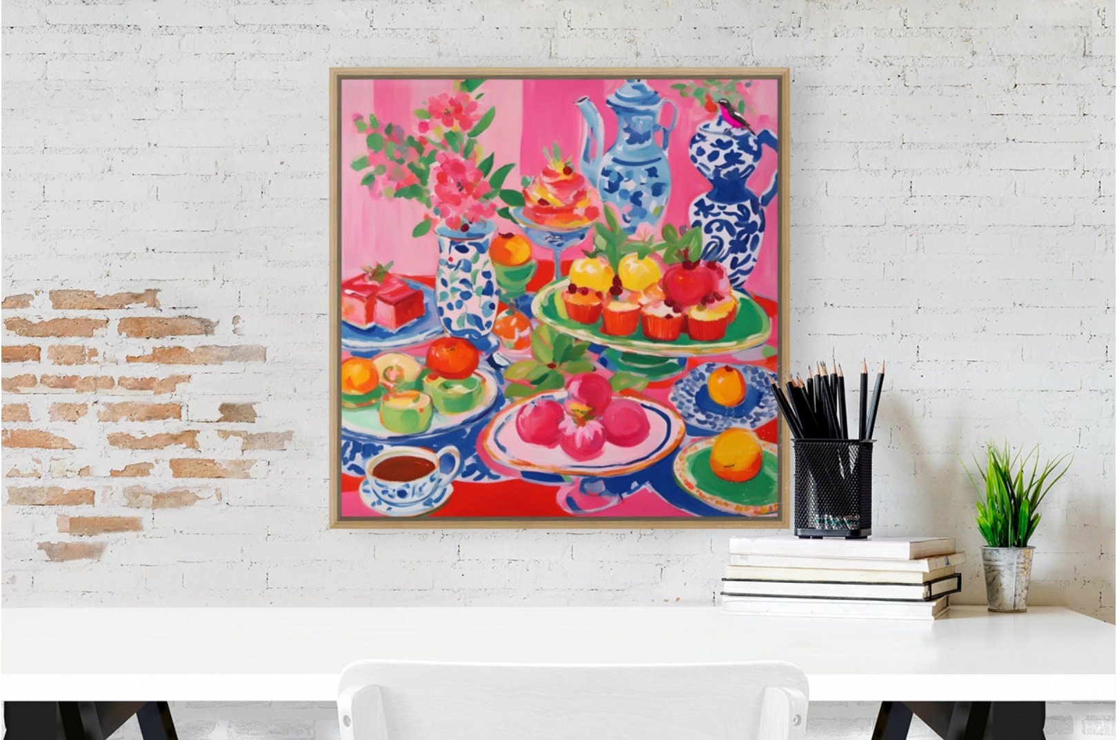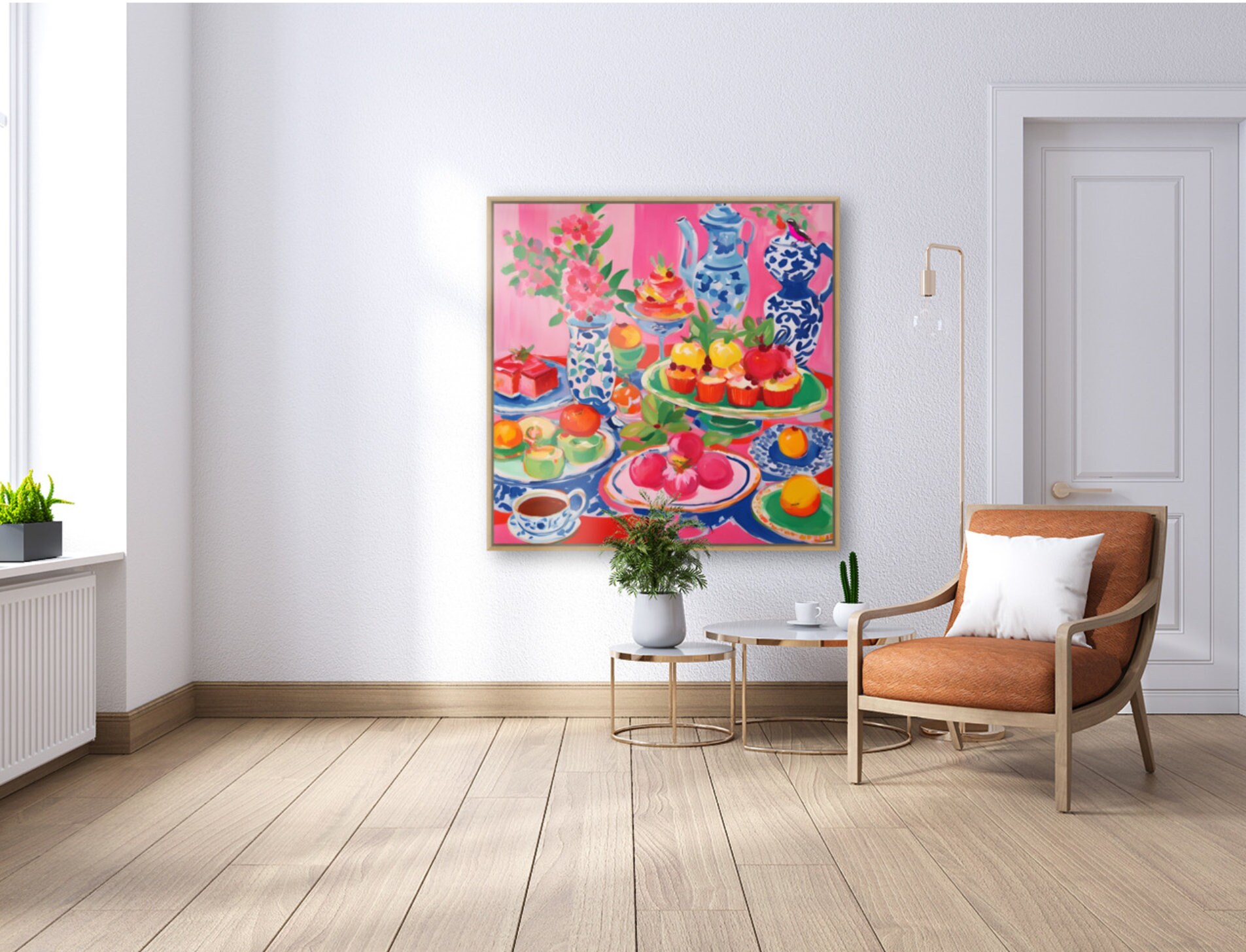 Grandmillennial art, Preppy English tea and cakes, whimsical watercolor