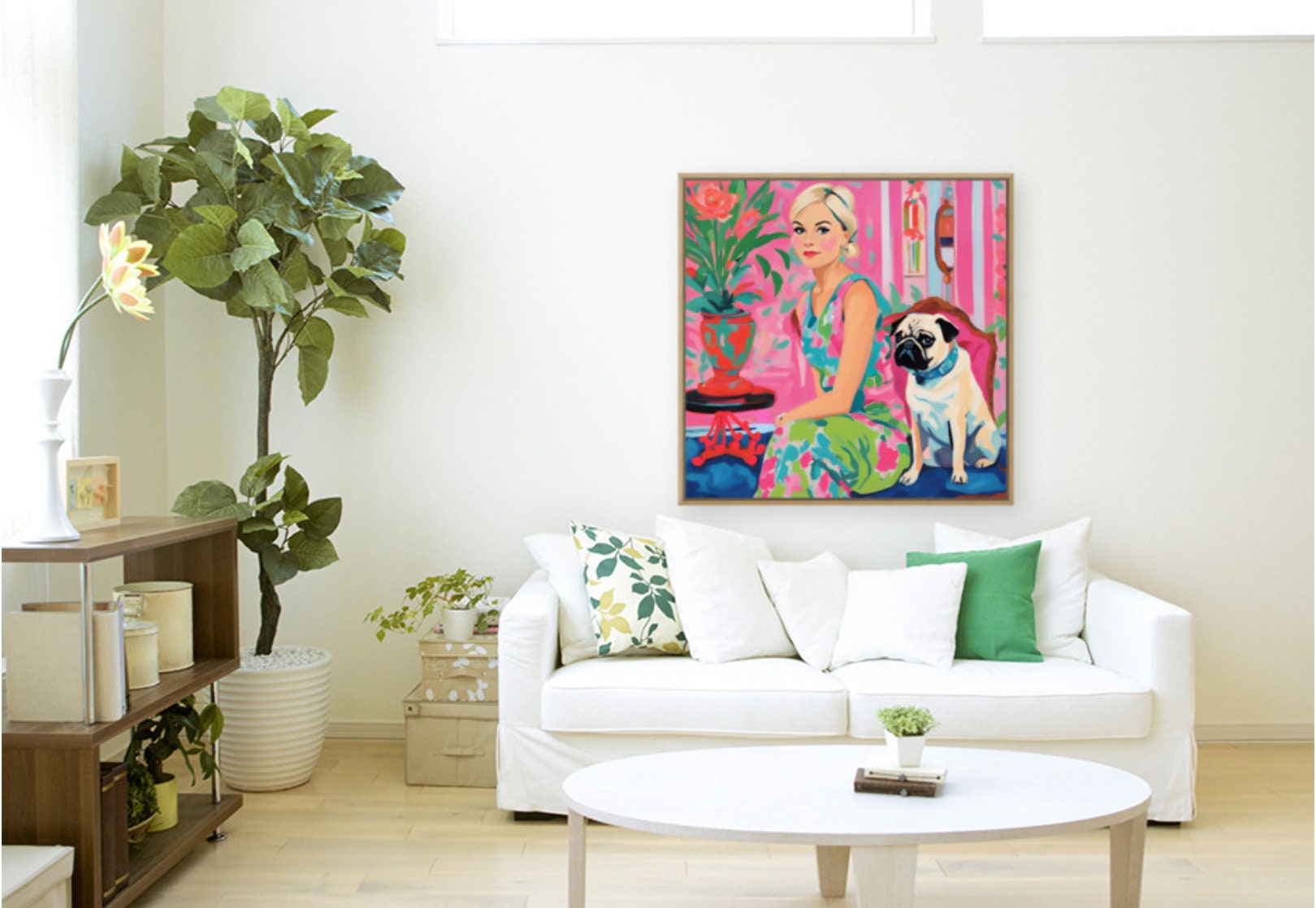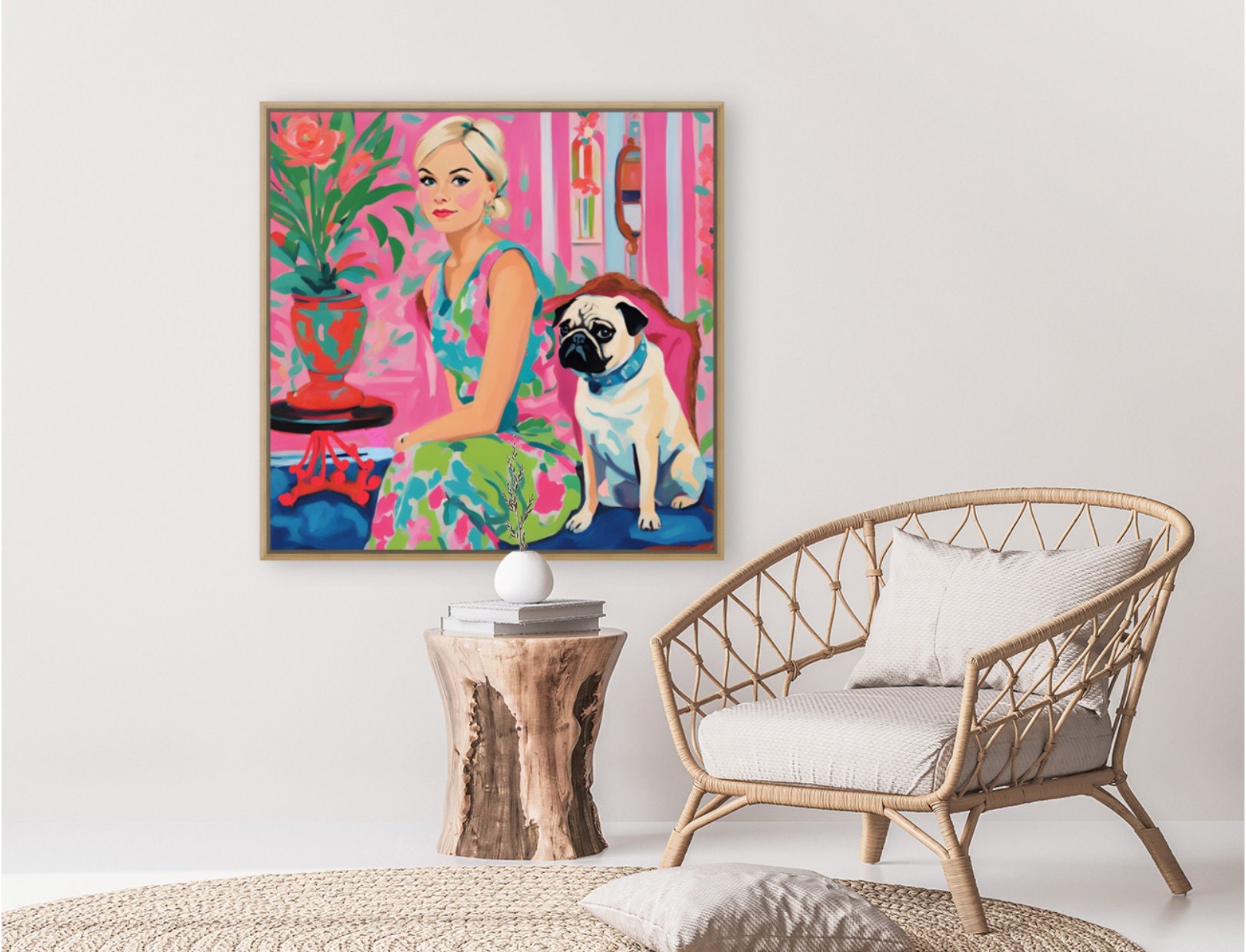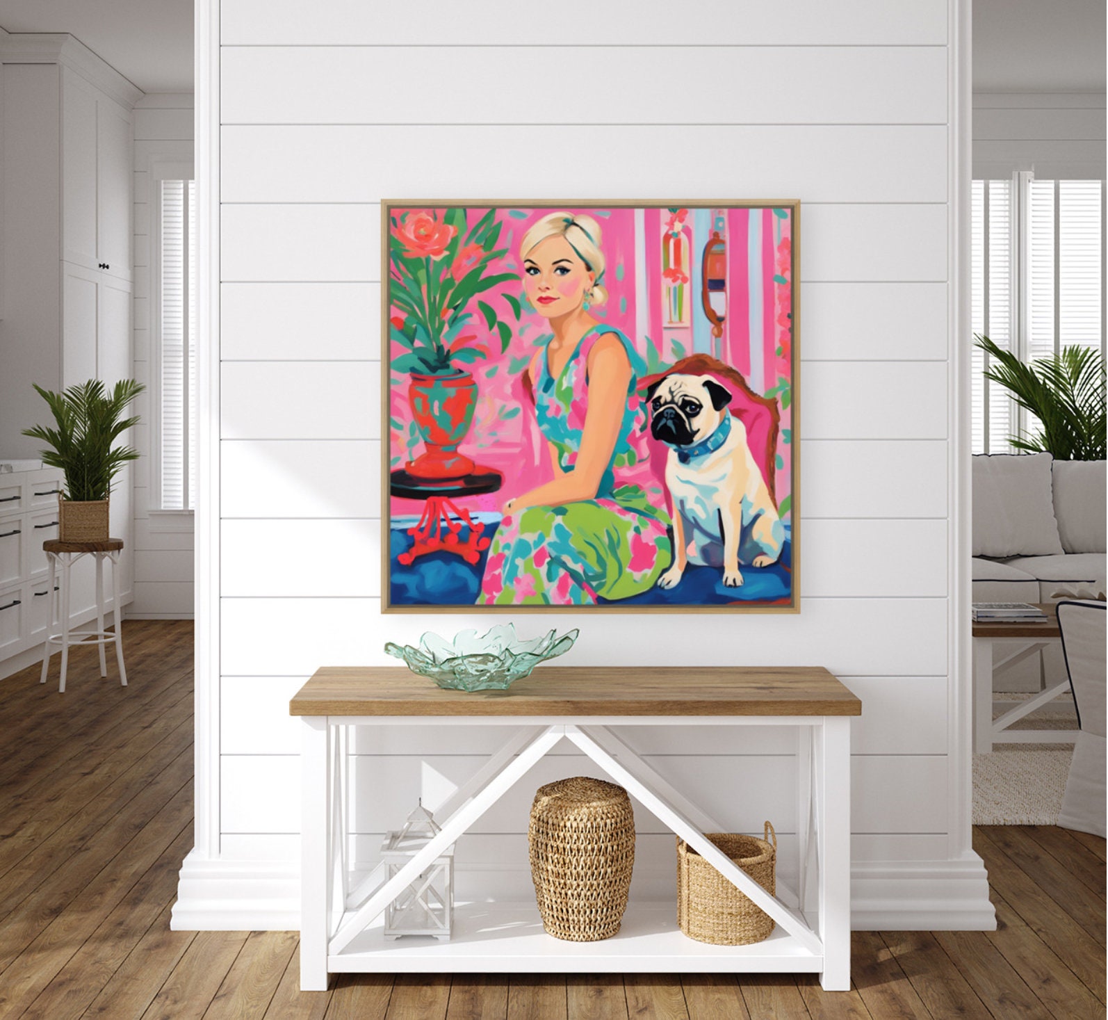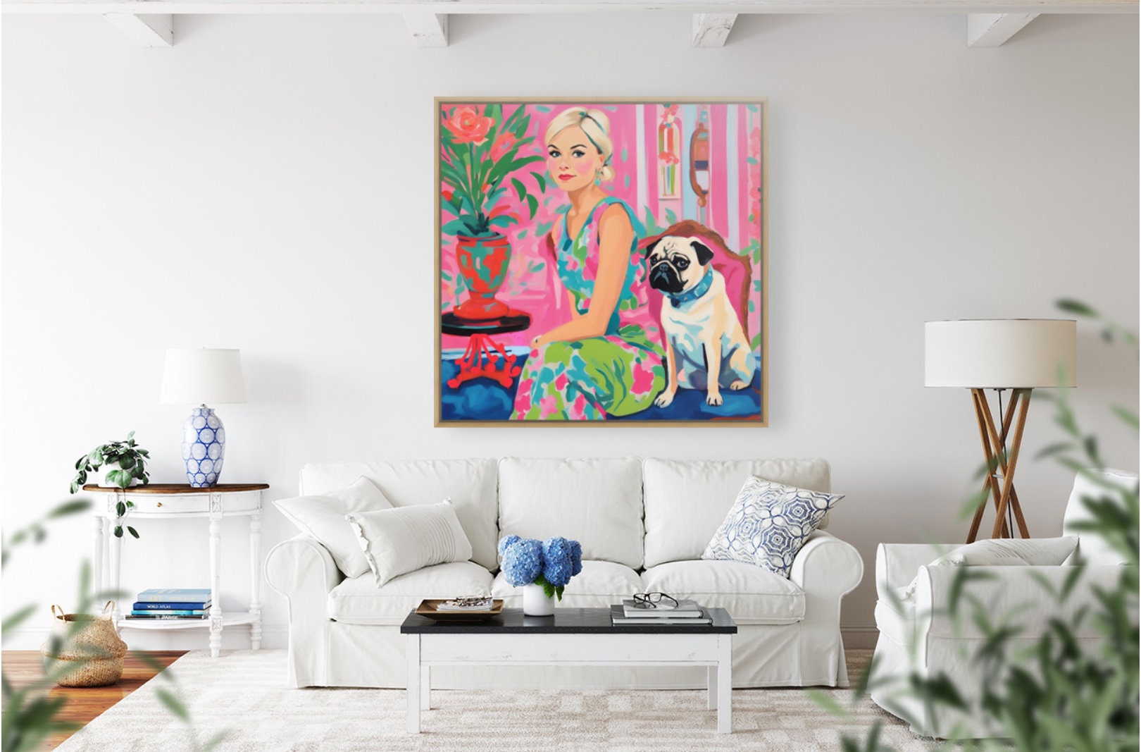Grandmillennial art, Girl and her pug in preppy interior, whimsical watercolor