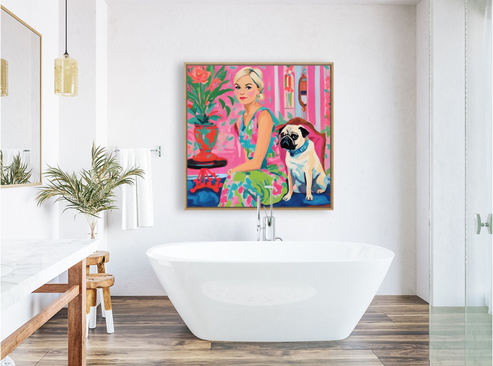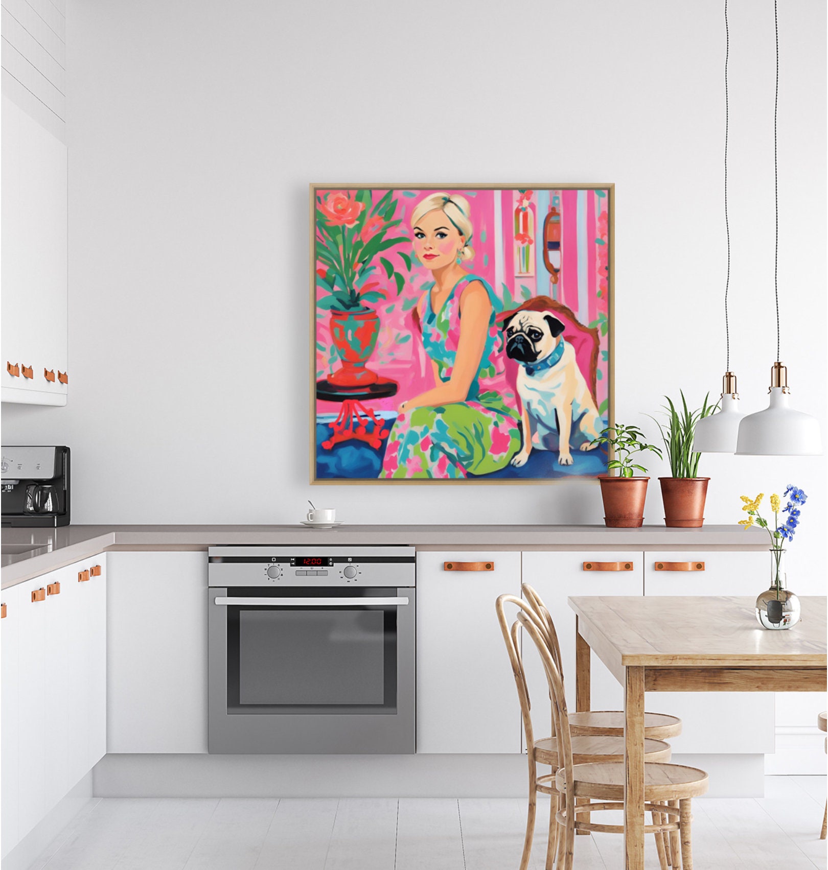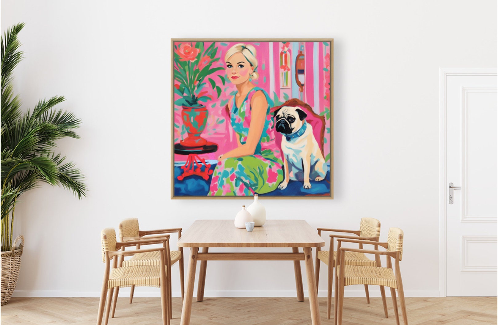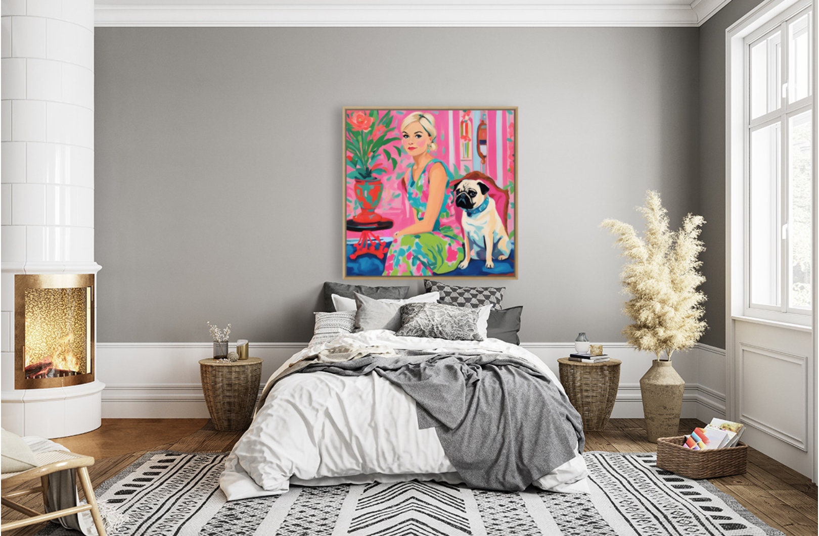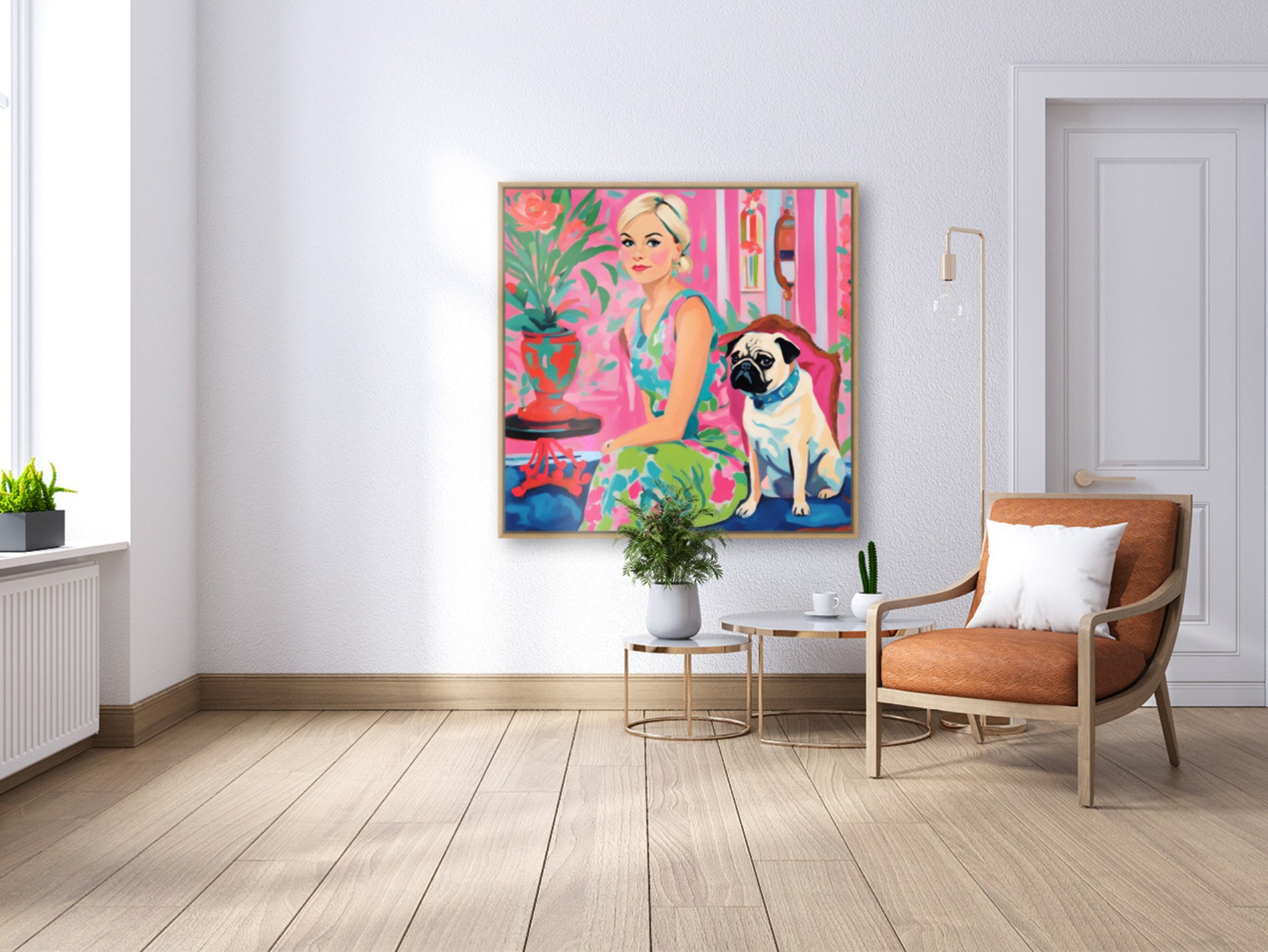 Grandmillennial art, Girl and her pug in preppy interior, whimsical watercolor