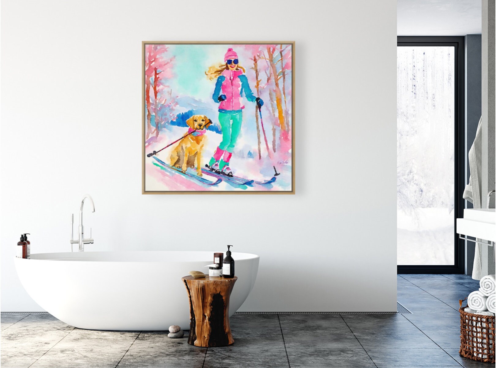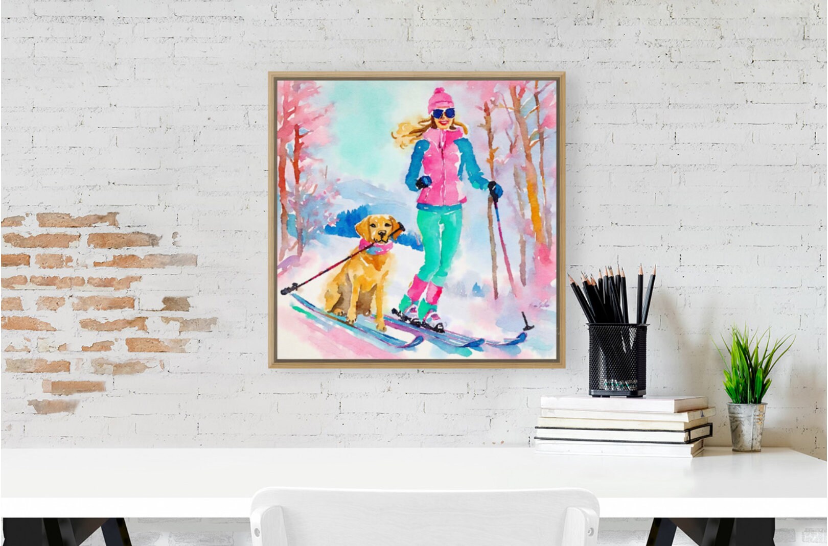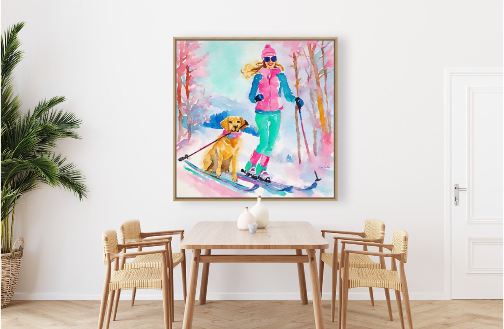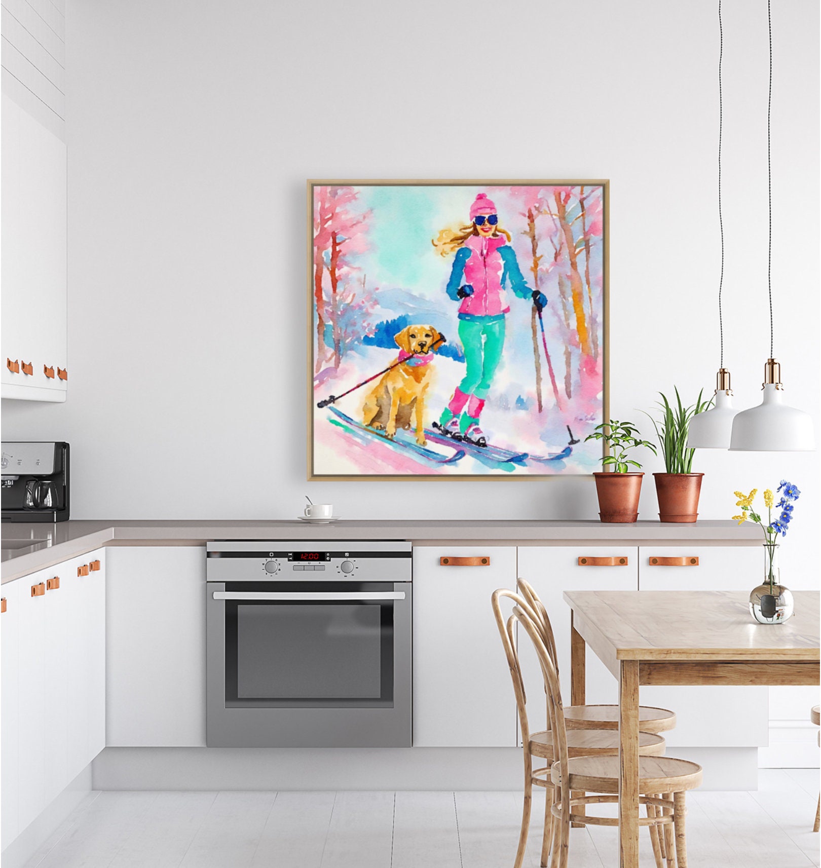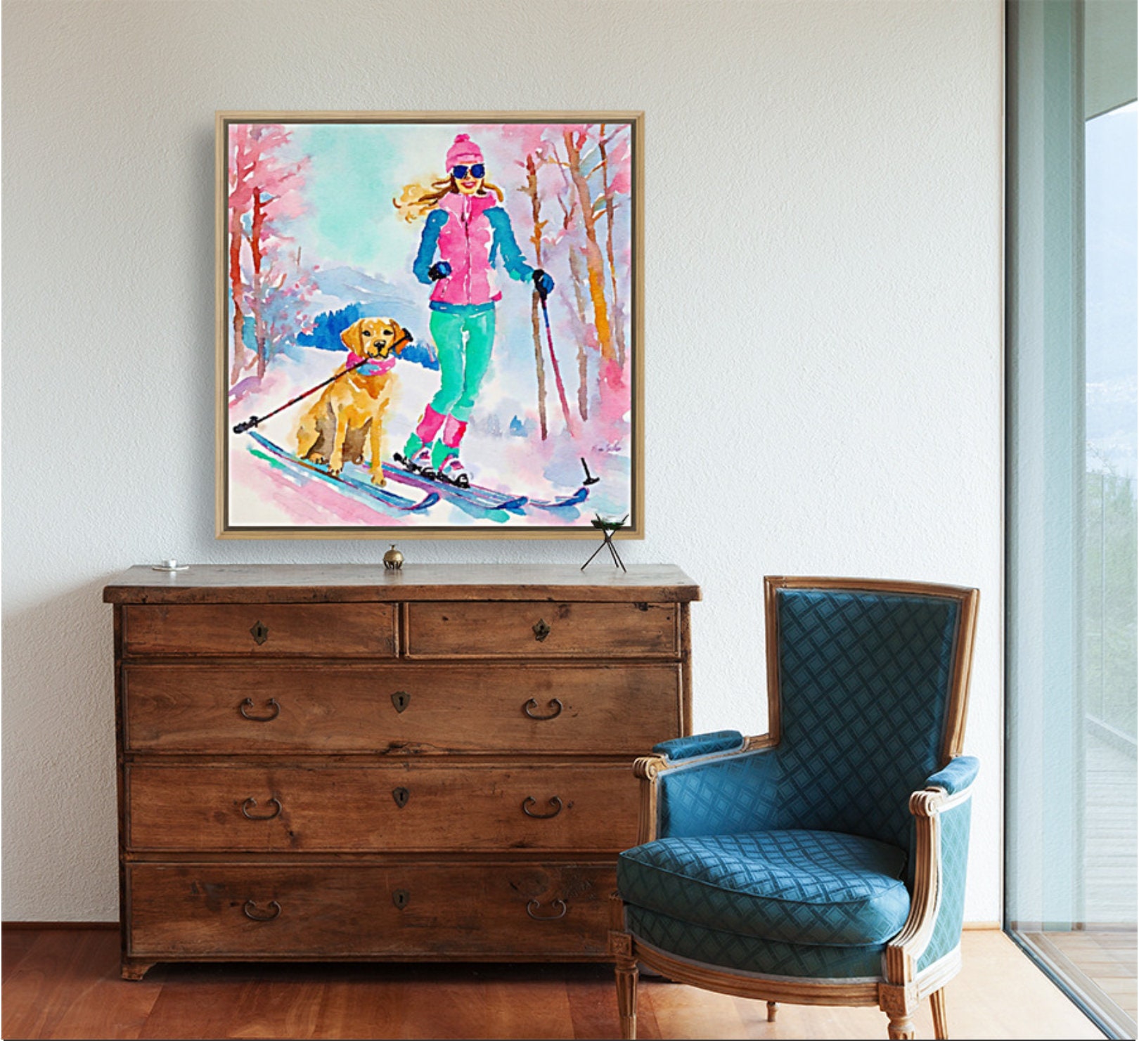 Ski painting, ski art, a preppy girl and golden retriever skiing
