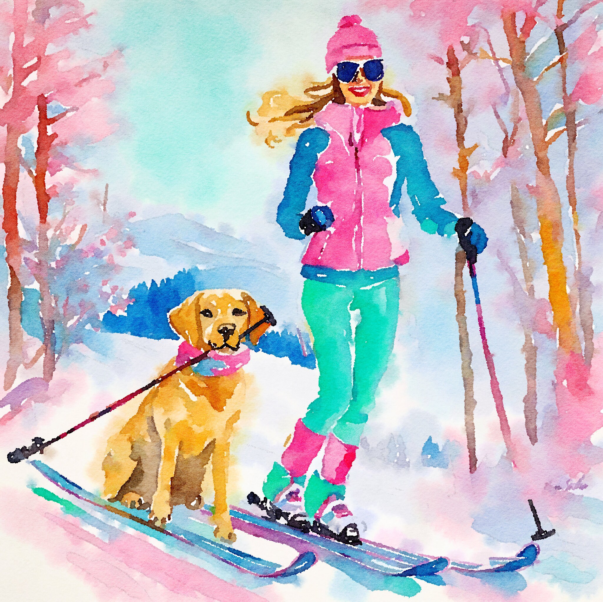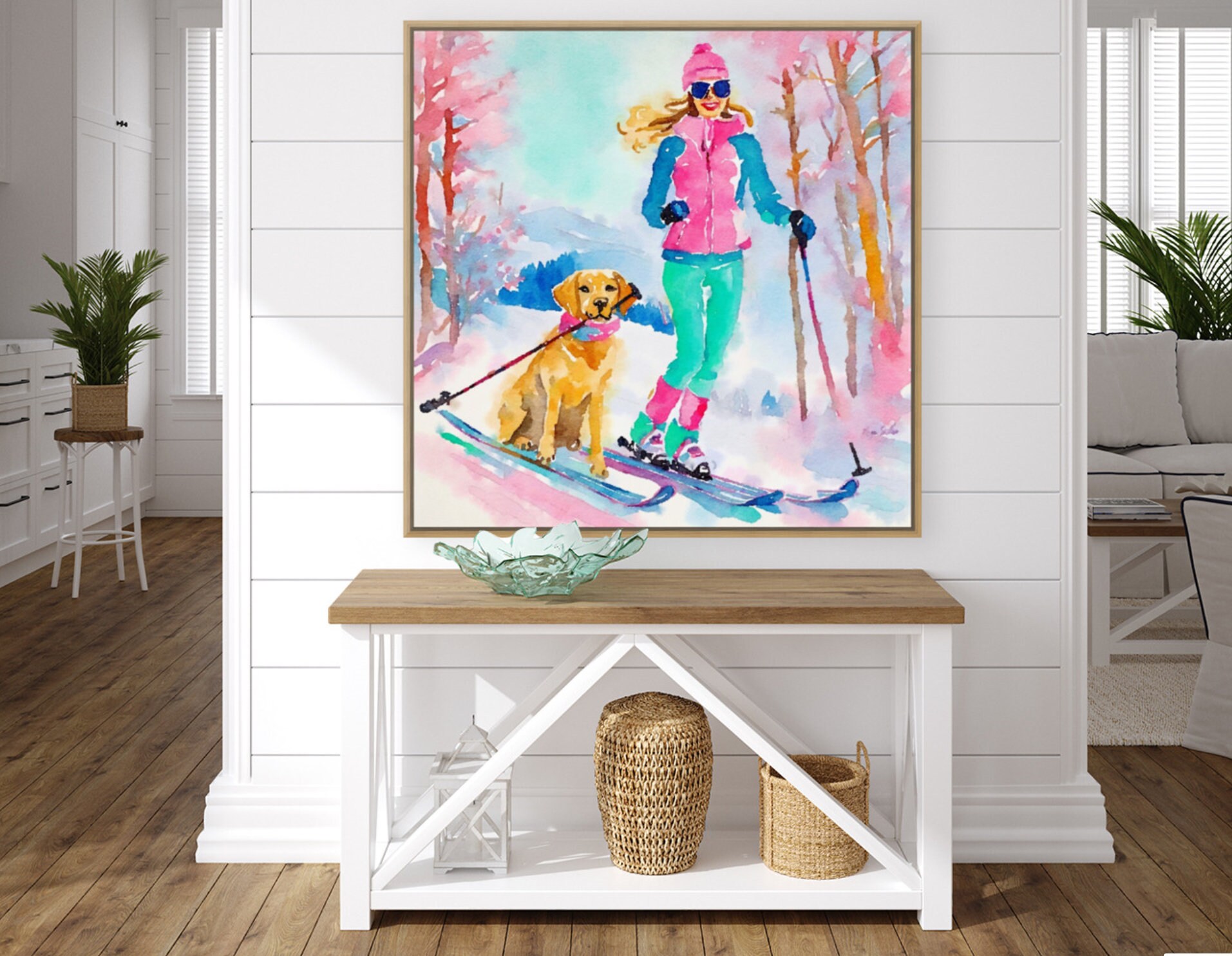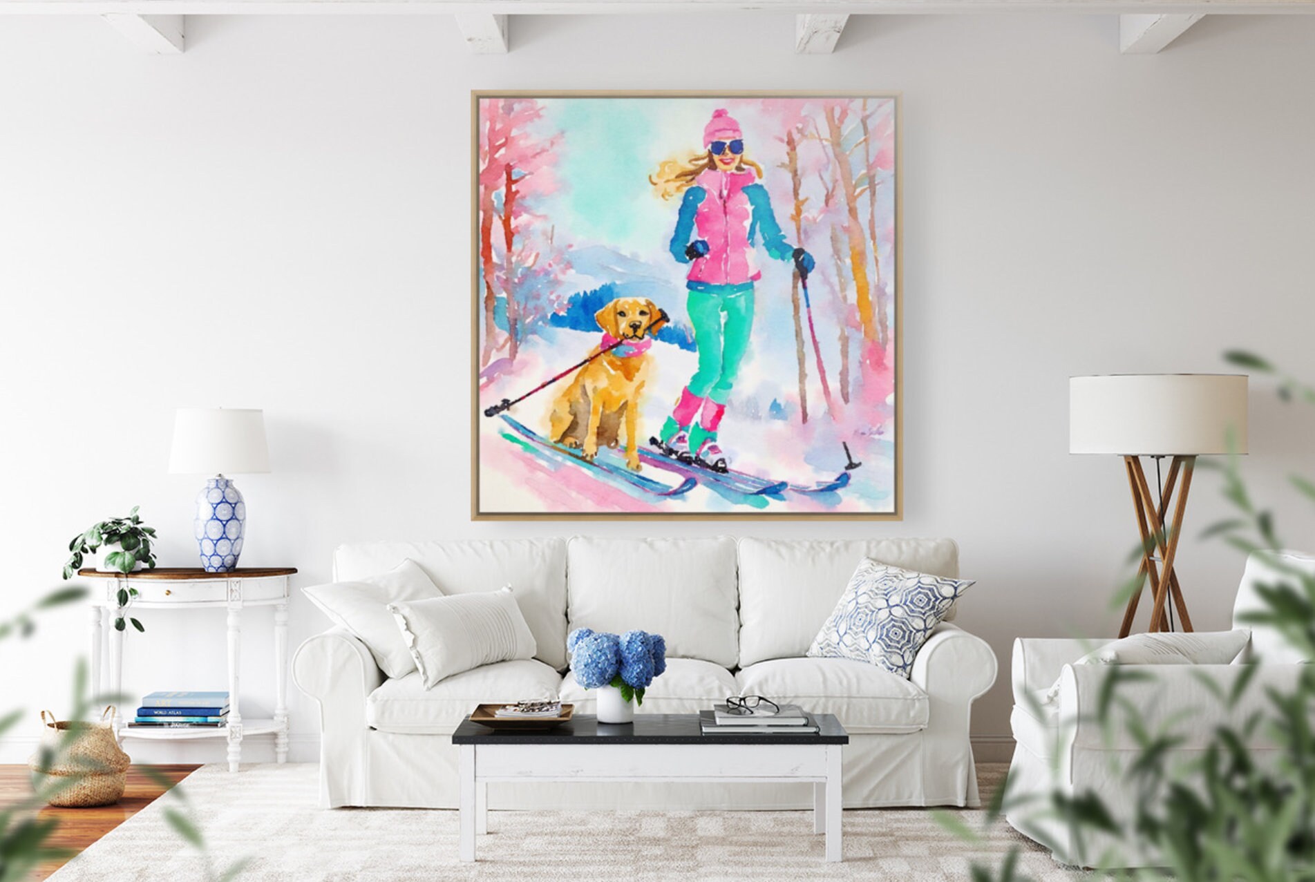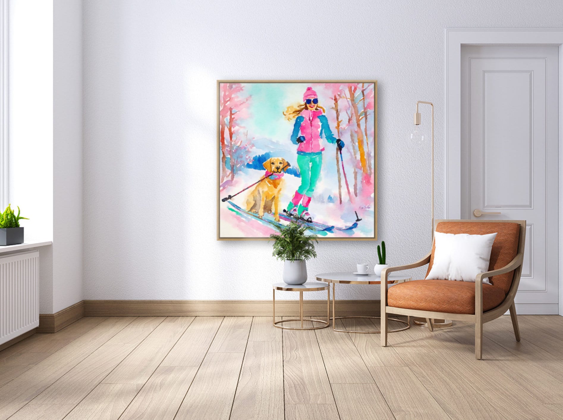 PLEASE NOTE SIZES ARE IN CM. My new painting. Large watercolor painting on 300gsm off-white watercolor paper. 60x60 cm. Preppy glam girl skiing with her golden retriever. Varnished with watercolor spray varnish. Ships in a tube unless requested flat.