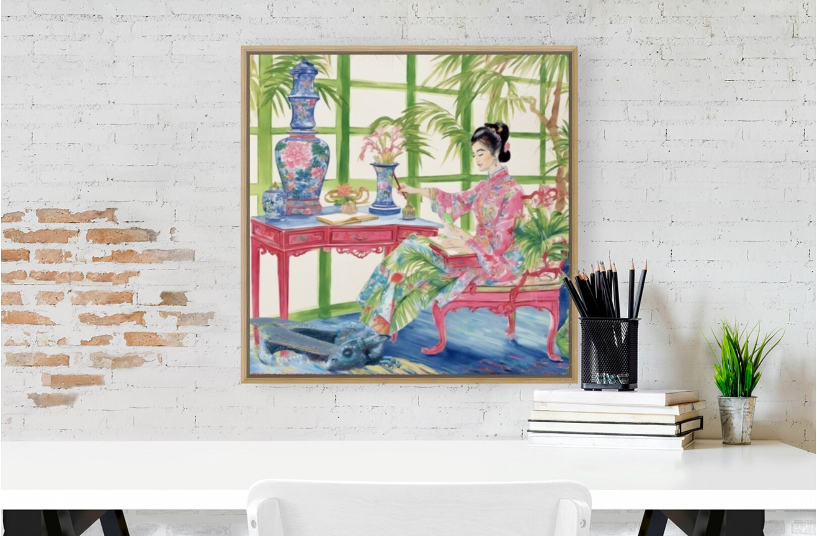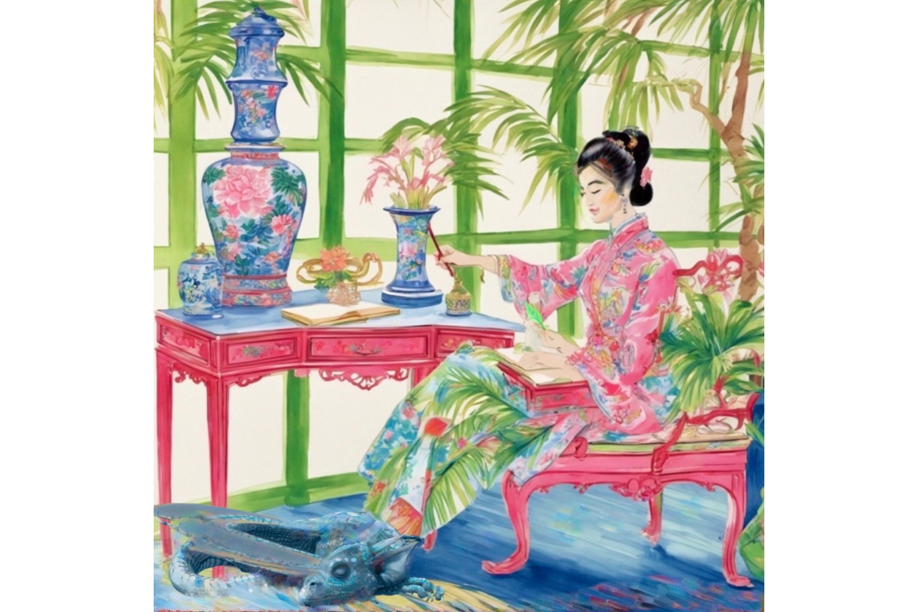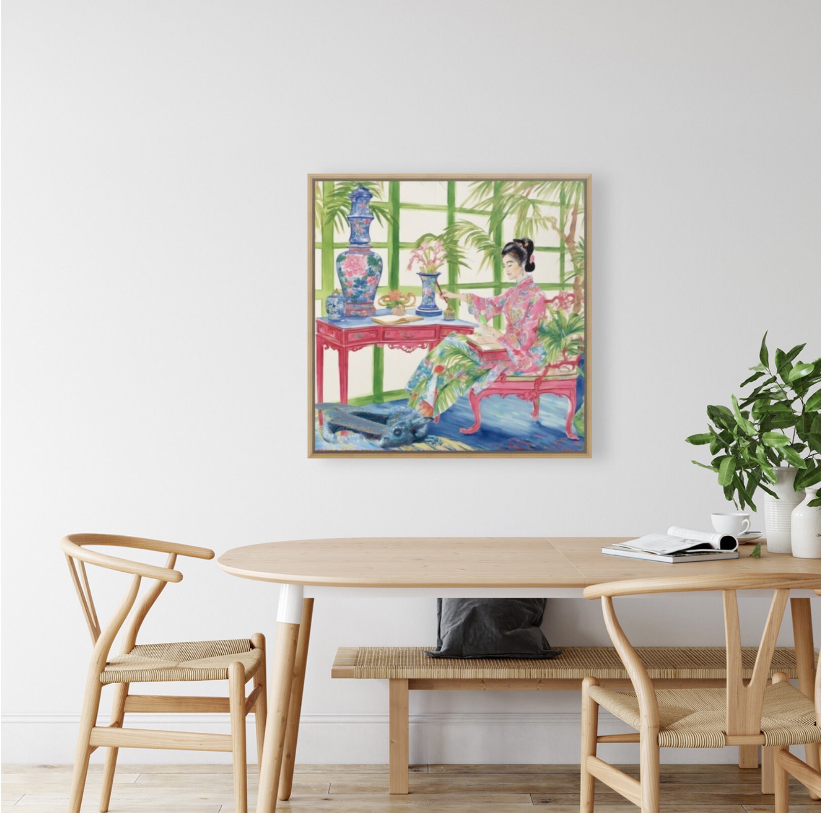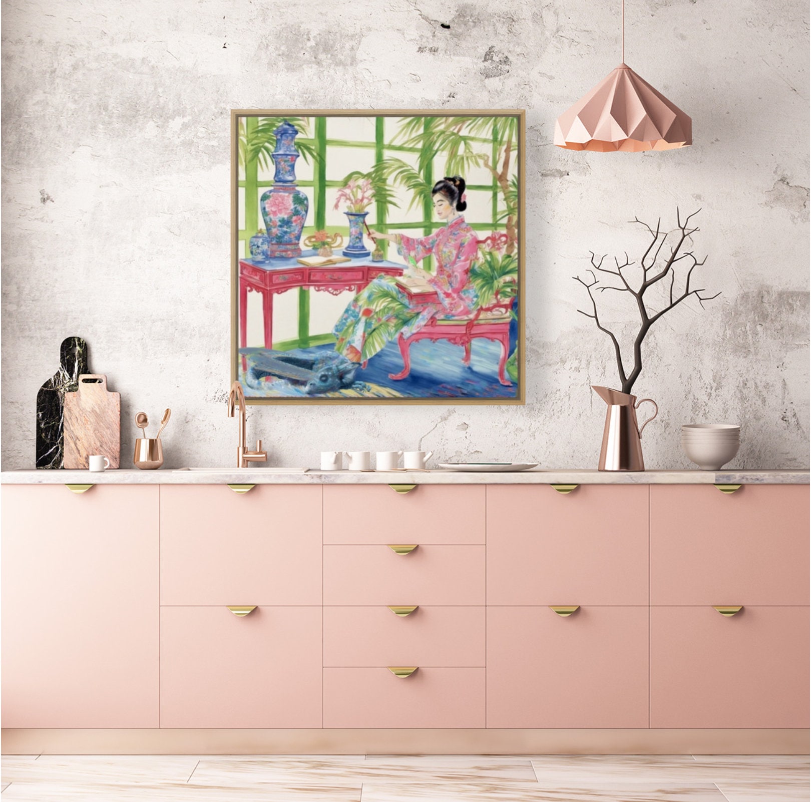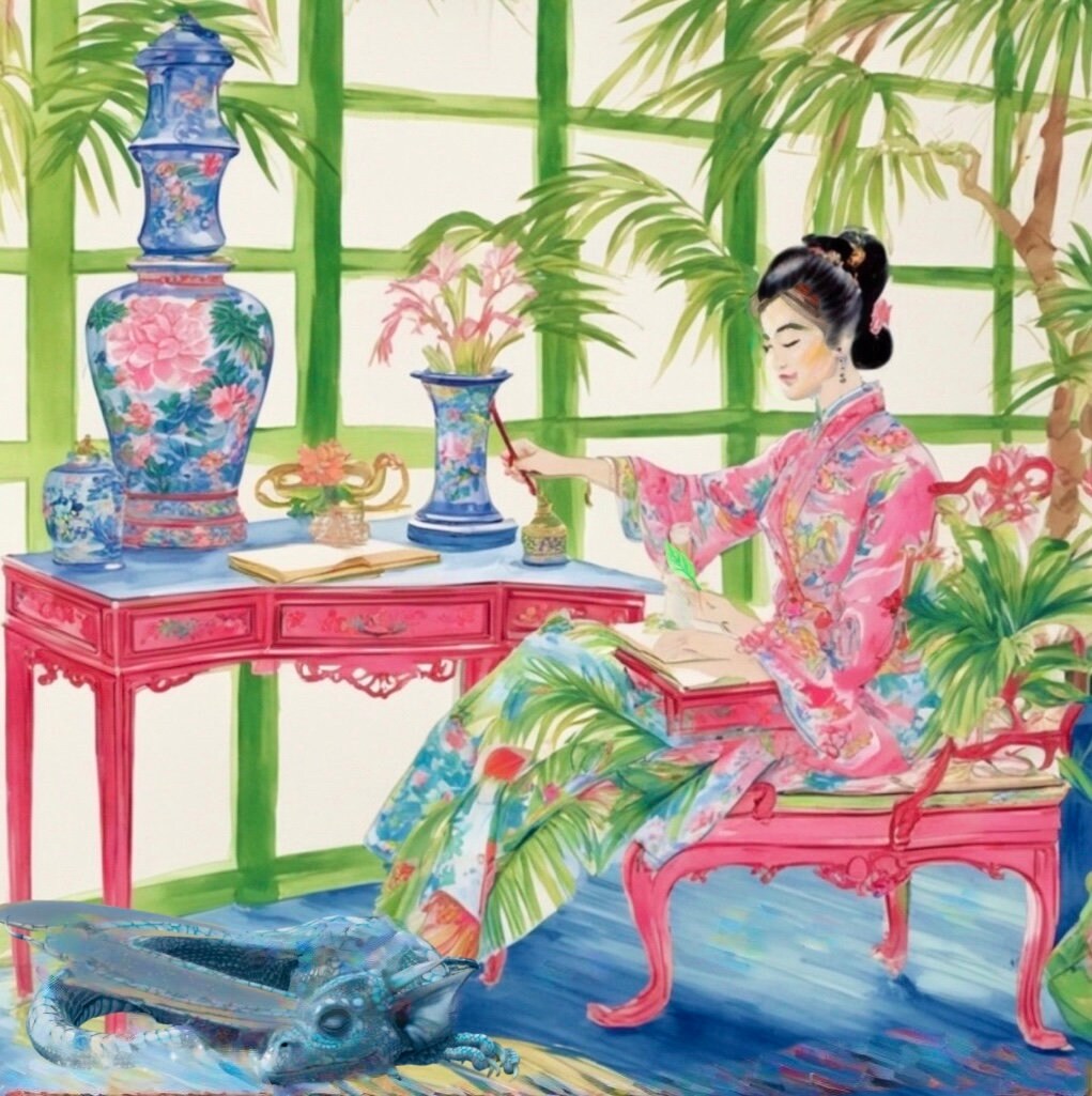 Grandmillennial art, the painter and the sleeping dragon, whimsical chinoiserie giclee print