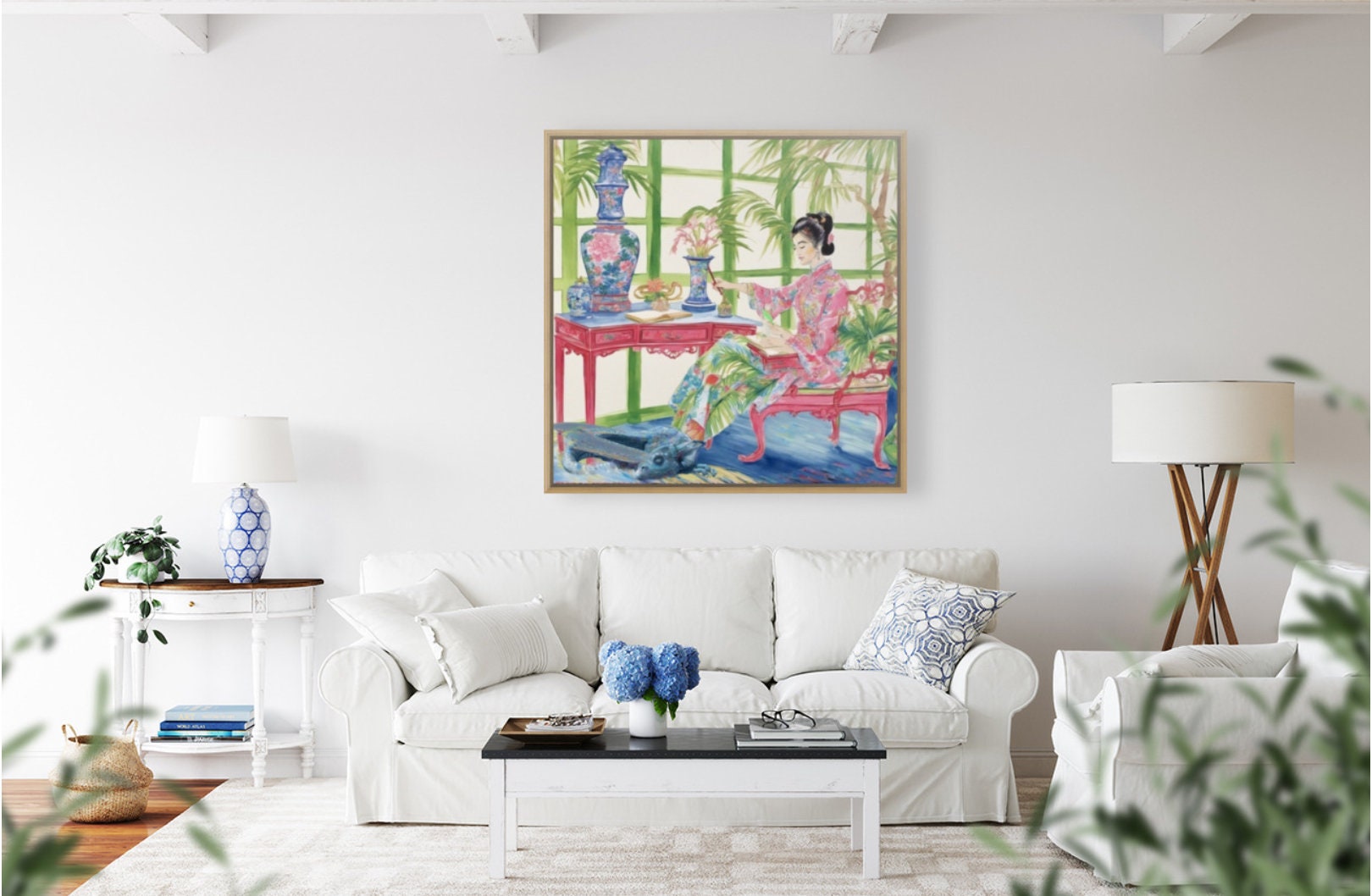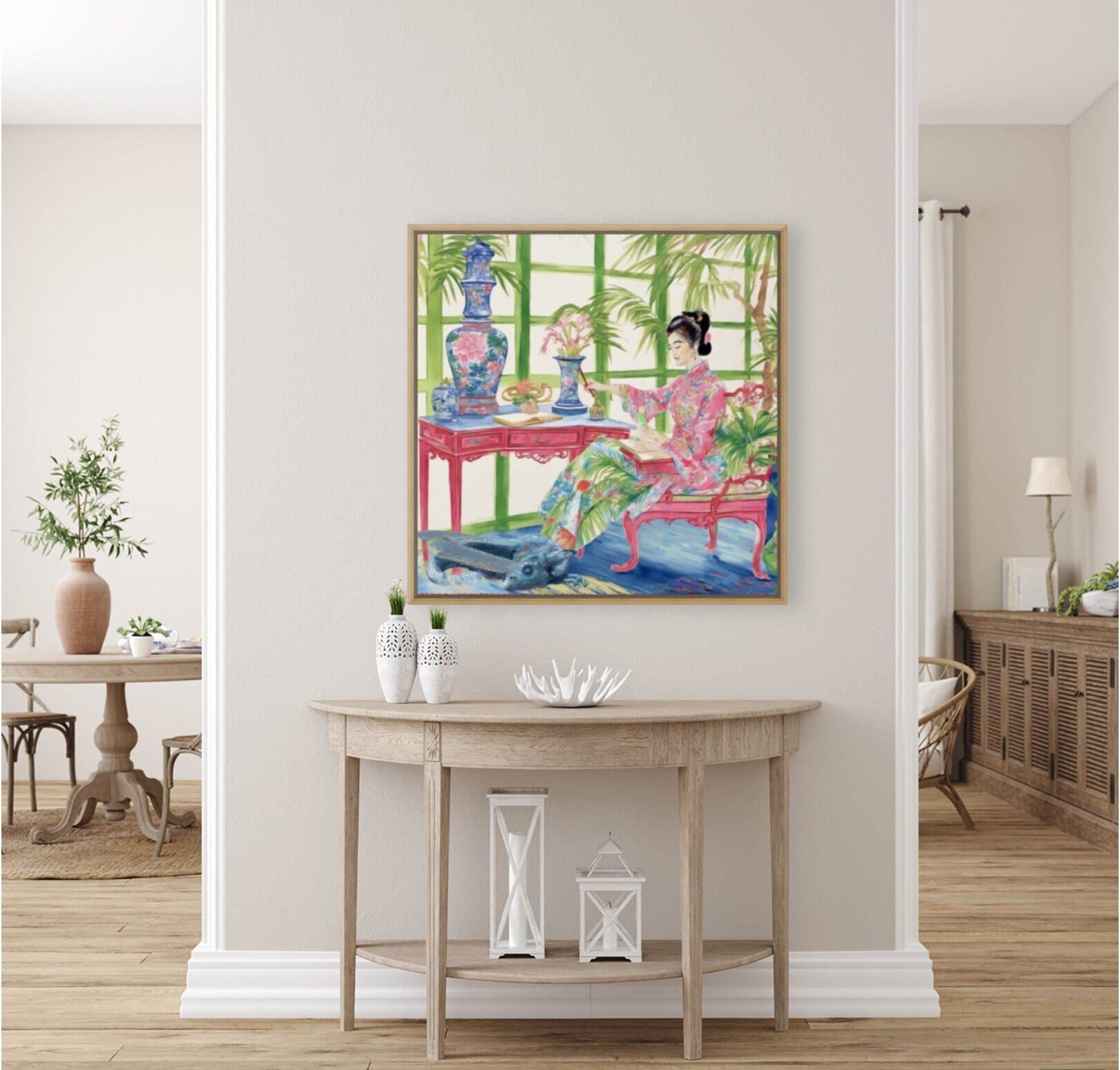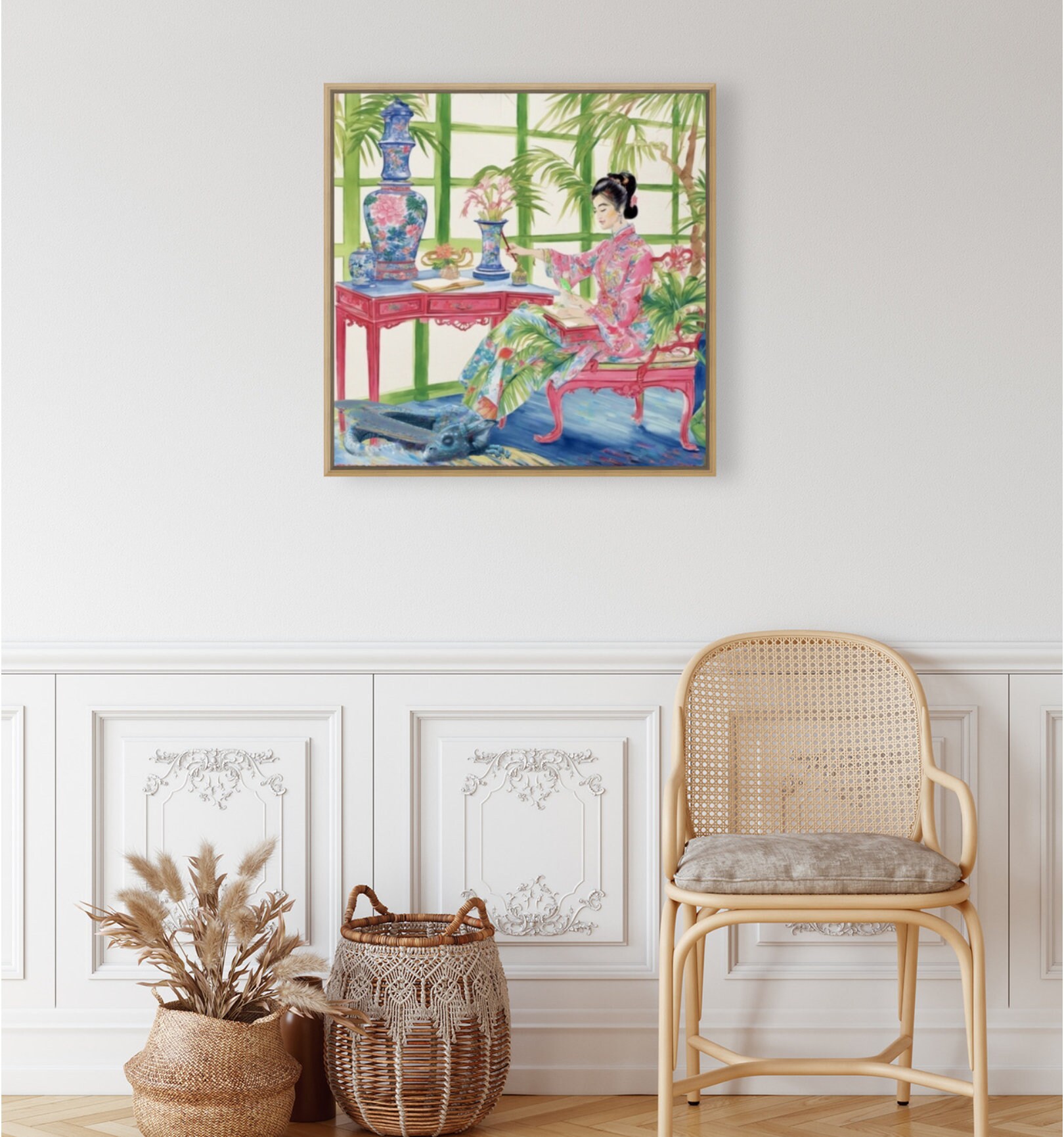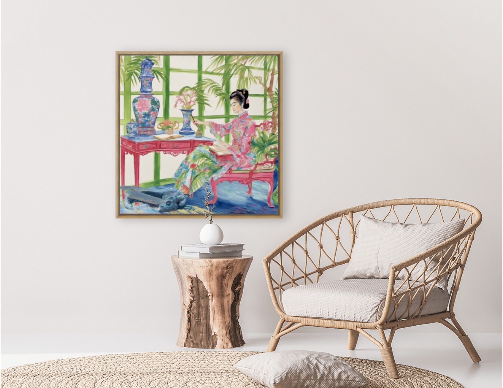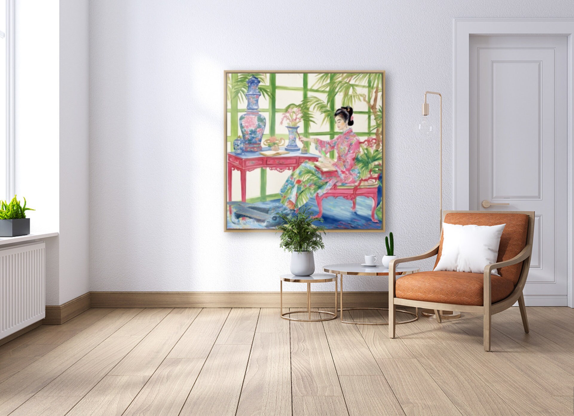 Grandmillennial art, the painter and the sleeping dragon, whimsical chinoiserie giclee print